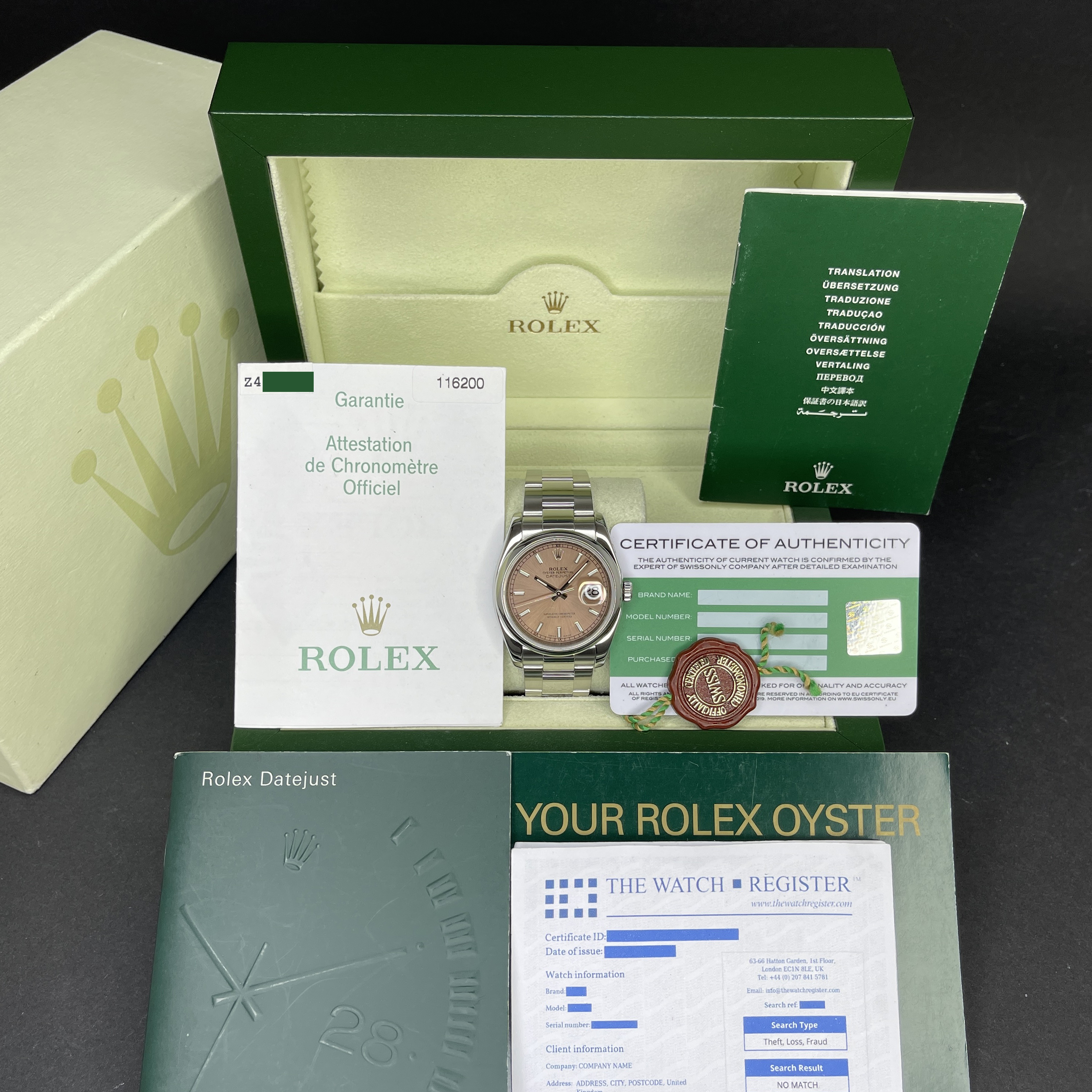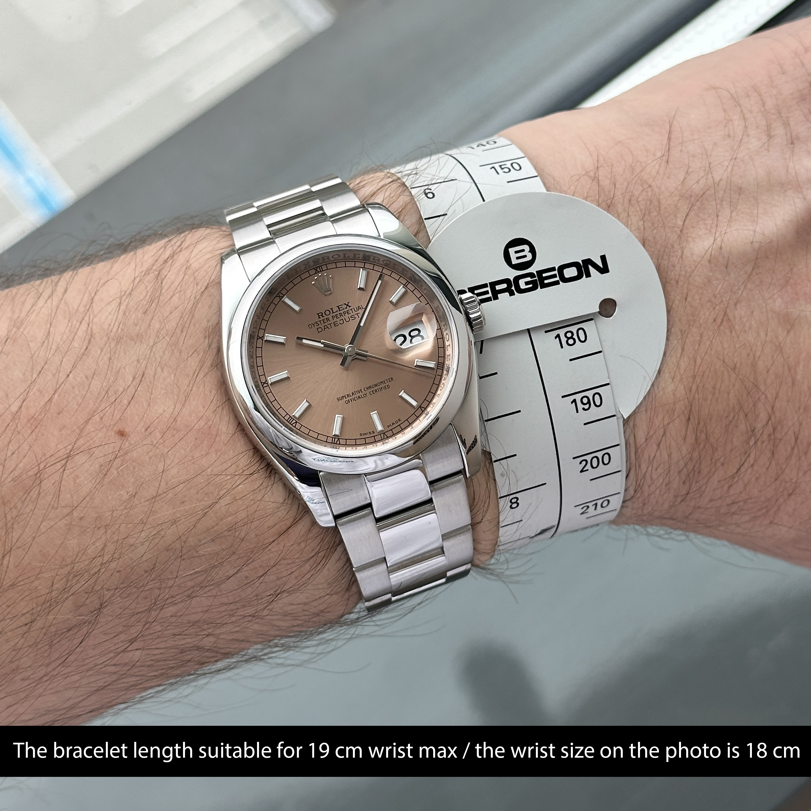 This Rolex Datejust 116200 features a Salmon dial and is crafted from stainless steel, with a production year of 2007.