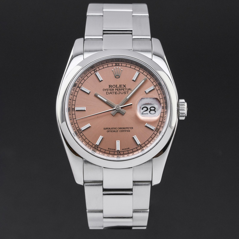 This particular Rolex Datejust introduced in 2007, features a rare salmon-colored dial, offering a warm and refined alternative to more traditional tones. It's soft hue adds personality to the classic stainless steel design, giving it a unique and quietly expressive presence.
