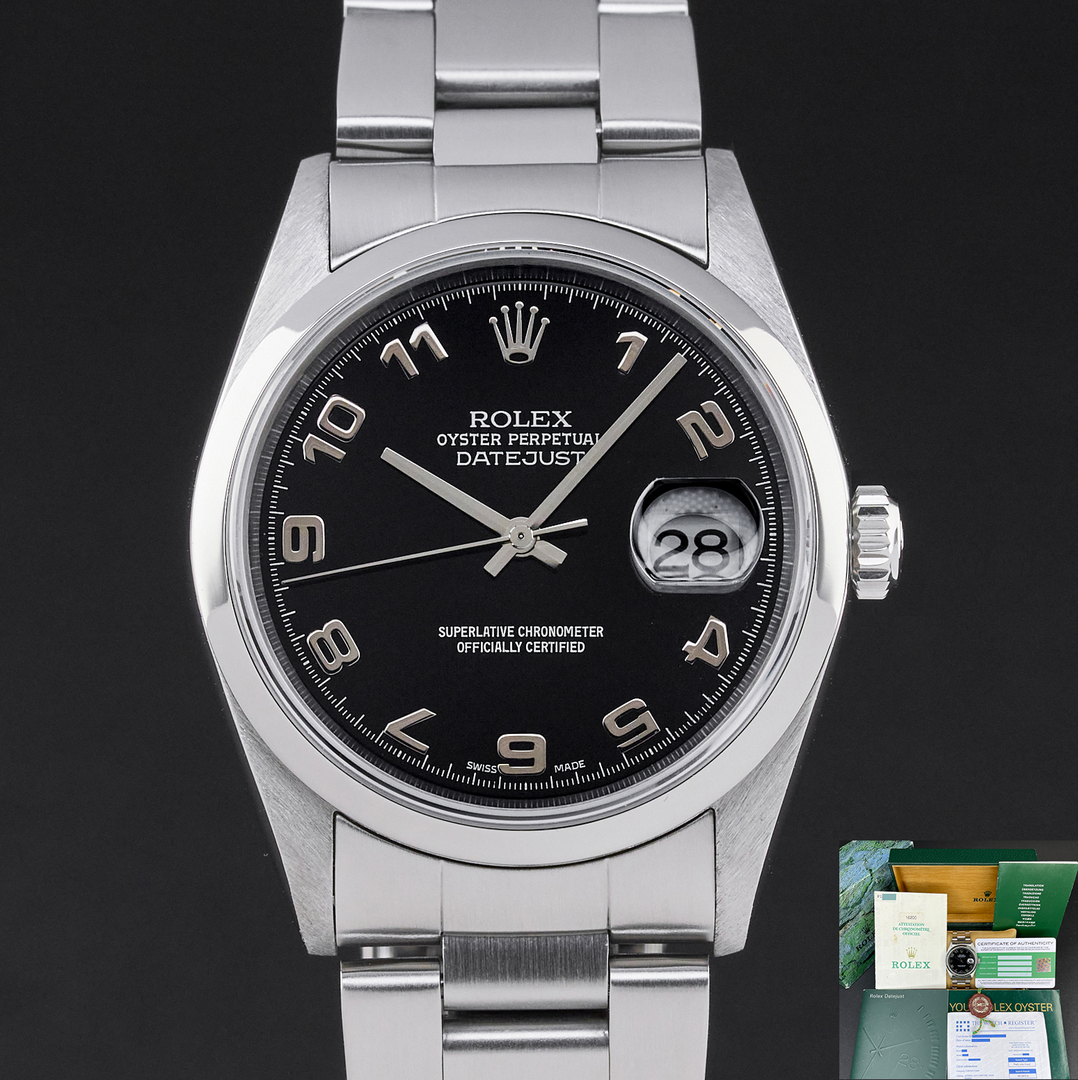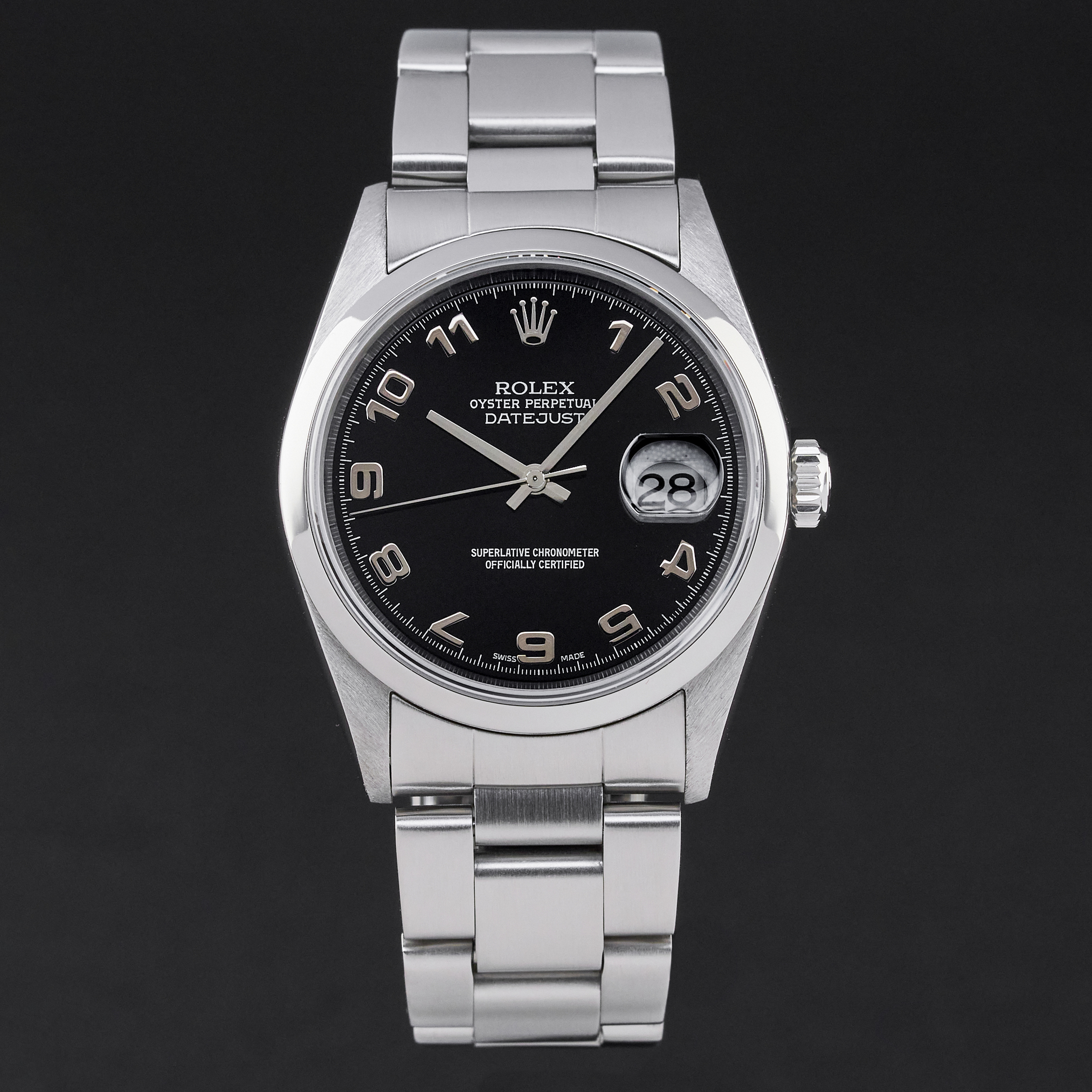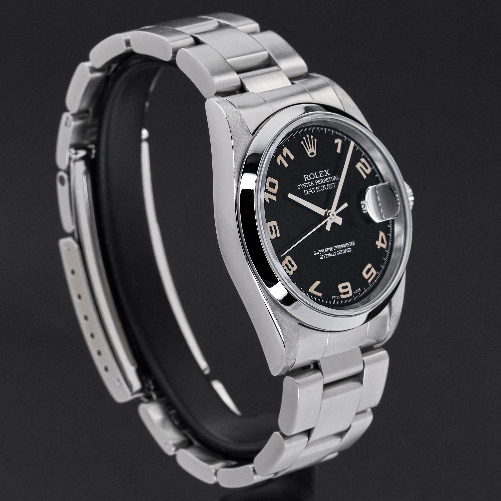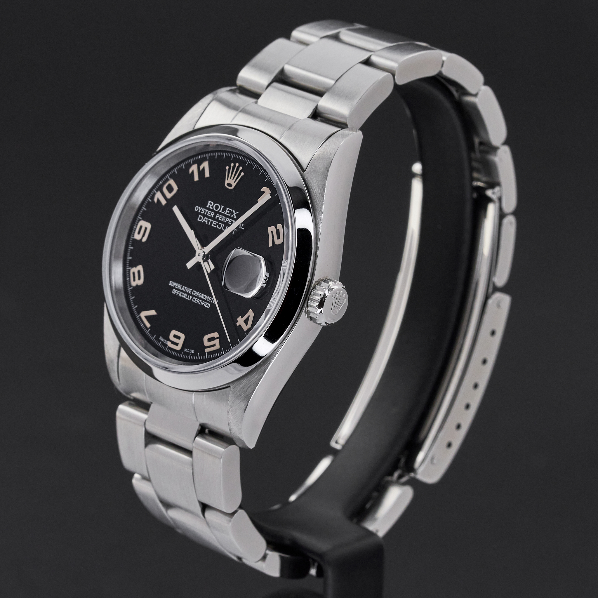This Rolex Datejust 16200 features a Black arabic dial and is crafted from stainless steel, with a production year of 2000.