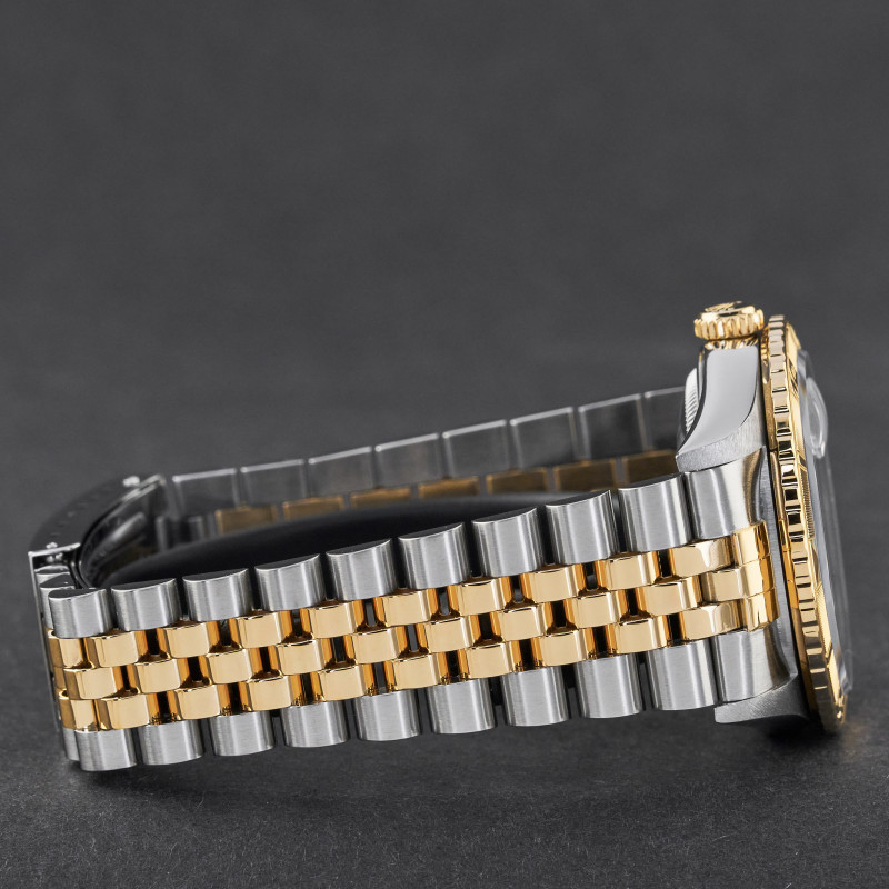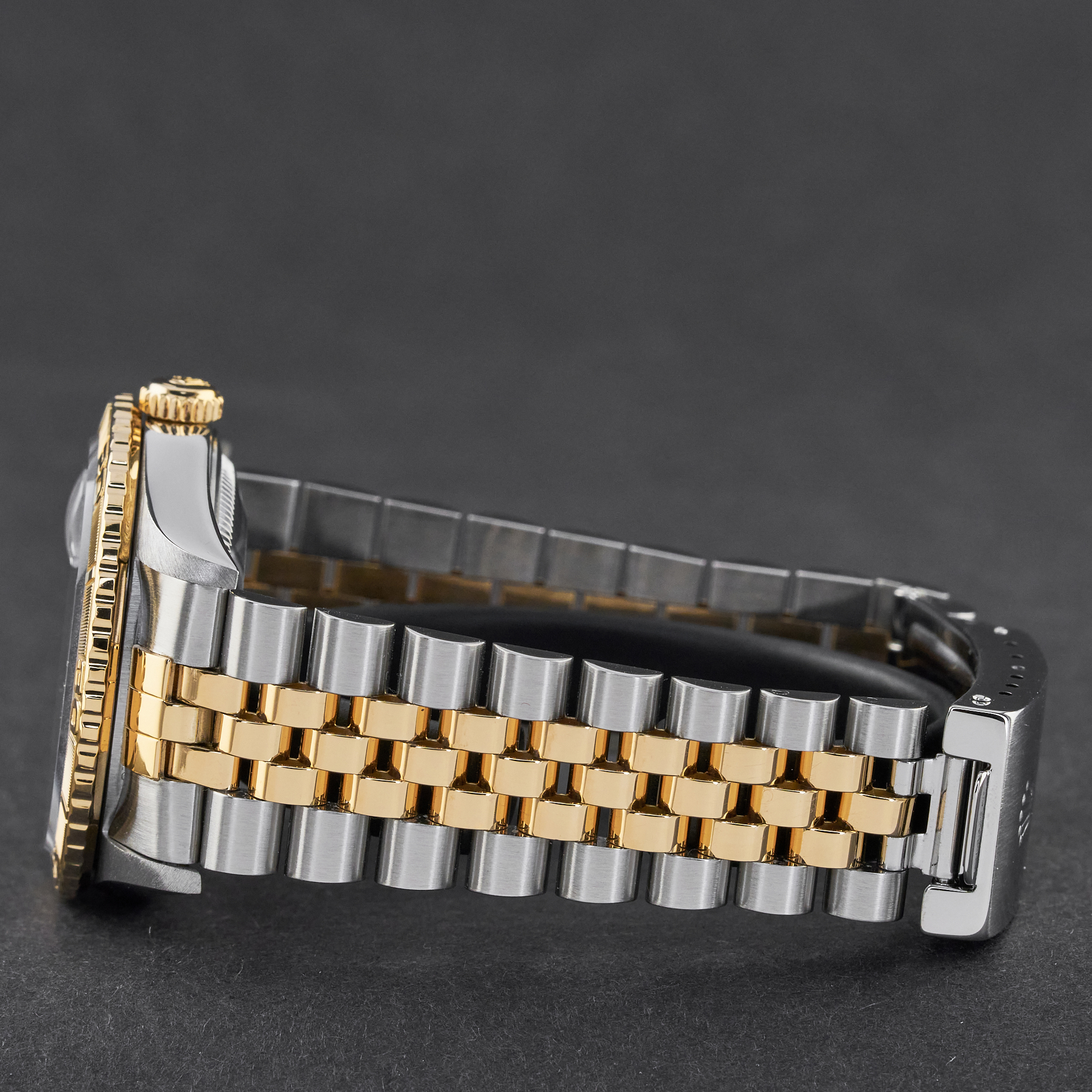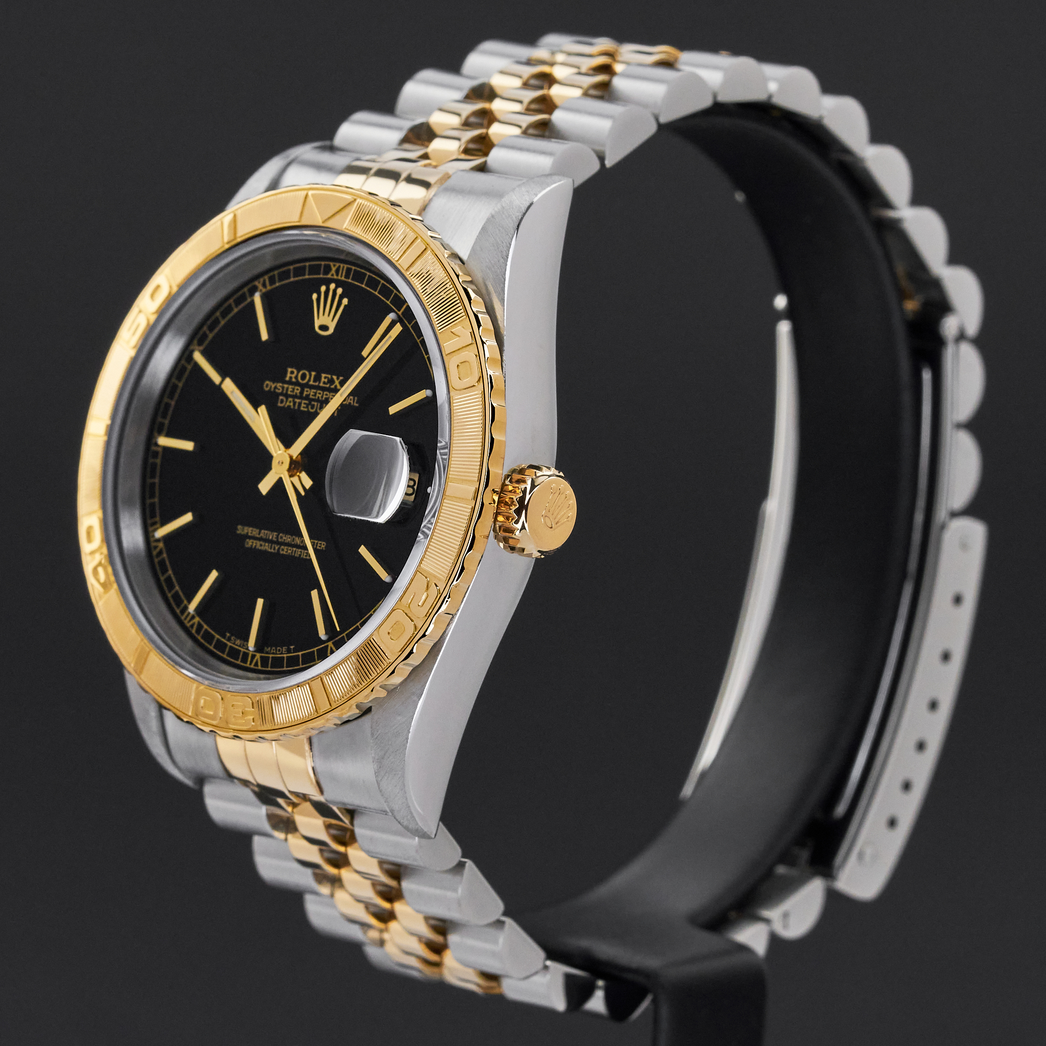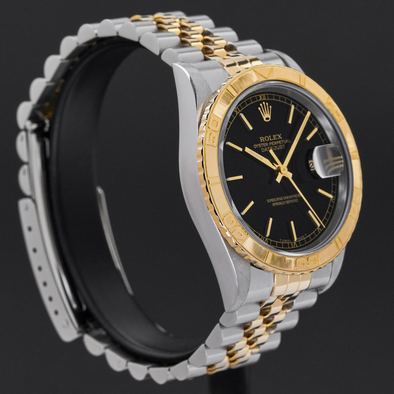 This Rolex Datejust Turn-O-Graph 16263 features a Black dial and is crafted from 18K yellow gold and stainless steel, with a production year of 1997.