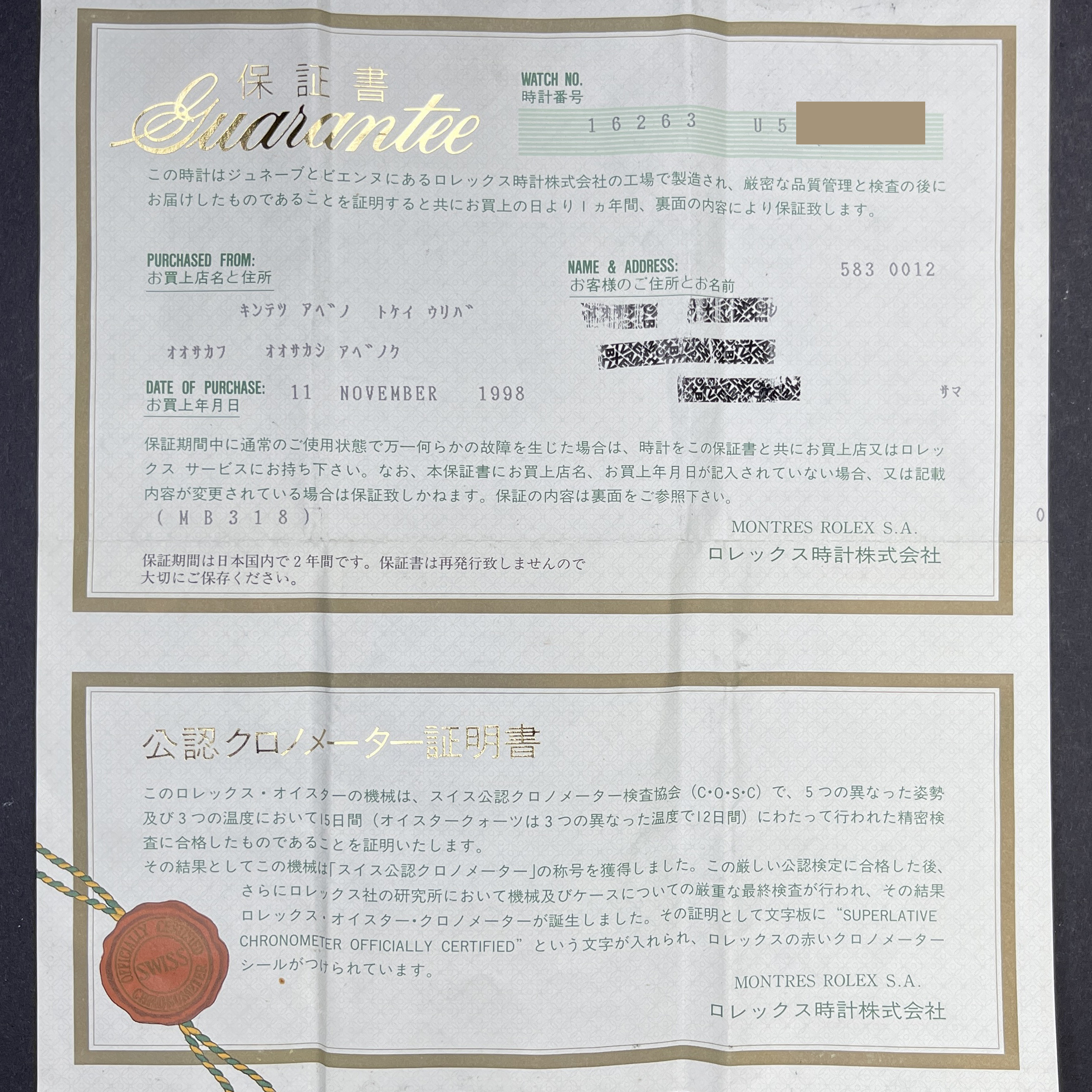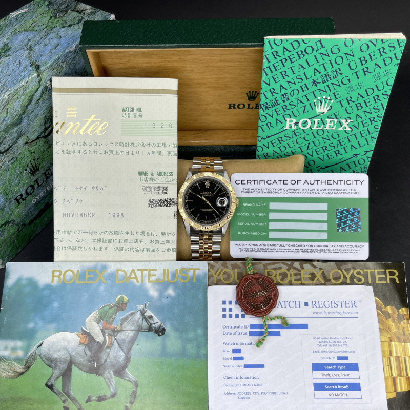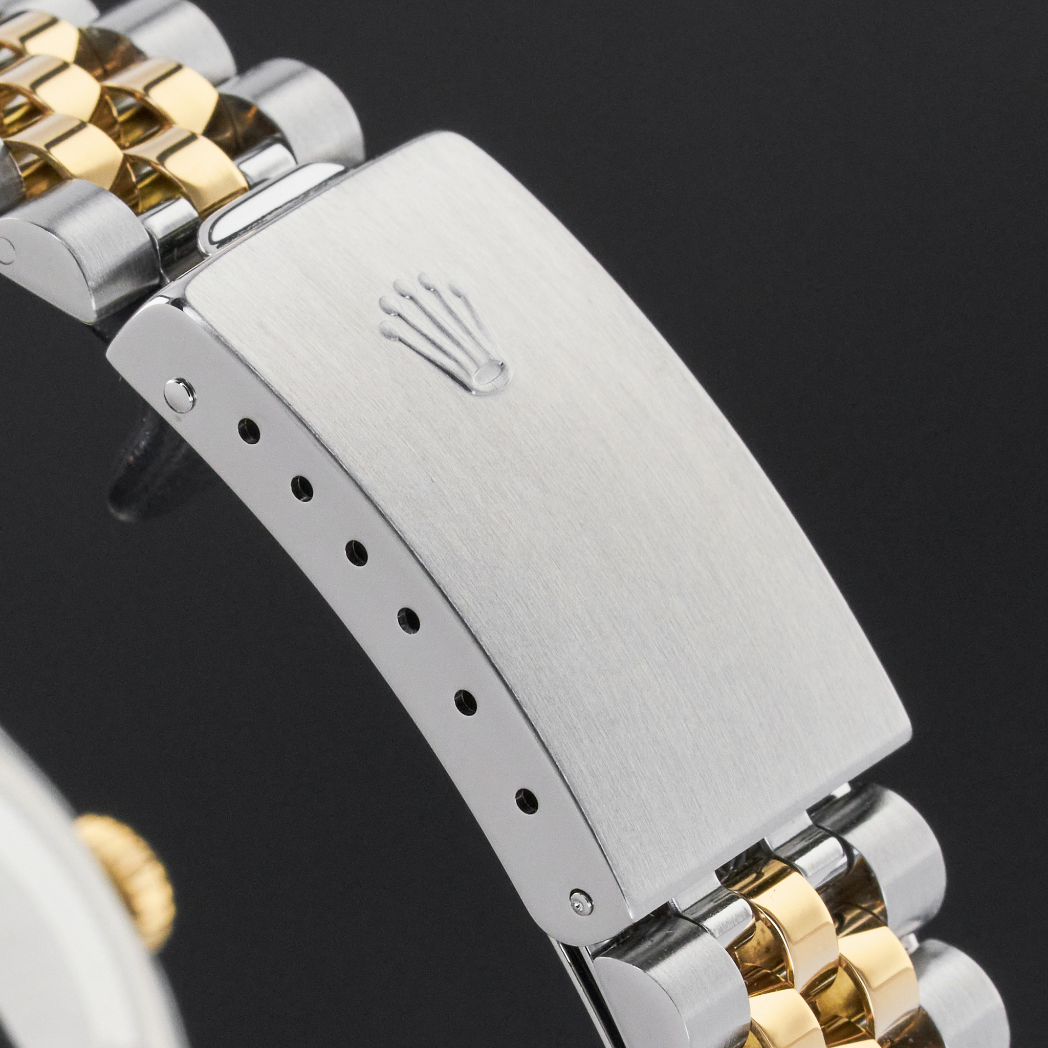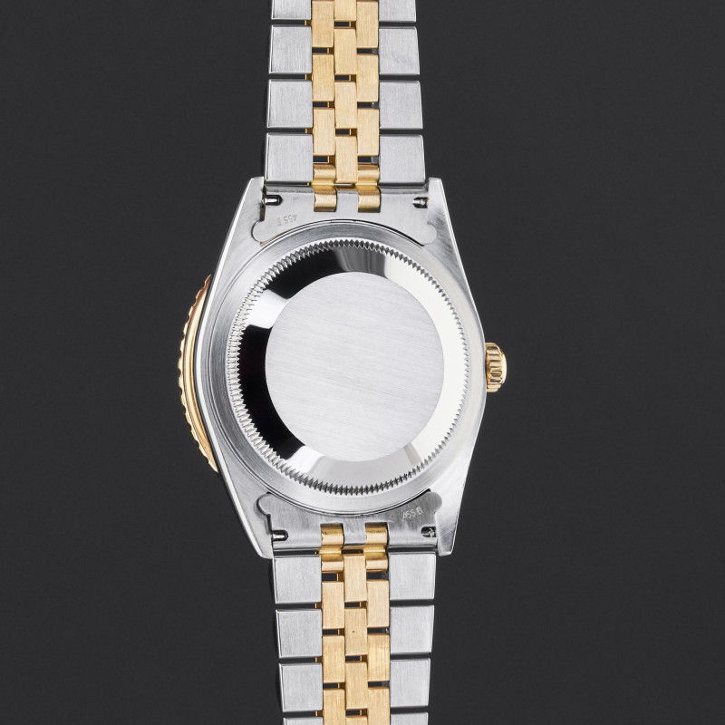 This Rolex Datejust Turn-O-Graph 16263 features a Black dial and is crafted from 18K yellow gold and stainless steel, with a production year of 1997.