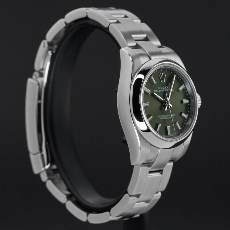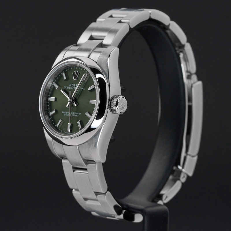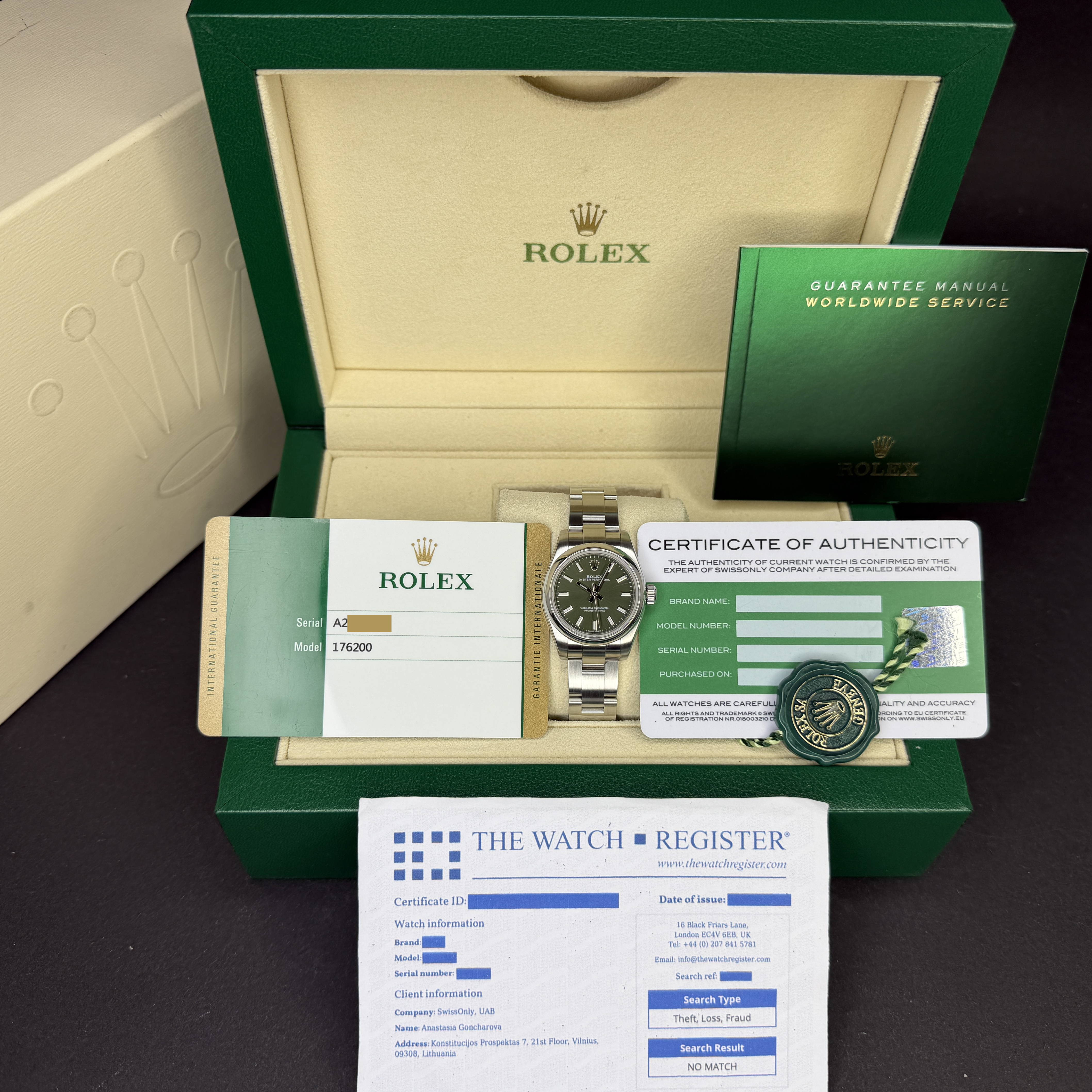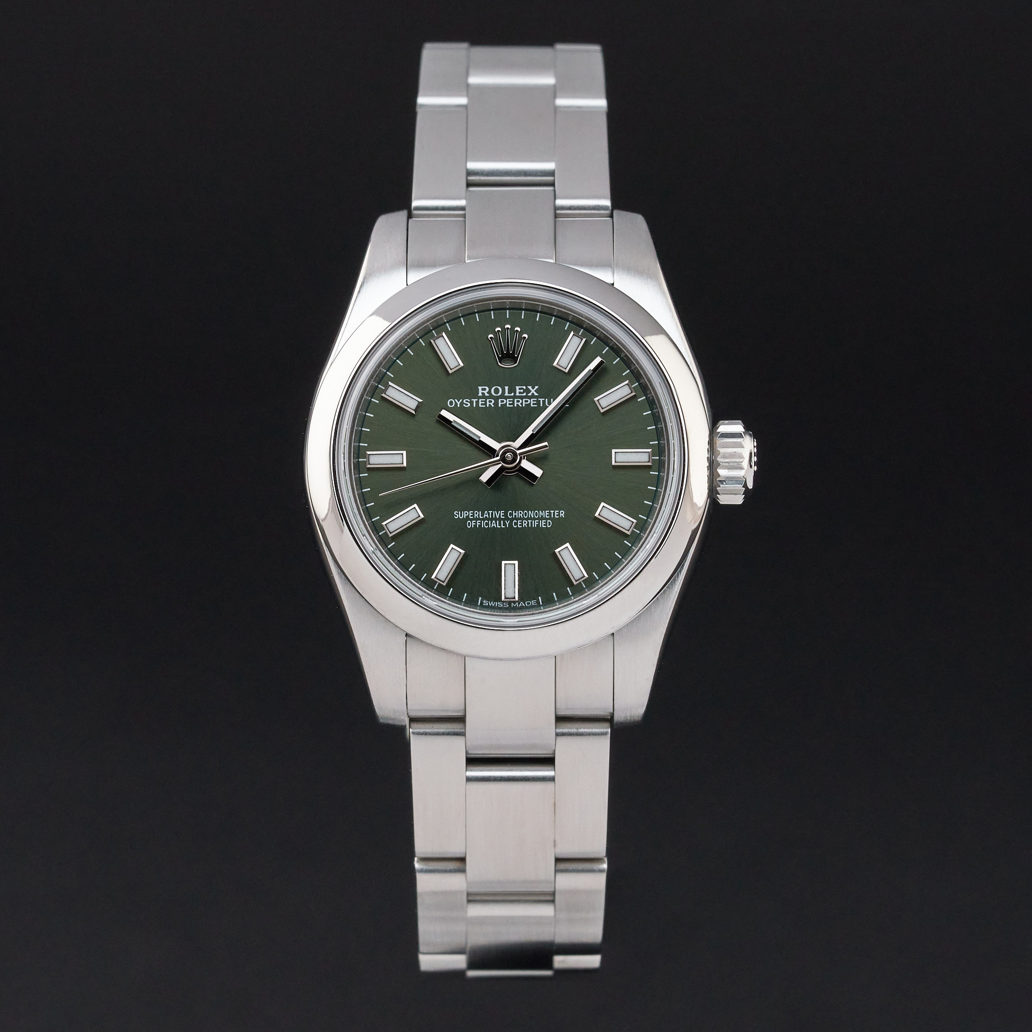 This Rolex Oyster Perpetual Lady 176200 features a Olive dial and is crafted from stainless steel, with a production year of 2017.