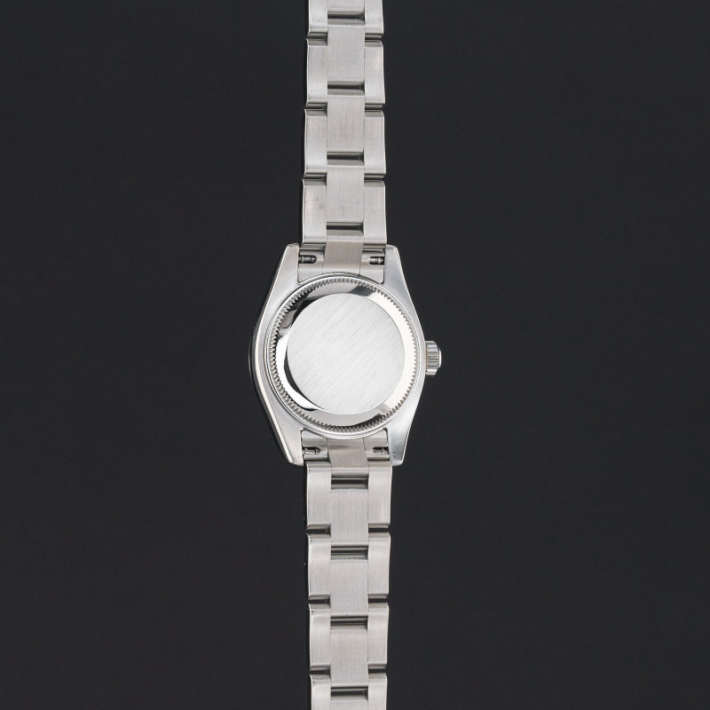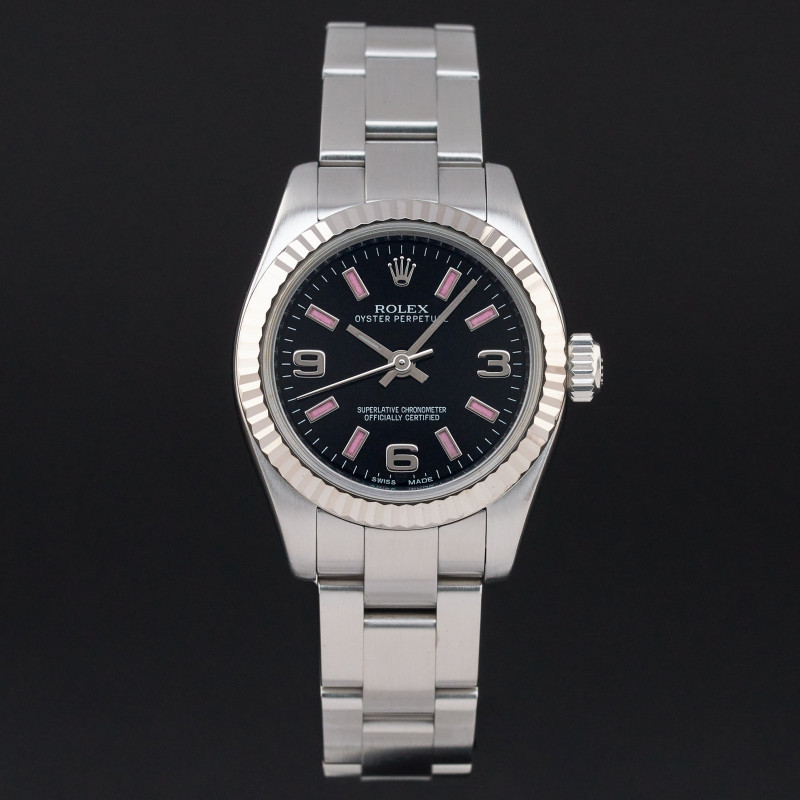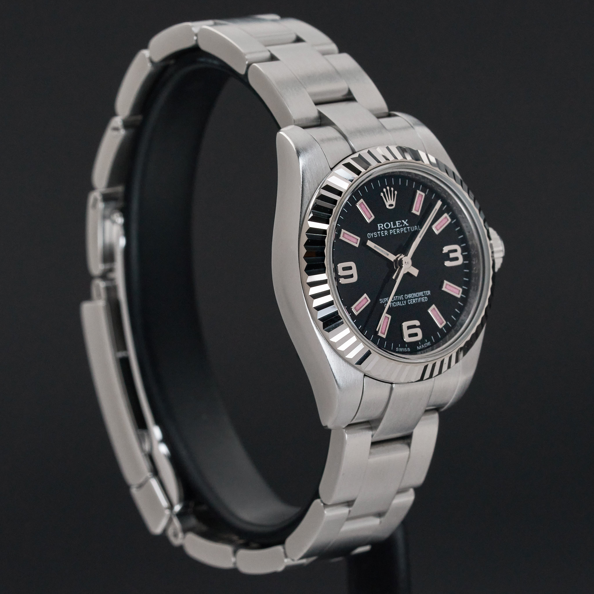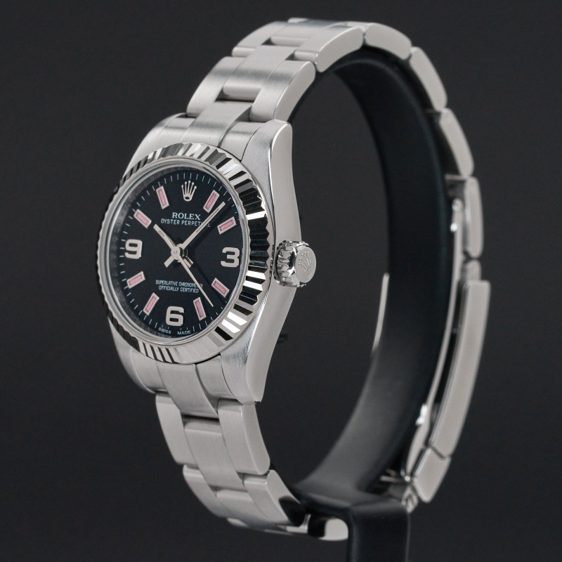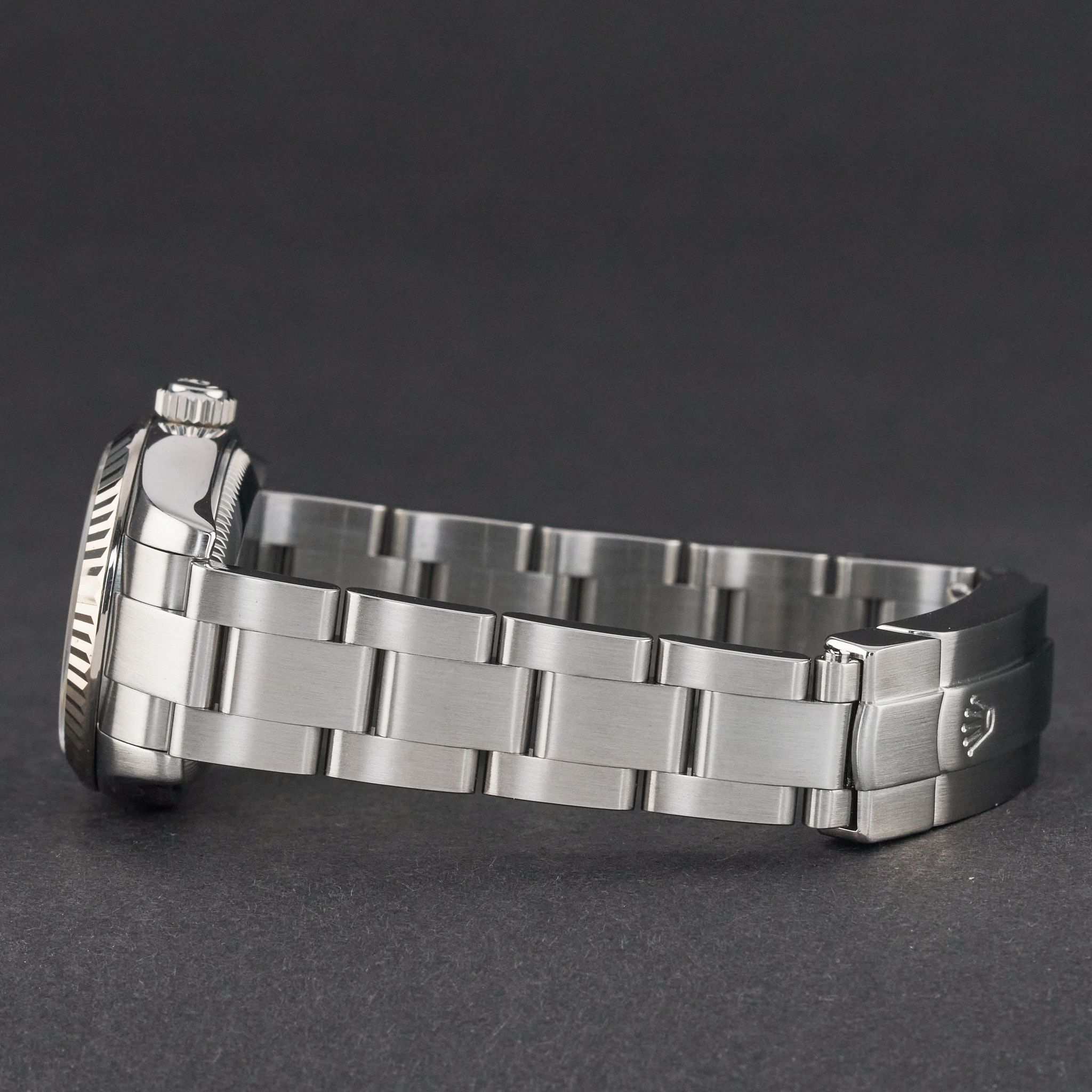 This Rolex Oyster Perpetual Lady 176234 features a Black Arabic dial and is crafted from stainless steel, with a production year of 2013.