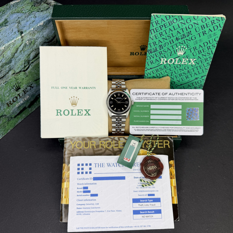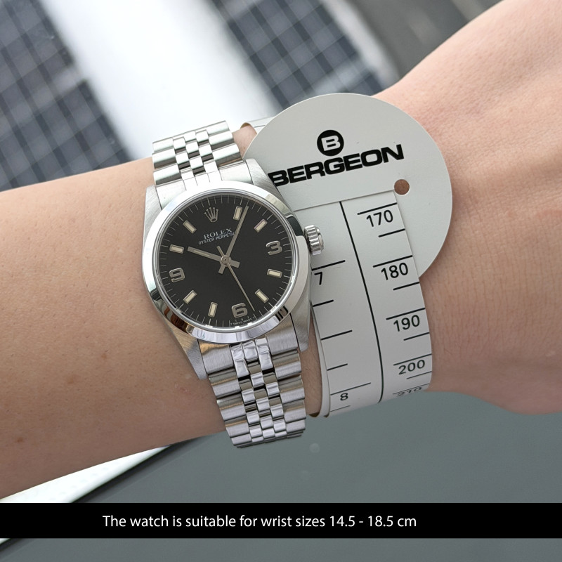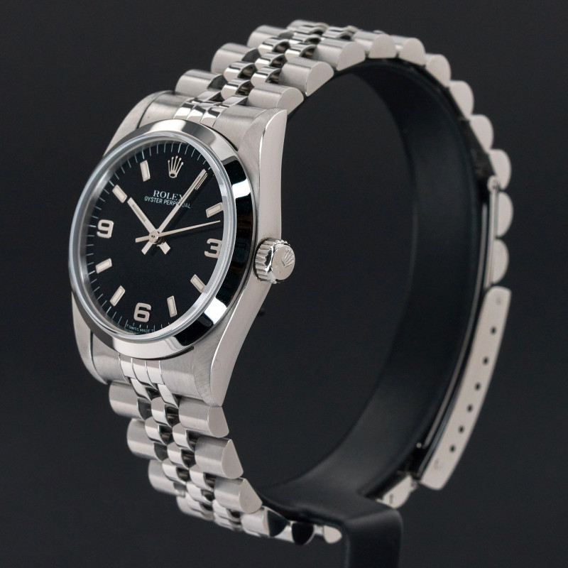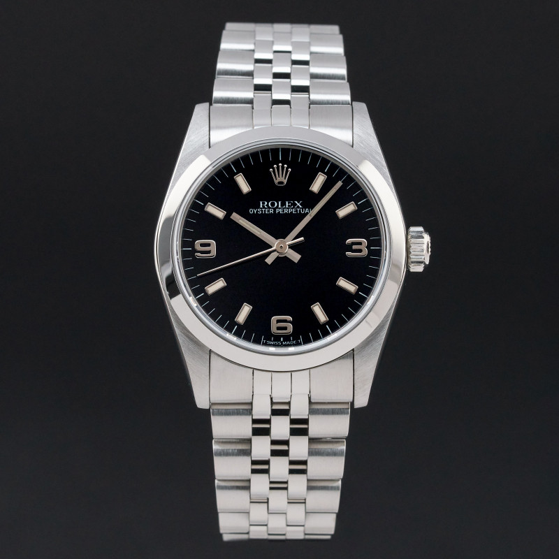 This Rolex Oyster Perpetual 67480 features a Black Arabic dial and is crafted from stainless steel, with a production year of 1996.