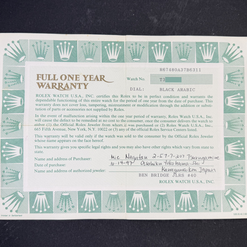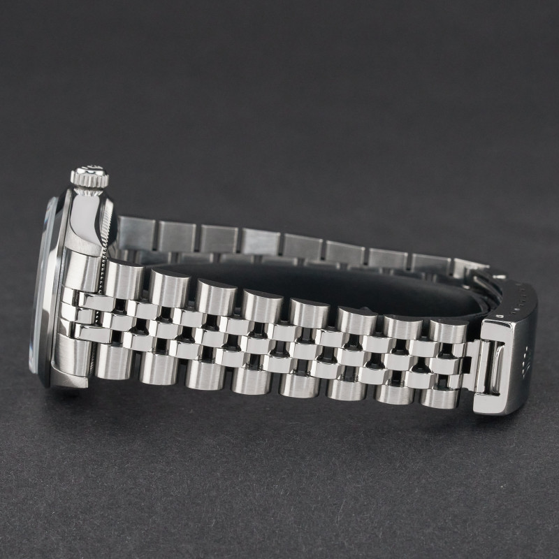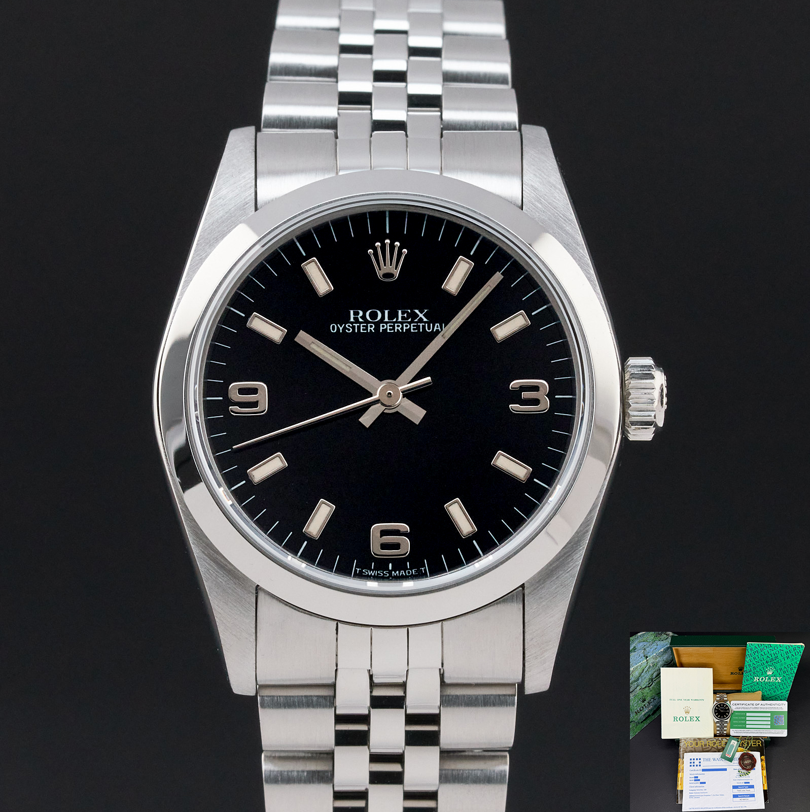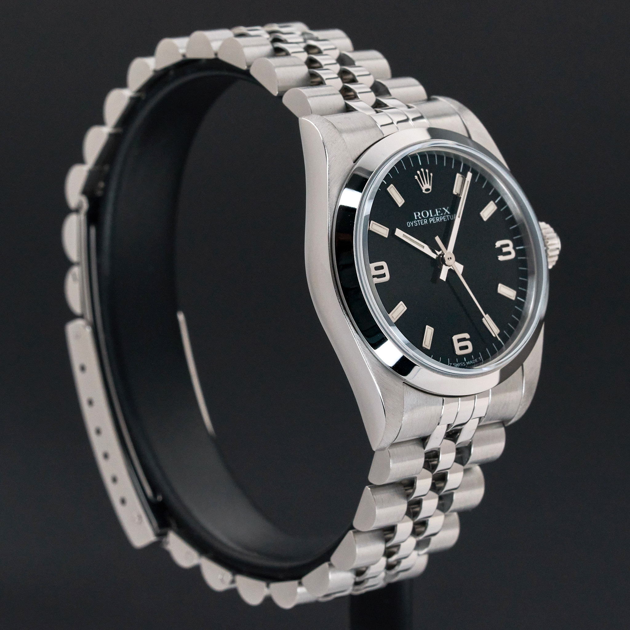This Rolex Oyster Perpetual 67480 features a Black Arabic dial and is crafted from stainless steel, with a production year of 1996.