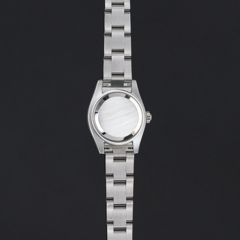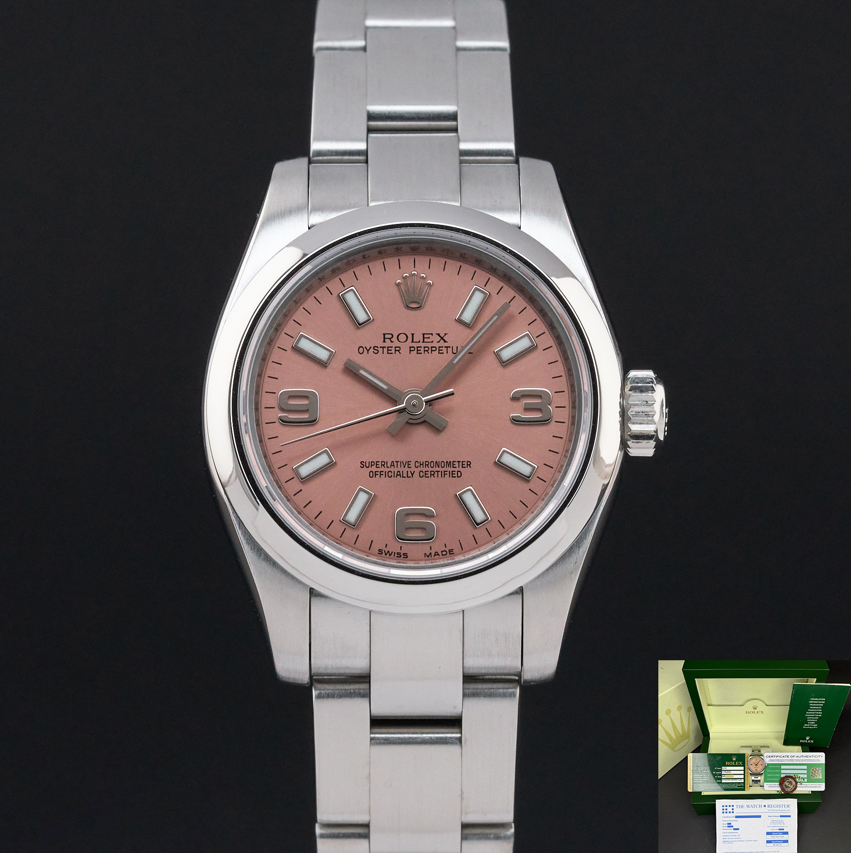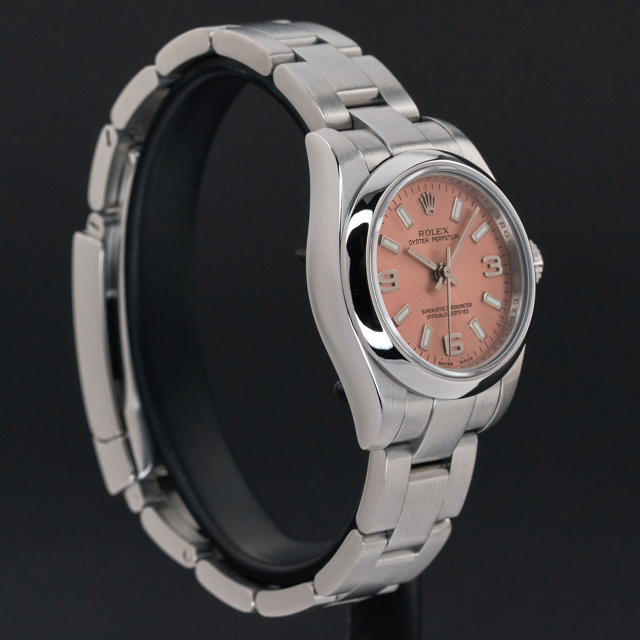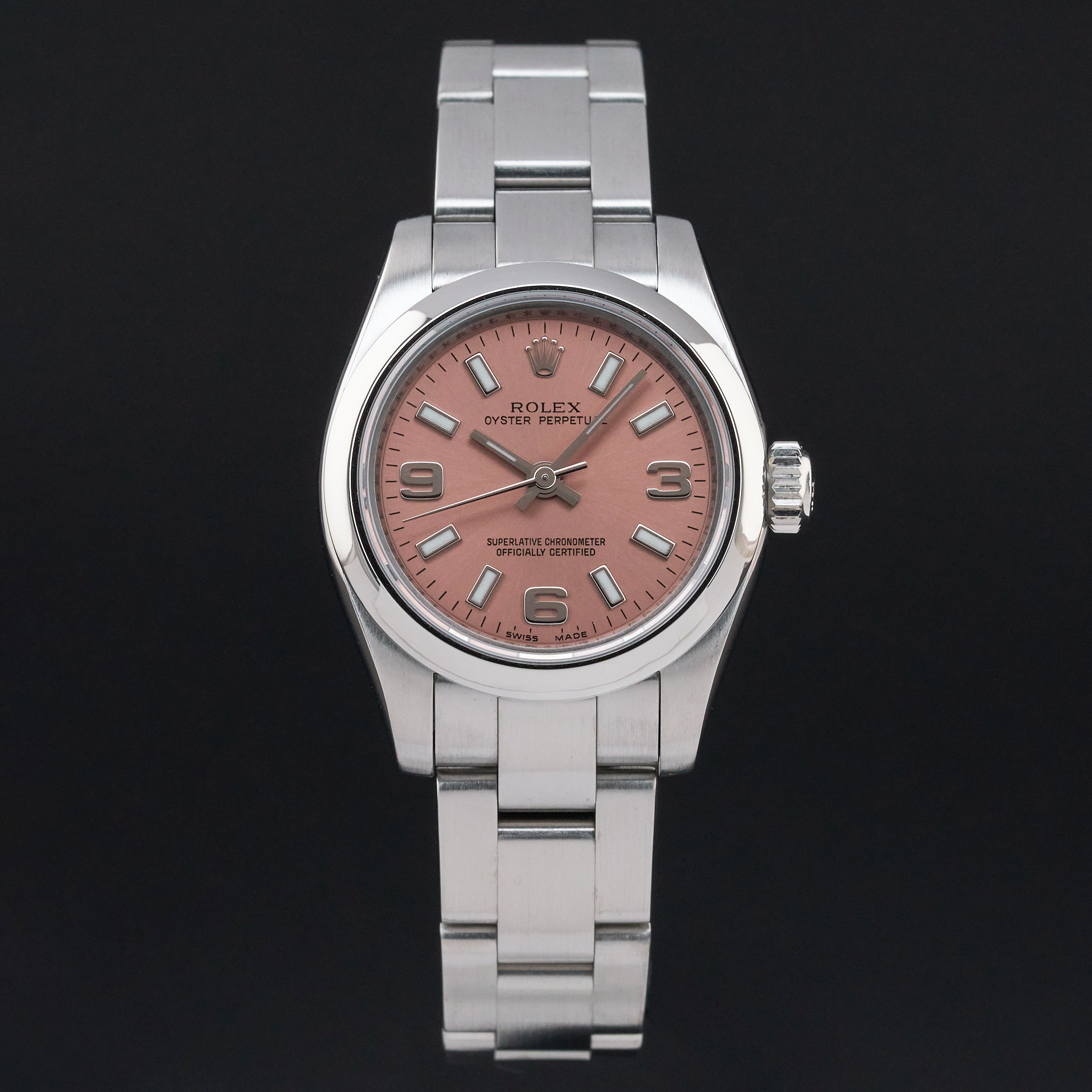 This Rolex Oyster Perpetual Lady 176200 features a Salmon Arabic dial and is crafted from stainless steel, with a production year of 2008.