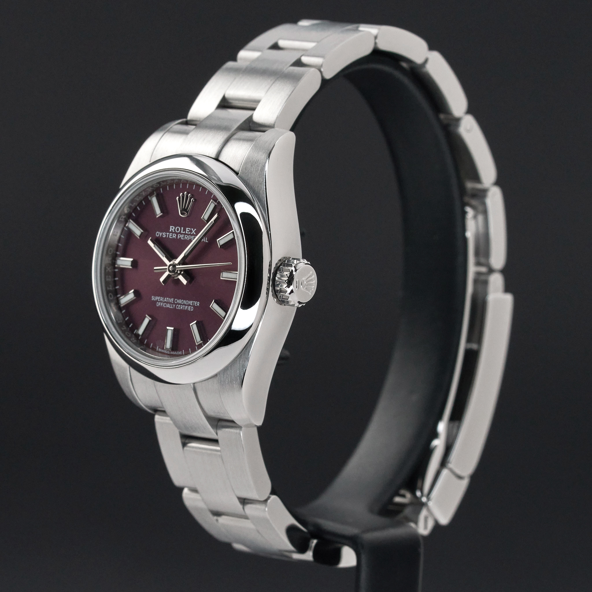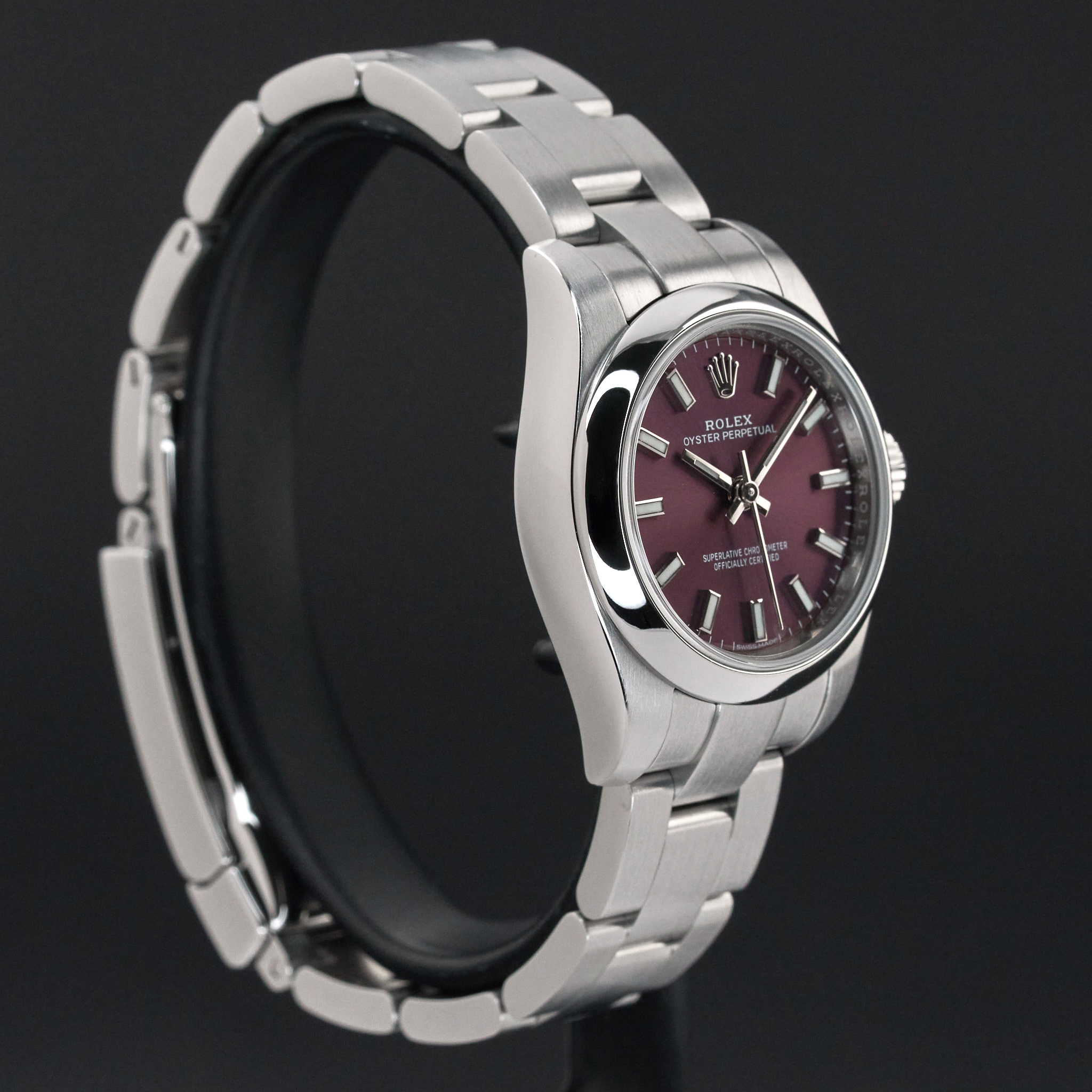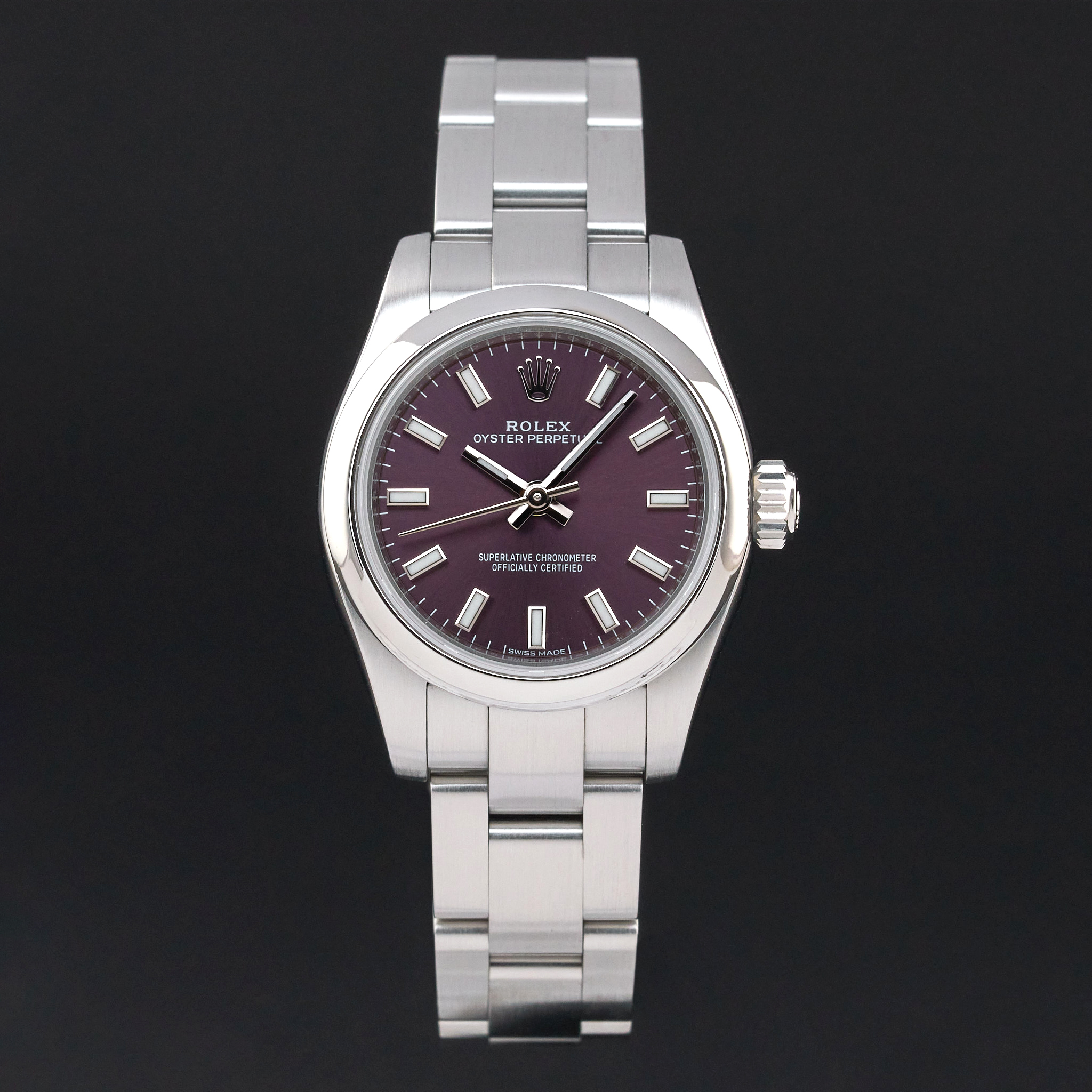 This Rolex Oyster Perpetual Lady 176200 features a Red grape dial and is crafted from stainless steel, with a production year of 2018.