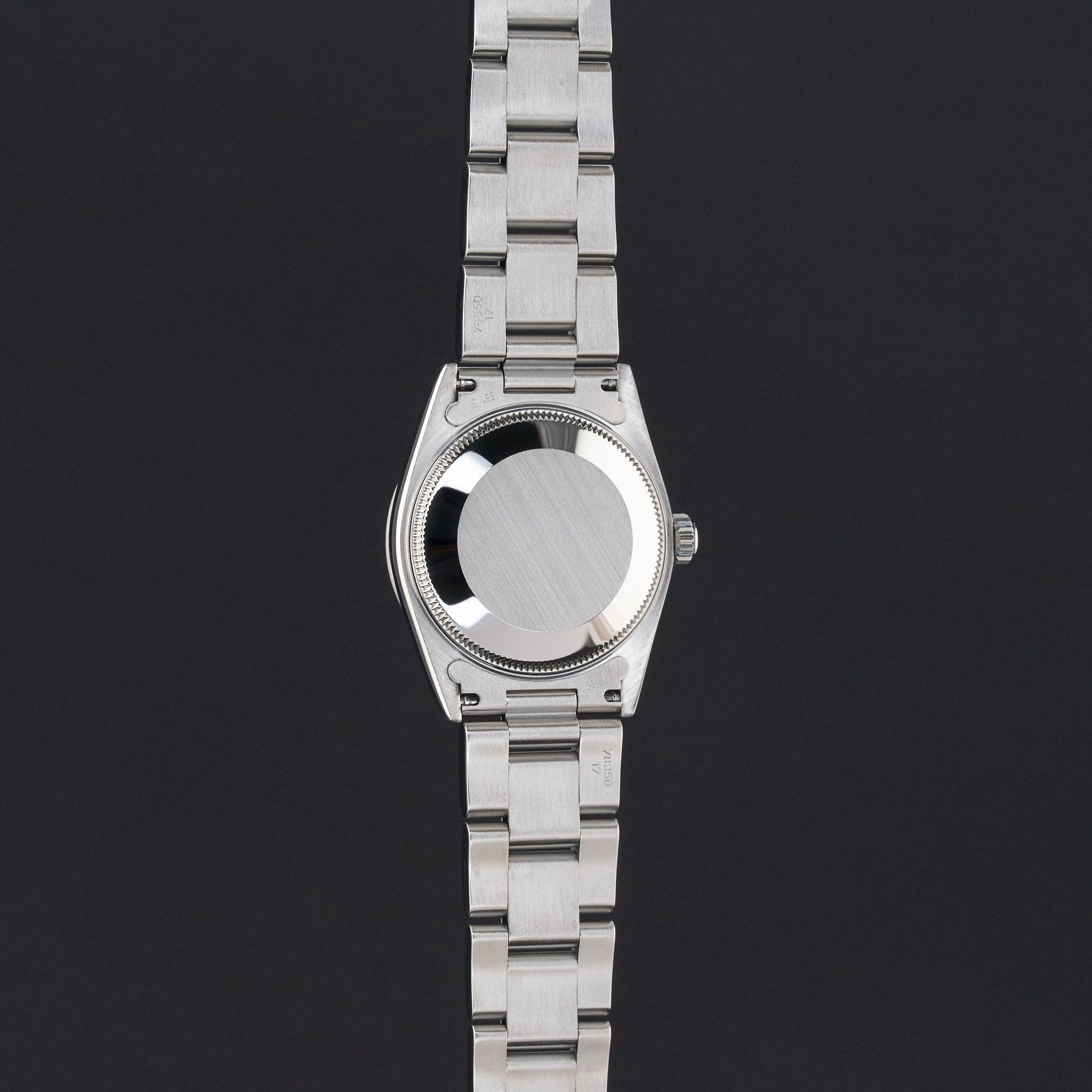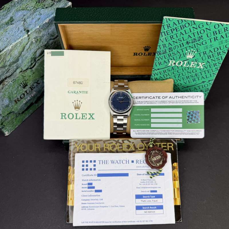 This Rolex Oyster Perpetual Lady 67480 features a Blue dial and is crafted from stainless steel, with a production year of 1998.