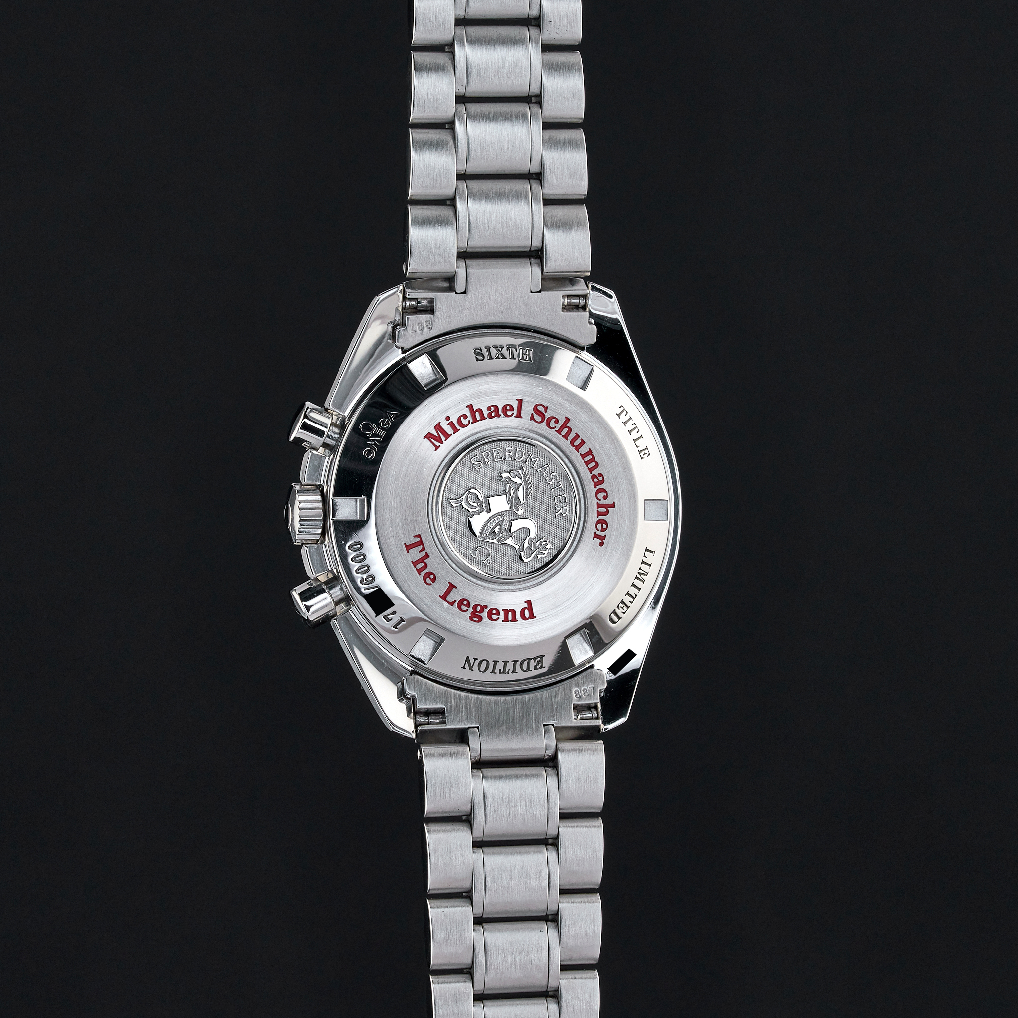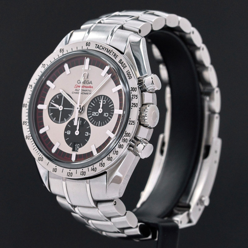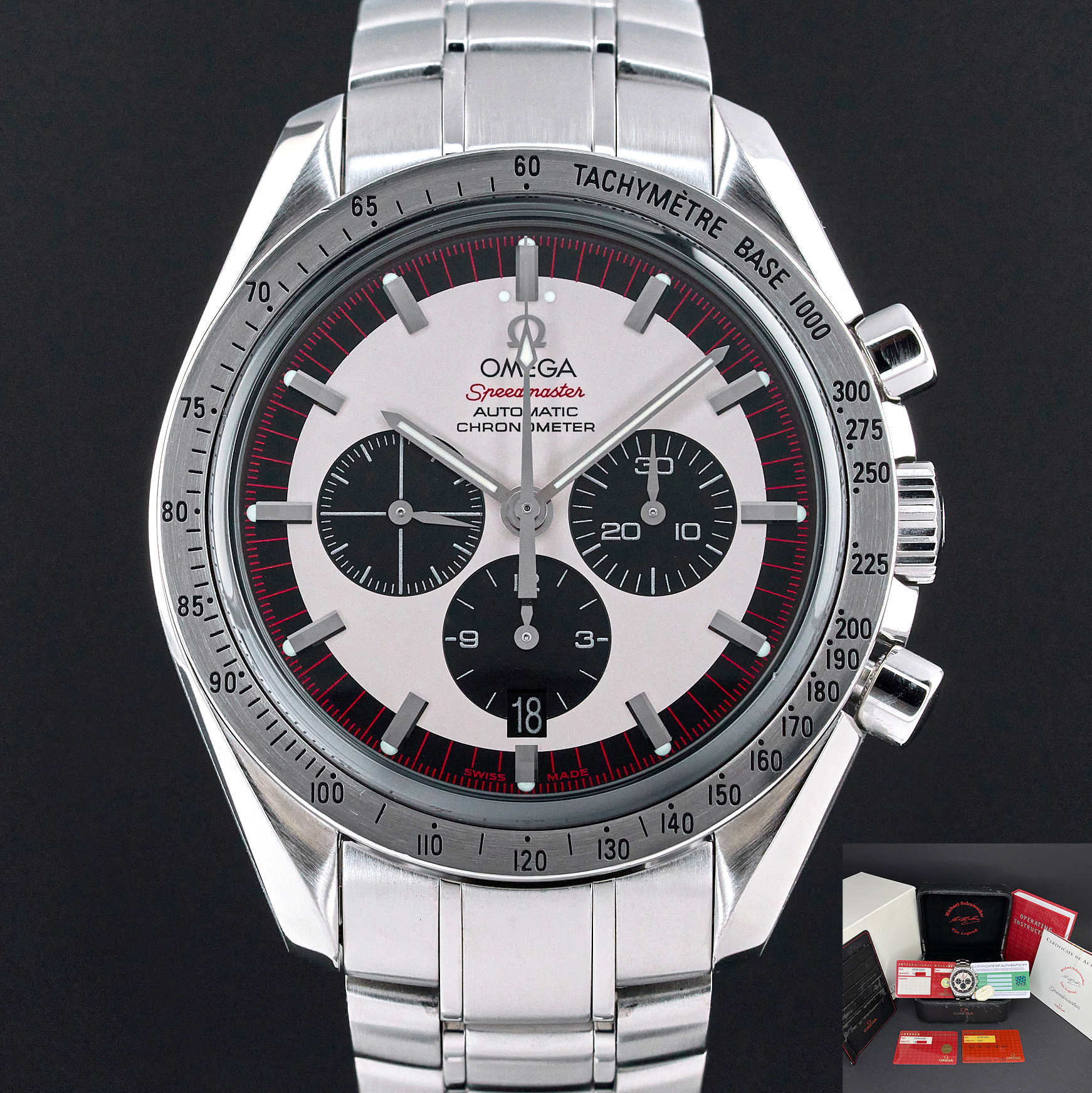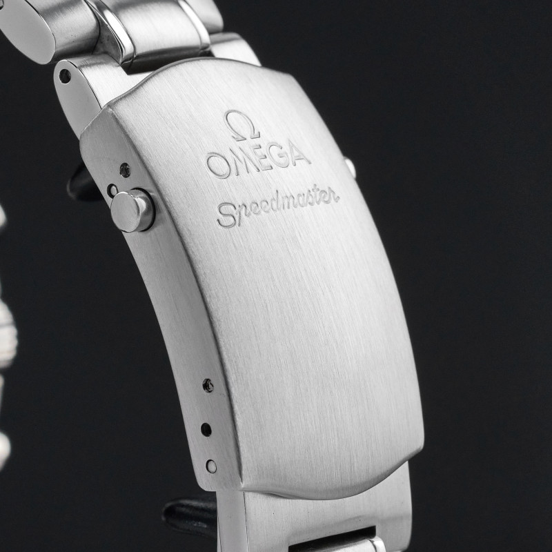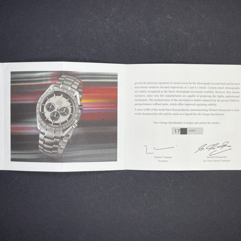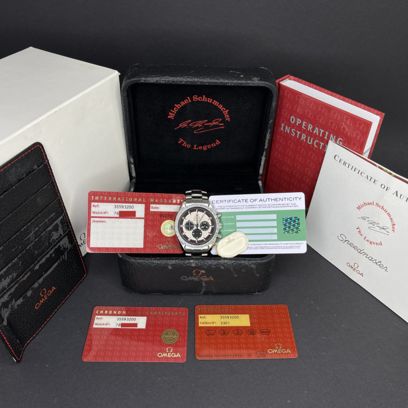 The Omega 3559.3200, also known as the Schumacher Legend, is a striking timepiece that captures the essence of both elegance and performance. Featuring a classic white dial, this watch is distinguished by its three black sub-dials, earning it the nickname "Panda." This contrasting design not only enhances readability but also adds a timeless and sporty appeal to the watch, making it a favorite among collectors and enthusiasts. The dial is meticulously crafted with a smooth, crisp white background that serves as the perfect canvas for the bold black sub-dials positioned at 3, 6, and 9 o'clock. Each sub-dial is finely detailed, with precise markings and hands that ensure accurate timekeeping and functionality. The minute track around the outer rim of the dial is clearly demarcated, further aiding in the watch's legibility. Luminous hands and indices enhance visibility in low-light conditions. Encased in robust stainless steel, the dial is protected by a scratch-resistant sapphire crystal, ensuring durability. The case back proudly displays a special red engraving, signed "Michael Schumacher The Legend", that pays tribute to the legendary Formula 1 driver Michael Schumacher. Overall, the Omega 3559.3200's dial is a harmonious blend of style, precision, and homage to racing history, making it a standout piece in the Omega Speedmaster collection.