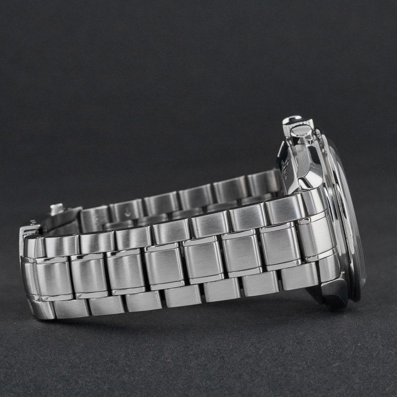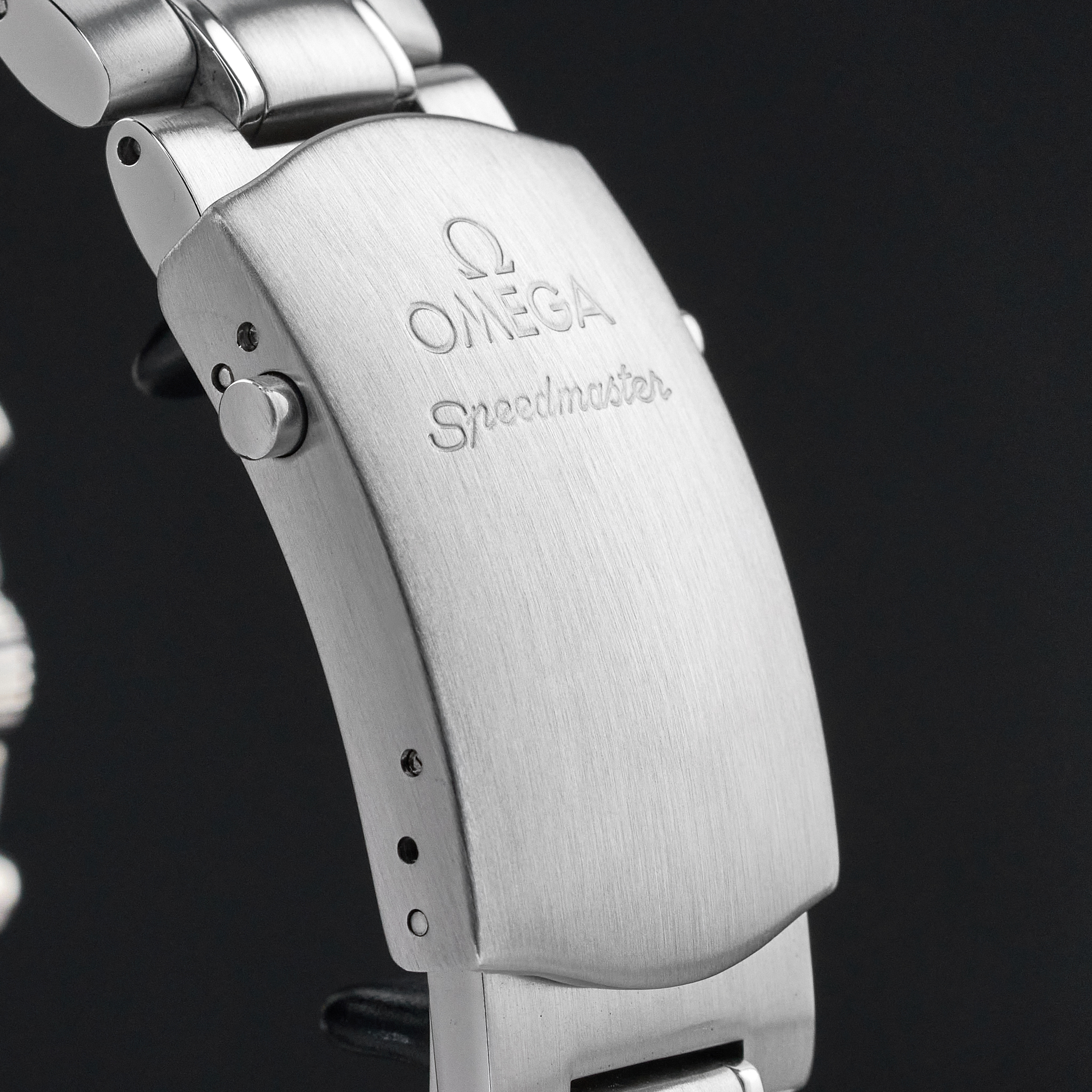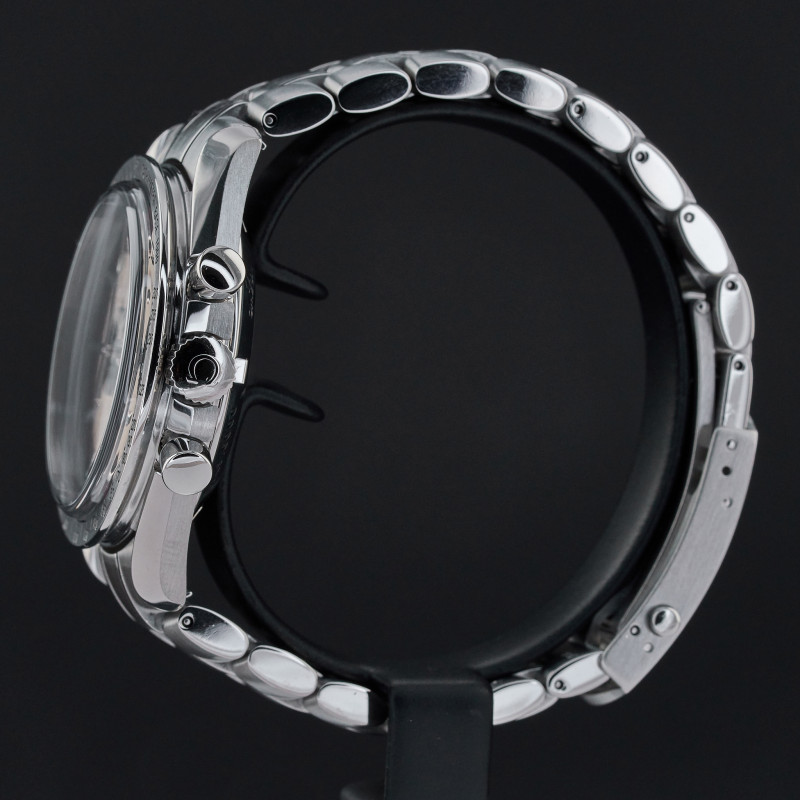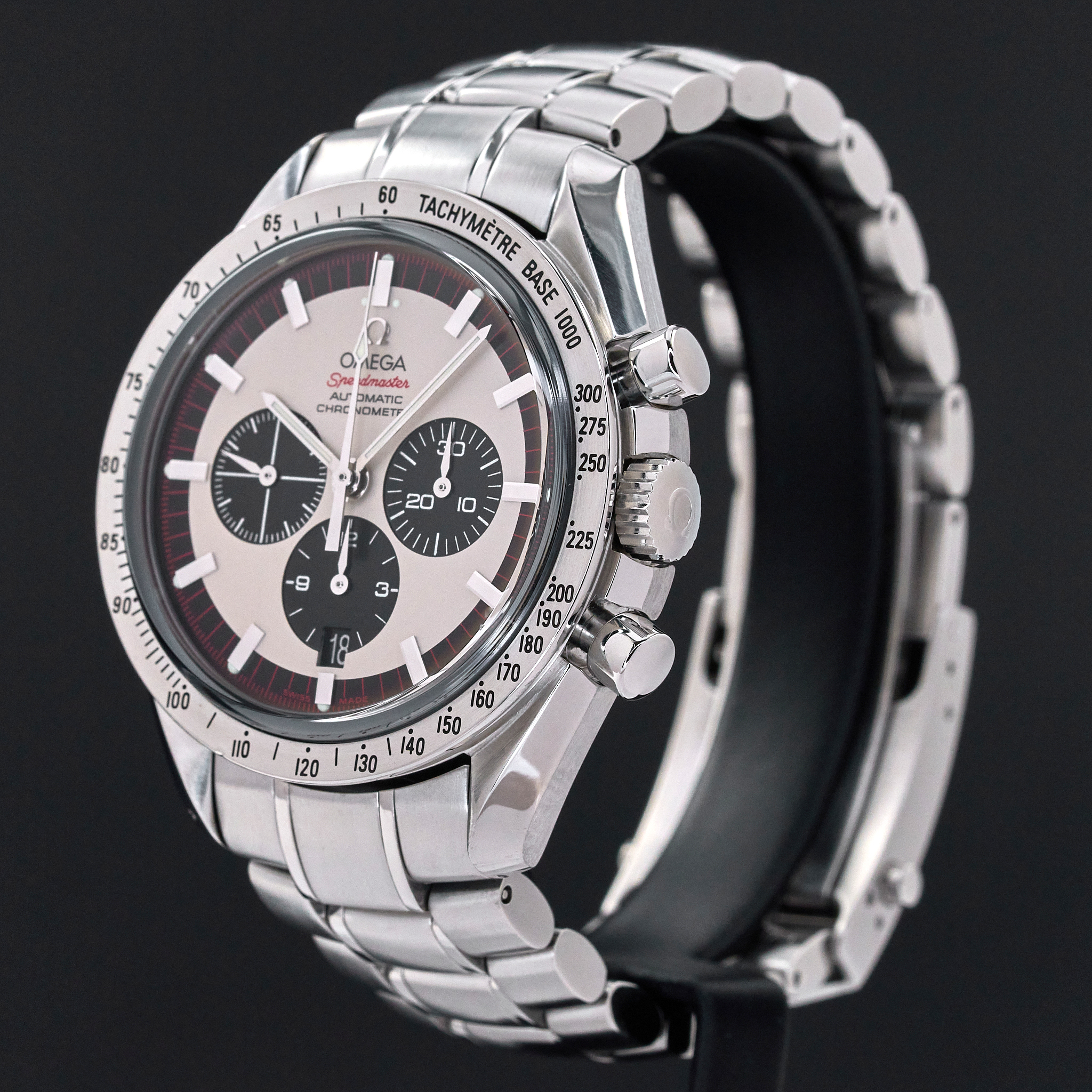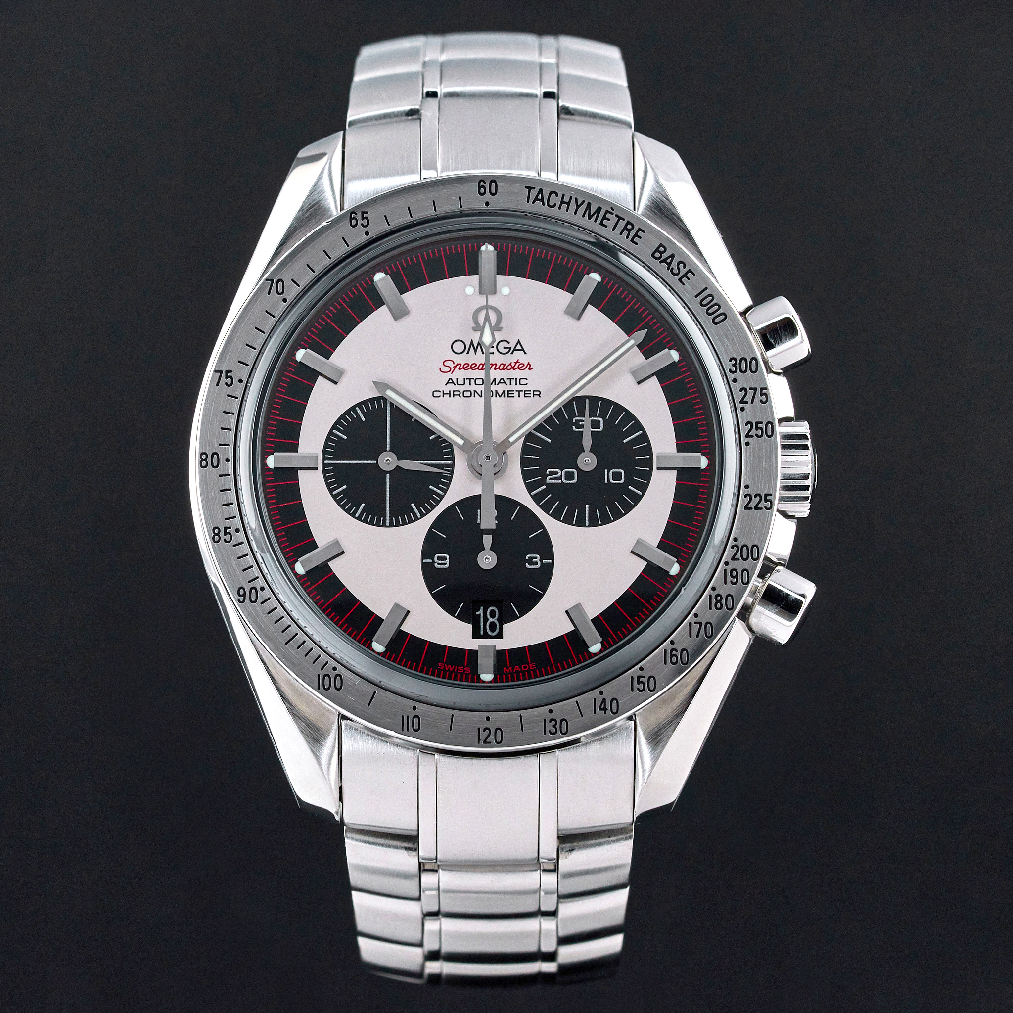 The Omega 3559.3200, also known as the Schumacher Legend, is a striking timepiece that captures the essence of both elegance and performance. Featuring a classic white dial, this watch is distinguished by its three black sub-dials, earning it the nickname "Panda." This contrasting design not only enhances readability but also adds a timeless and sporty appeal to the watch, making it a favorite among collectors and enthusiasts. The dial is meticulously crafted with a smooth, crisp white background that serves as the perfect canvas for the bold black sub-dials positioned at 3, 6, and 9 o'clock. Each sub-dial is finely detailed, with precise markings and hands that ensure accurate timekeeping and functionality. The minute track around the outer rim of the dial is clearly demarcated, further aiding in the watch's legibility. Luminous hands and indices enhance visibility in low-light conditions. Encased in robust stainless steel, the dial is protected by a scratch-resistant sapphire crystal, ensuring durability. The case back proudly displays a special red engraving, signed "Michael Schumacher The Legend", that pays tribute to the legendary Formula 1 driver Michael Schumacher. Overall, the Omega 3559.3200's dial is a harmonious blend of style, precision, and homage to racing history, making it a standout piece in the Omega Speedmaster collection.