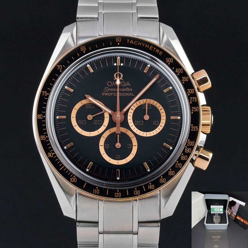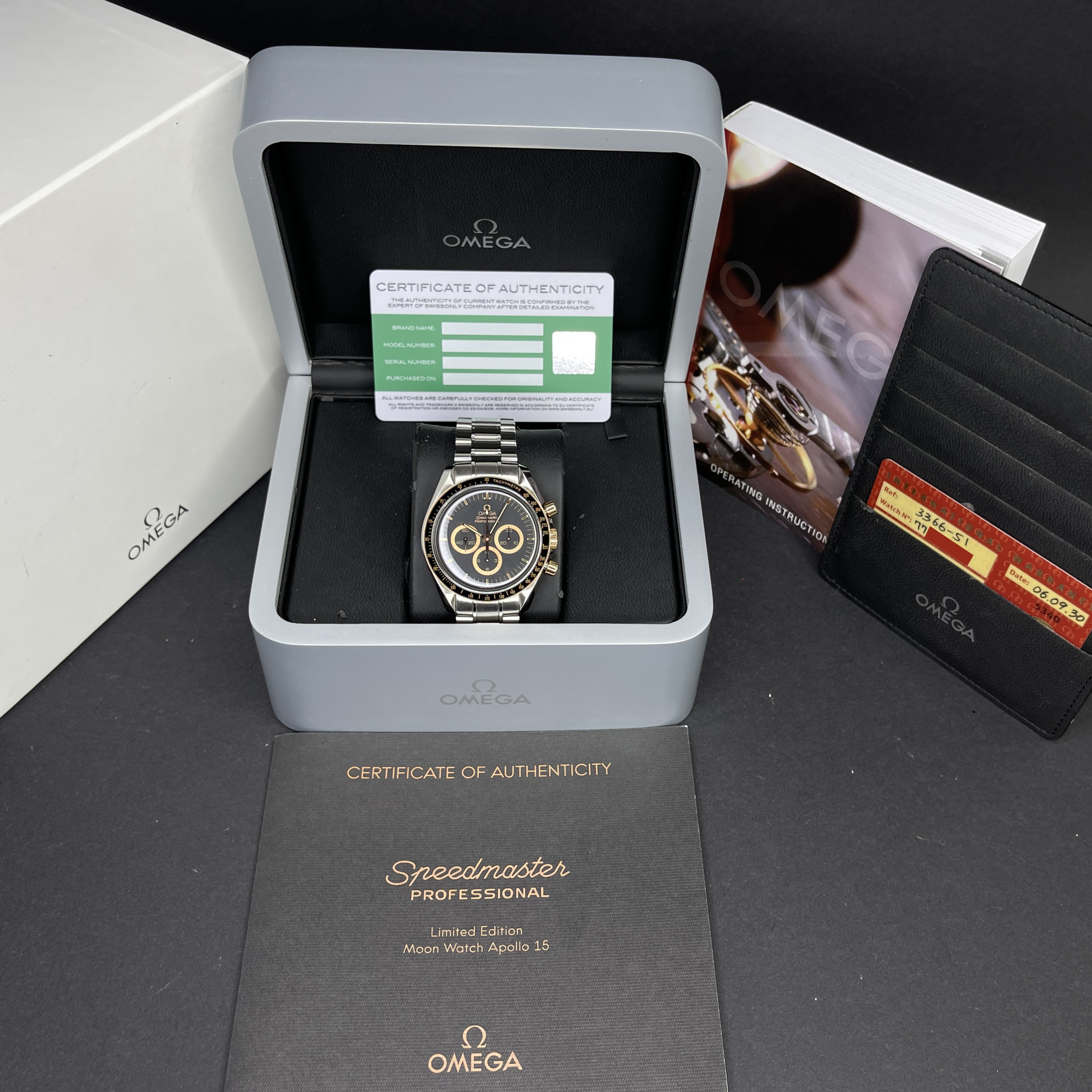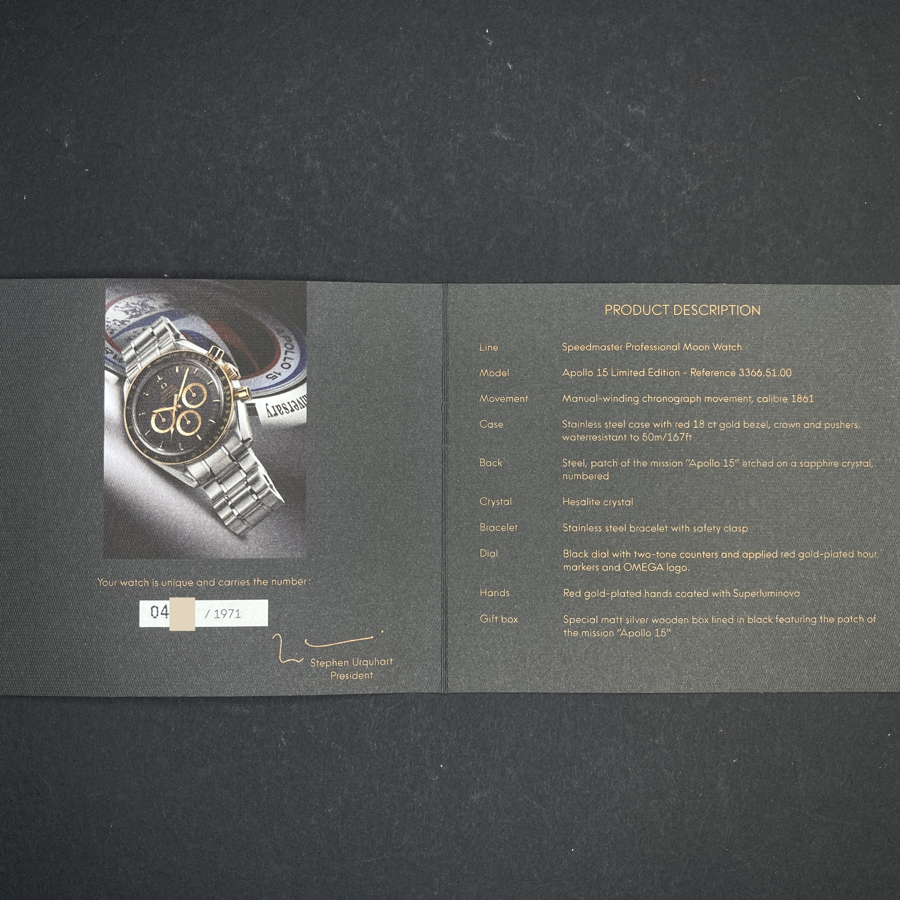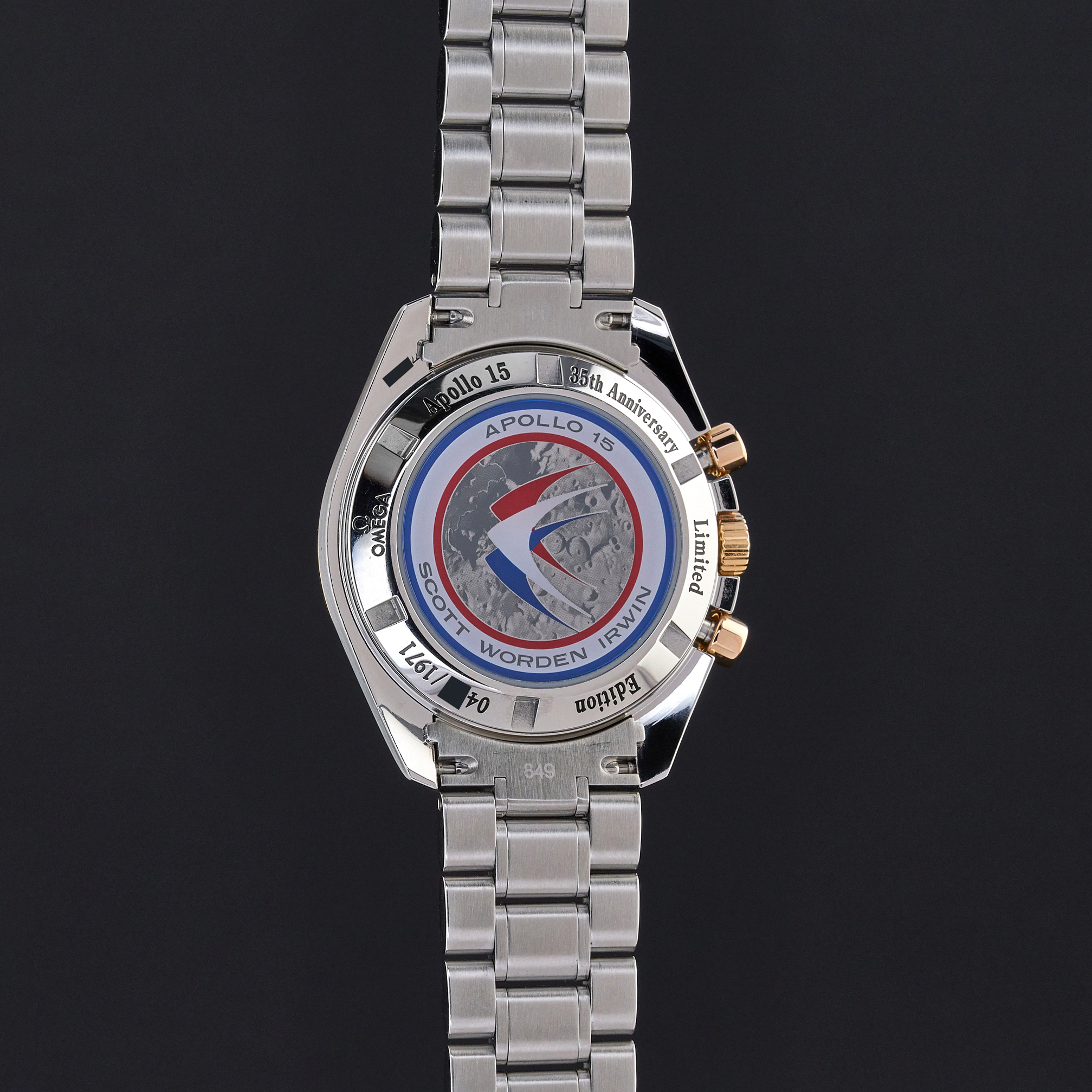 To commemorate the 35th anniversary of Apollo 15, OMEGA launched the Speedmaster Apollo XV 35th Anniversary Ref. 3366.51.00, a remarkable timepiece limited to just 1,971 pieces. This watch celebrates a historic mission that marked several significant milestones in space exploration, including the first use of the Lunar Rover Vehicle (LRV). Apollo 15 was a mission of exploration and discovery. The astronauts covered an impressive 27.9 kilometers on the lunar surface in the Lunar Rover Vehicle and returned with numerous geological samples, including the famed "Genesis Rock," a piece of ancient lunar crust that provided invaluable insights into the moon's history. The mission itself was the second-longest of all the Apollo missions, lasting 12 days, 17 hours, and 12 minutes. This sense of endurance and achievement is encapsulated in the design and craftsmanship of the Speedmaster Apollo XV. Further commemorating the mission, the Apollo 15 mission badge is also featured on the special silver-grey box that houses the watch, making it a complete tribute to one of NASA's most groundbreaking lunar missions. The Speedmaster Apollo XV is distinguished by its elegant design and unique details. Crafted with meticulous attention to detail, this special edition Speedmaster features a striking red gold bezel, complemented by pushers and a crown also fashioned from luxurious 18-carat red gold. This warm, lustrous tone continues through the watch's indices, hands, and sub-dial rings, all beautifully contrasted against a matte black dial, creating a captivating blend of elegance and functionality. The sapphire crystal caseback is etched with the Apollo 15 mission patch, which beautifully depicts three birds representing the three astronauts who journeyed to the moon. Driving this exceptional timepiece is the OMEGA calibre 1861.The calibre 1861 offers improved performance and durability thanks to its corrosion-resistant rhodium plating, ensuring that the watch is as robust as it is beautiful. The OMEGA Speedmaster Apollo XV 35th Anniversary Edition is more than just a watch; it is a piece of history, a celebration of human exploration, and a tribute to the courage and ingenuity of the astronauts who dared to go further than ever before.