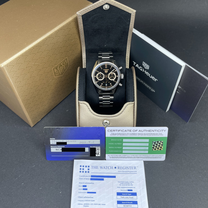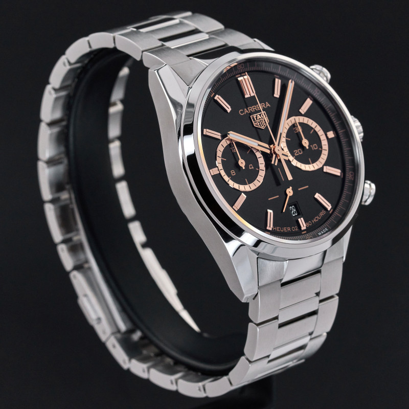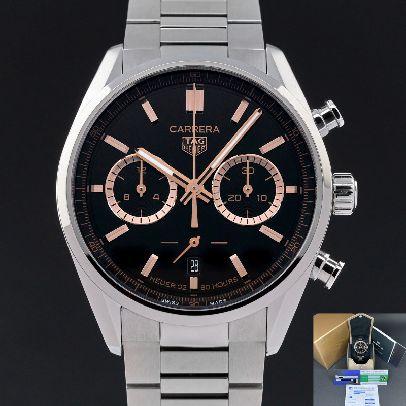 The Tag Heuer Japan Limited Carrera CBN2019.BA0642 is a remarkable timepiece that effortlessly blends heritage, performance, and luxury. Featuring a striking black dial with 2 subdials with gold accents, this limited edition of just 300 pieces draws inspiration from the enduring strength and refined beauty of ancient Japanese armor. The watch’s dial and indexes reflect a bold contrast of black and gold, symbolizing prestige and timeless craftsmanship. Housed in a 42mm stainless steel case, the Carrera is powered by the self-winding Calibre Heuer 02 movement, offering an impressive 80-hour power reserve. Its chronograph functionality ensures precise timekeeping, while a date display adds to its practicality. The watch is also equipped with a sapphire crystal caseback, offering a glimpse of the intricate movement inside. With its hidden folding clasp and the signature Tag Heuer logo on the stainless steel bracelet, this Carrera blends sleek design with the rich legacy of Swiss watchmaking.