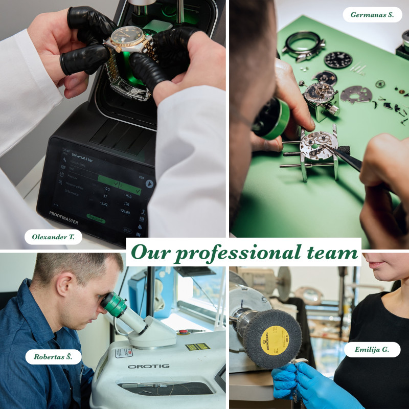 PLEASE NOTE THAT ALL OUR WATCHES ARE CAREFULLY SERVICED BY OUR 12 WATCHMAKERS. The service includes movement cleaning in special equipment, oiling and accuracy adjustment. After service we check accuracy of all watches on the Timegrapher and make 48 hours test on the Cyclotest.