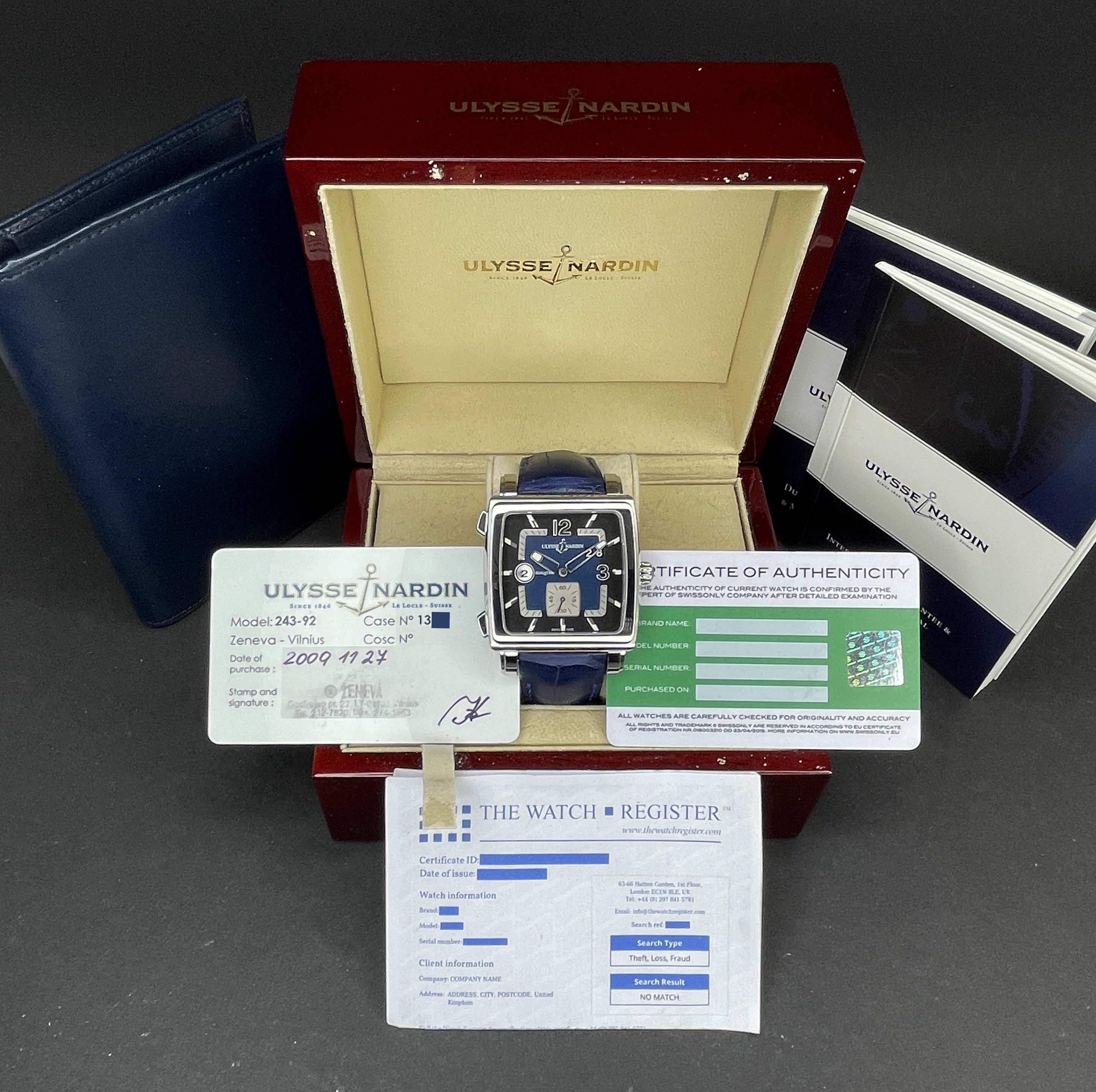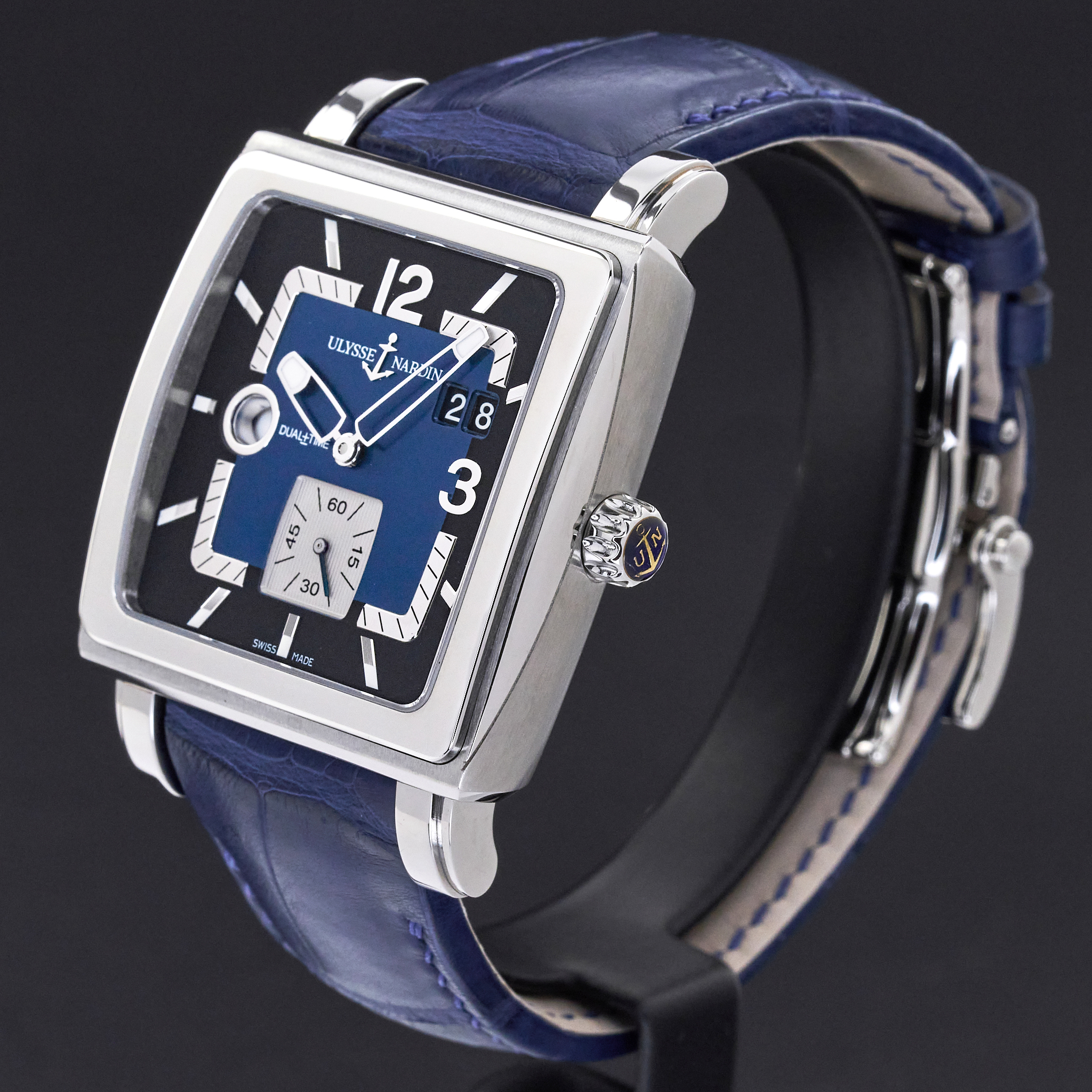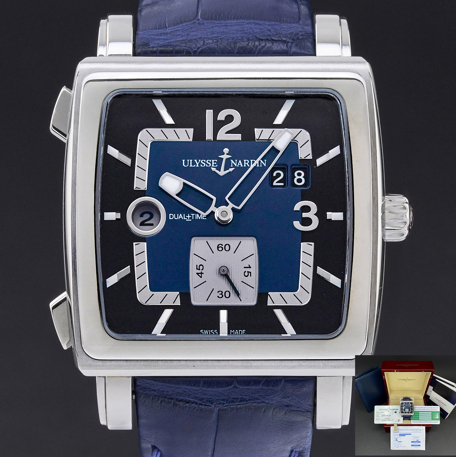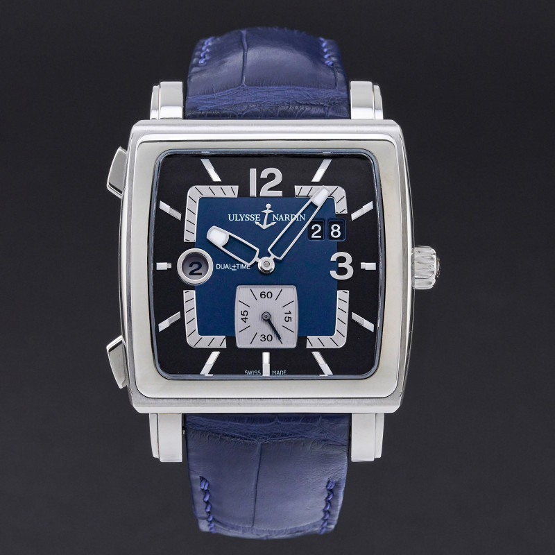 Ulysse Nardin Quadrato Dual Time, 243-92, 42mm, 2009, Steel, Blue Arabic dial, Fullset, 1y warranty