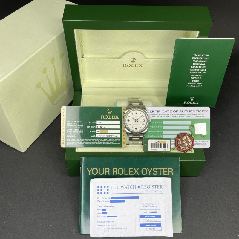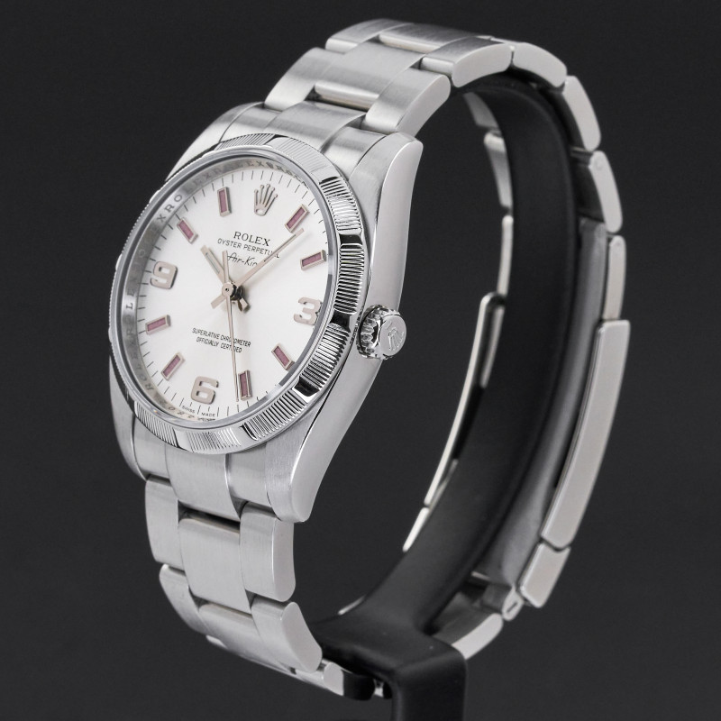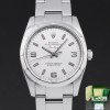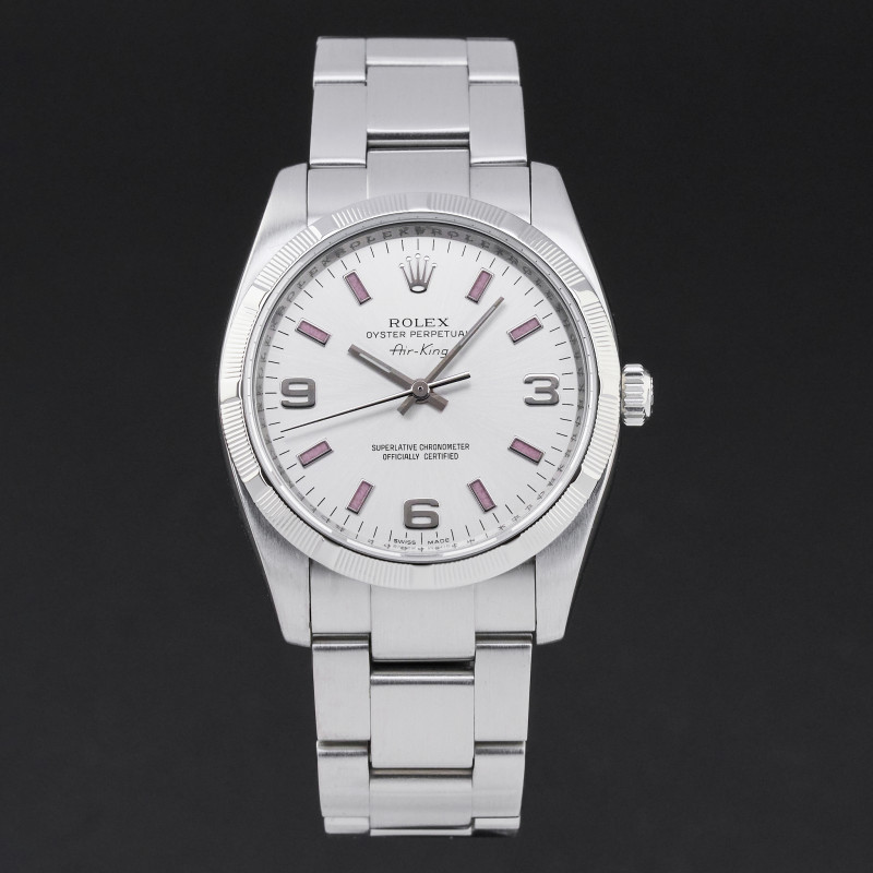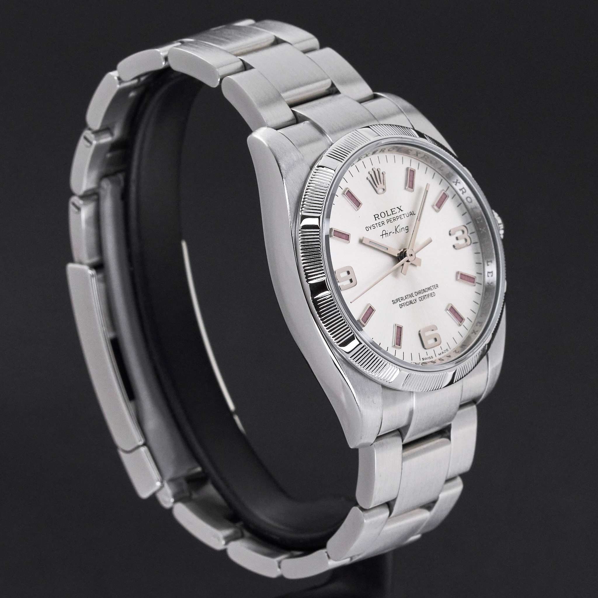 This Rolex Air-King 114210 features a Silver Arabic dial and is crafted from stainless steel, with a production year of 2008.