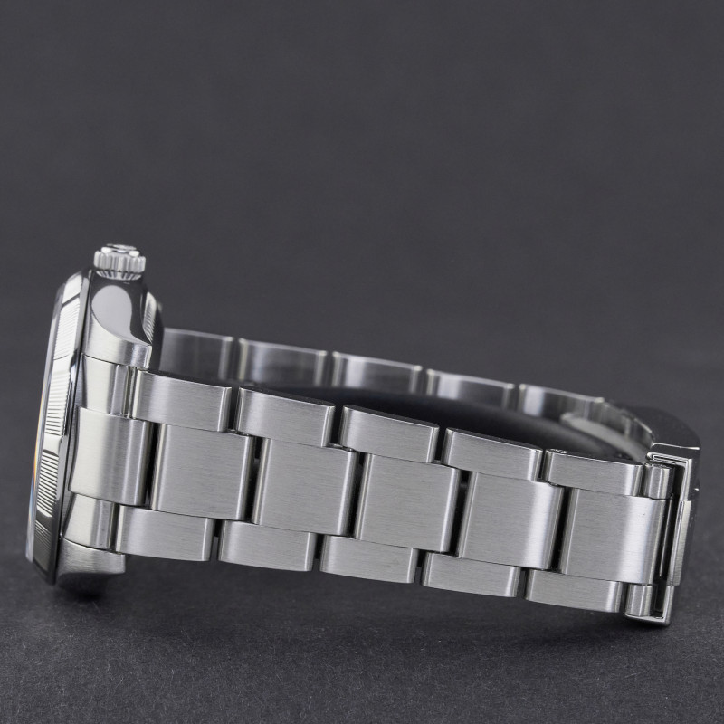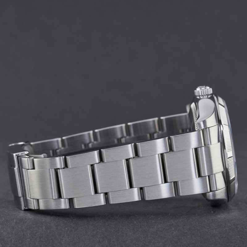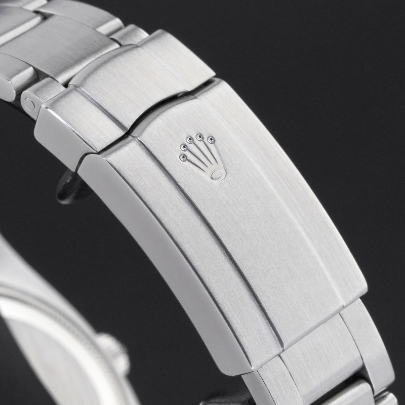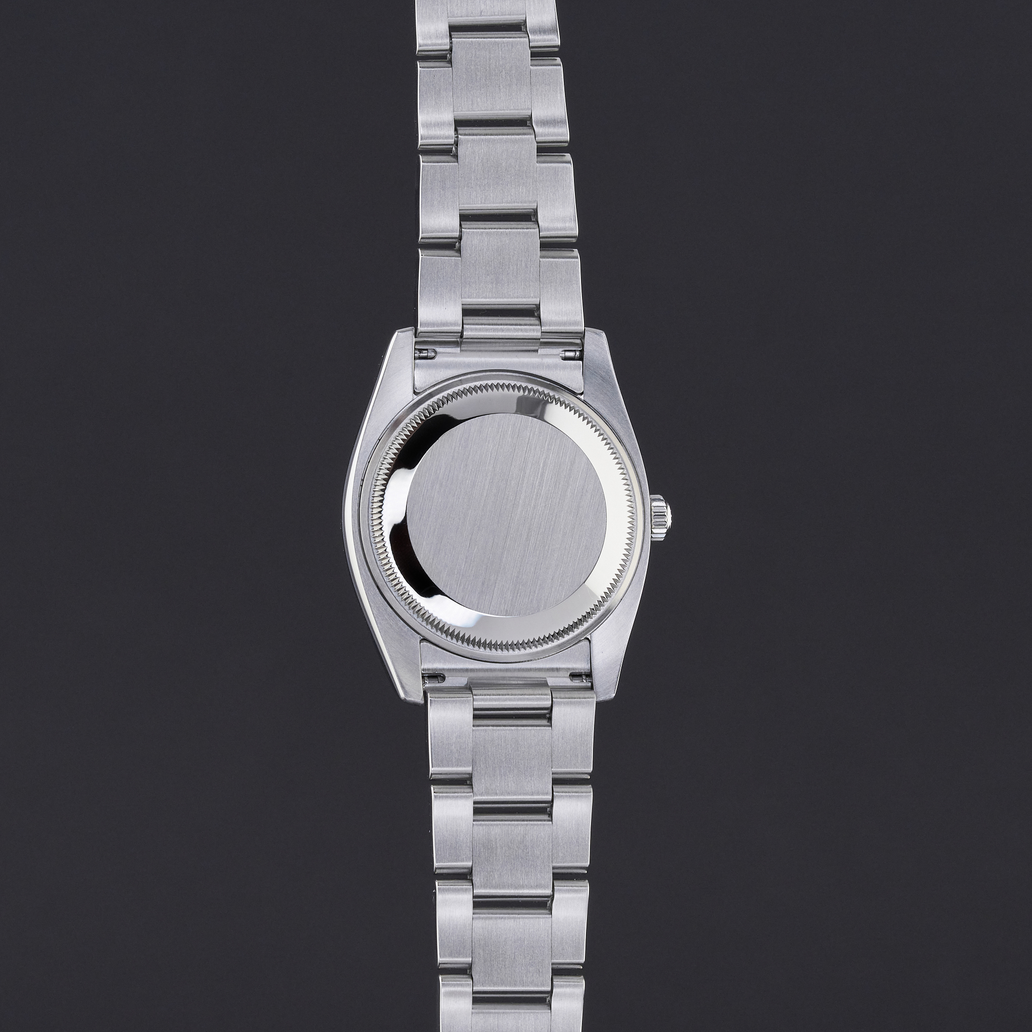 This Rolex Air-King 114210 features a Silver Arabic dial and is crafted from stainless steel, with a production year of 2008.