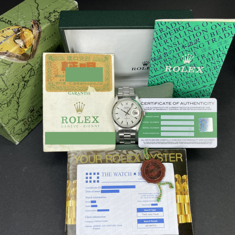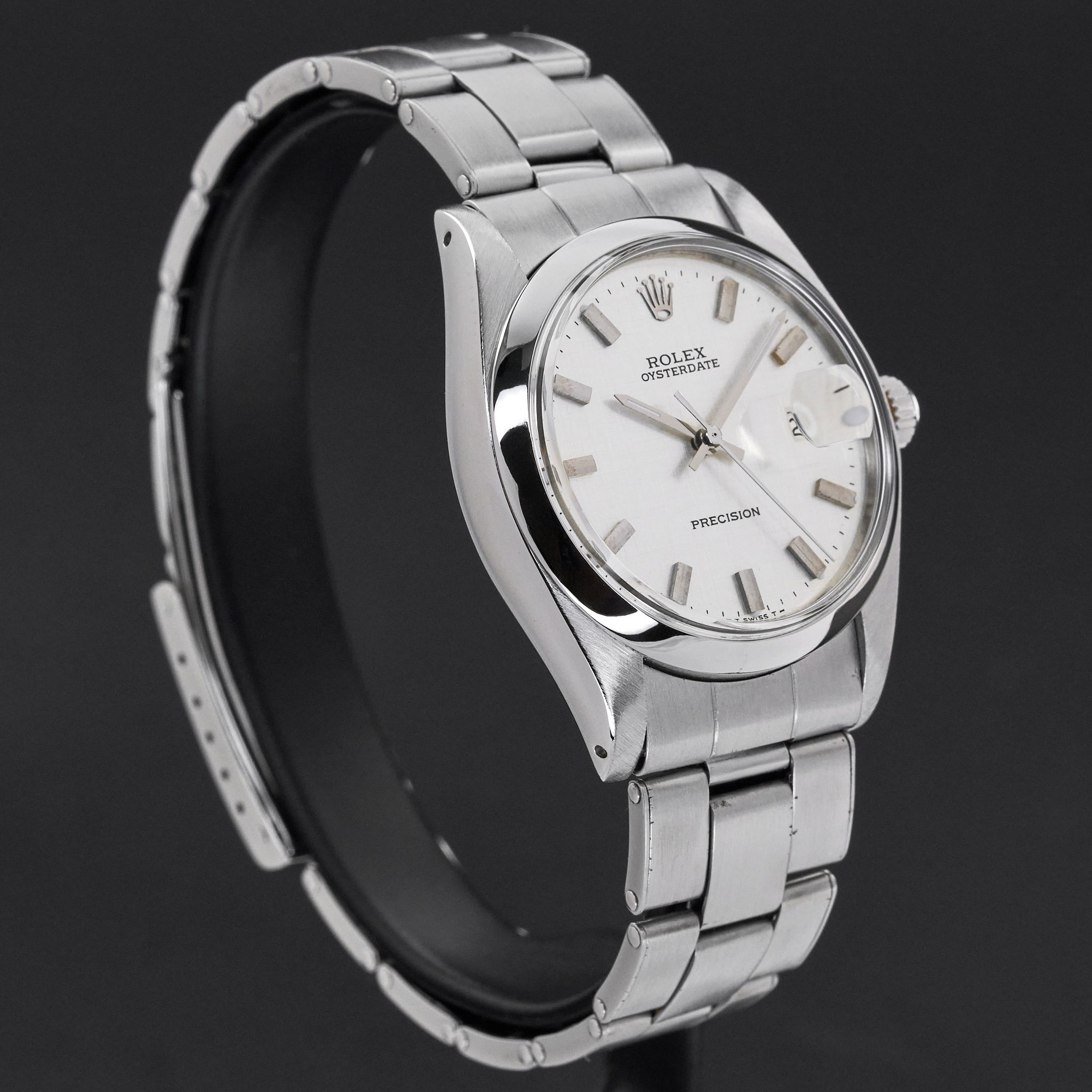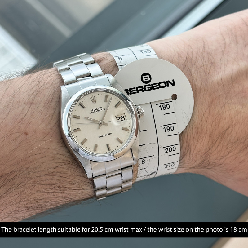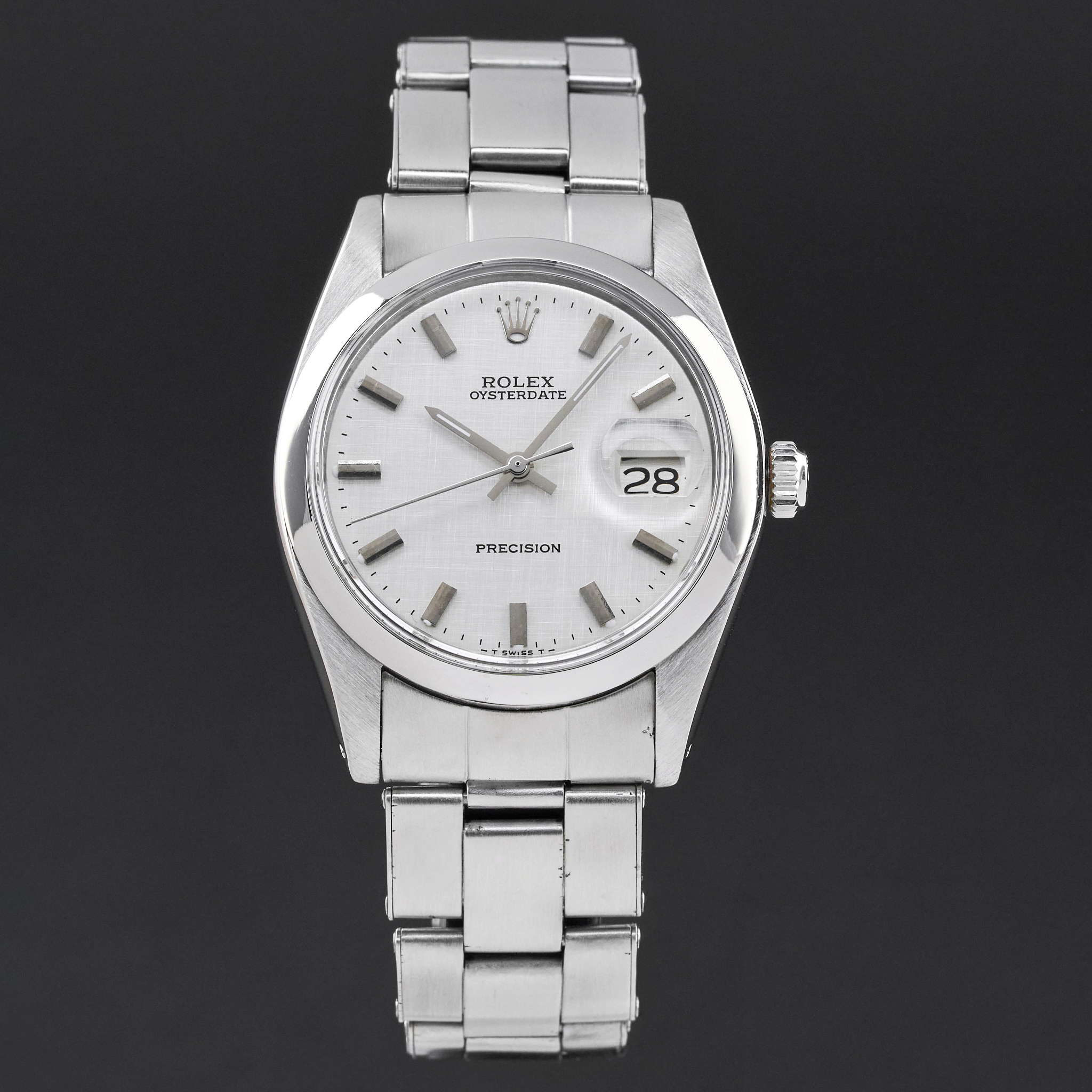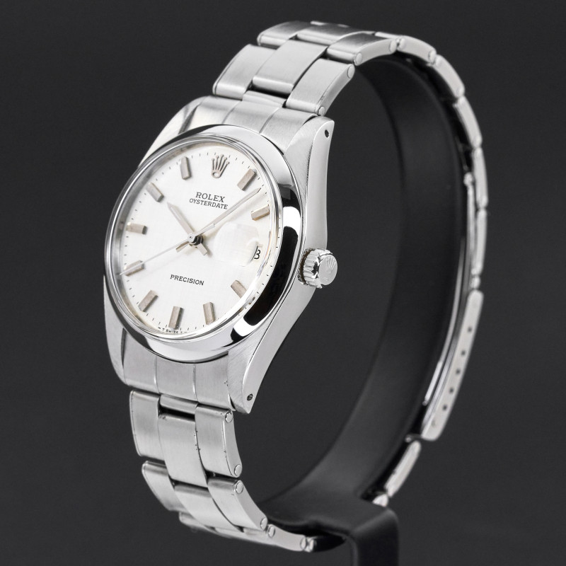 This Rolex Oysterdate Precision 6694 features a Silver linen dial and is crafted from stainless steel, with a production year of 1978.