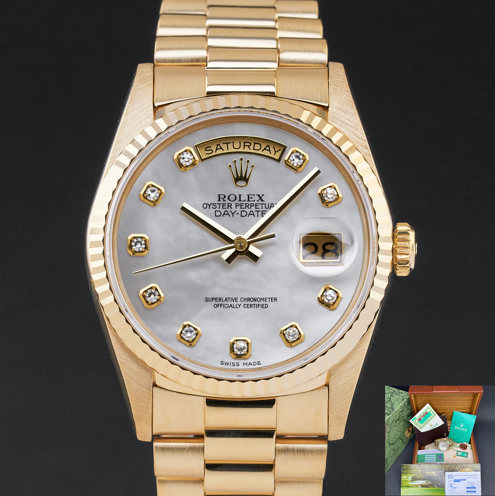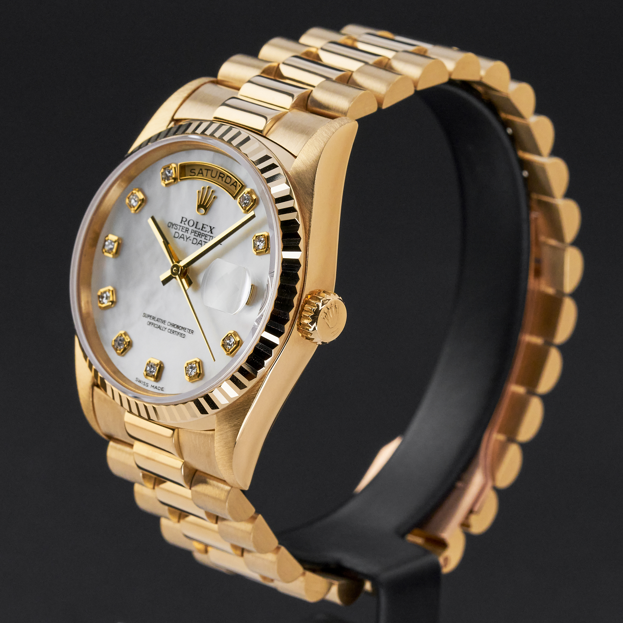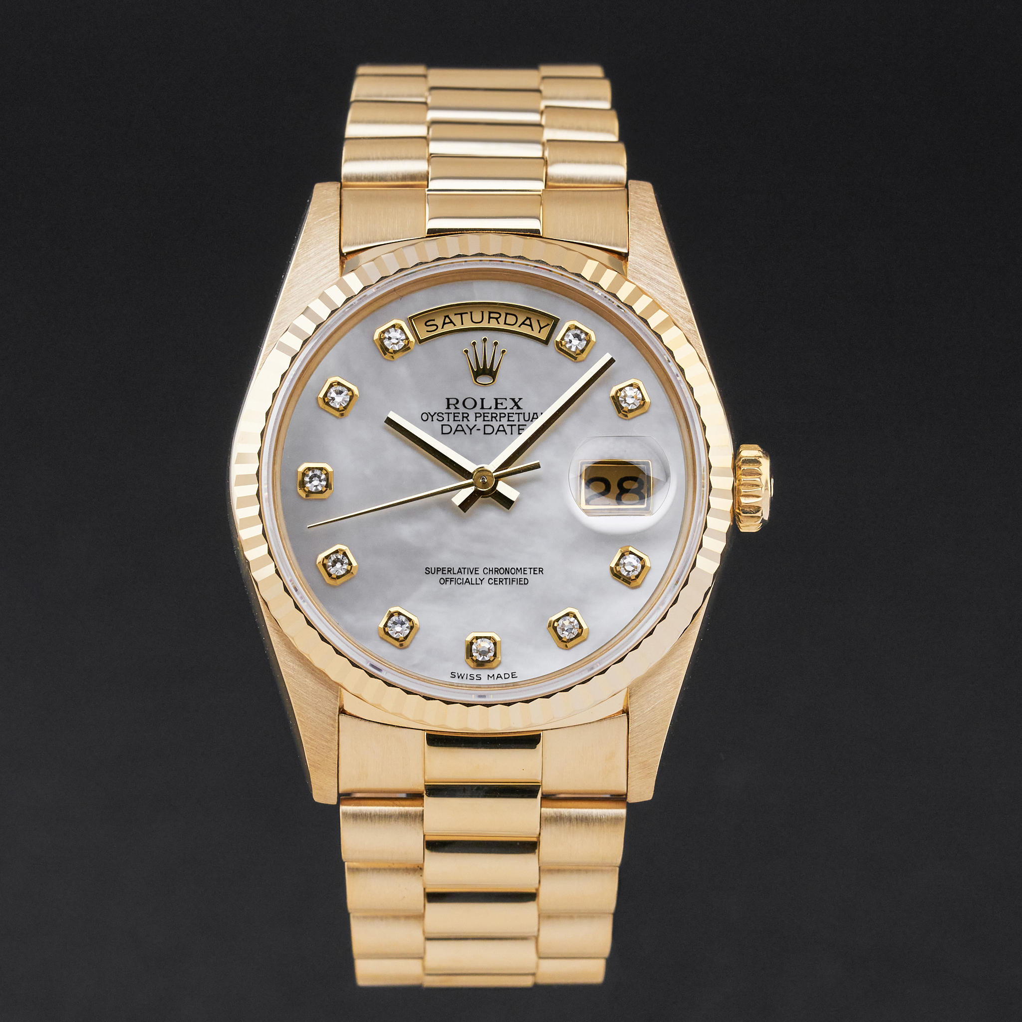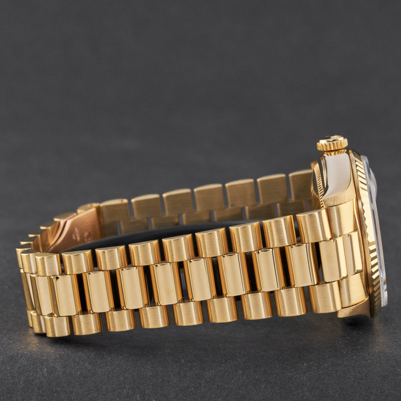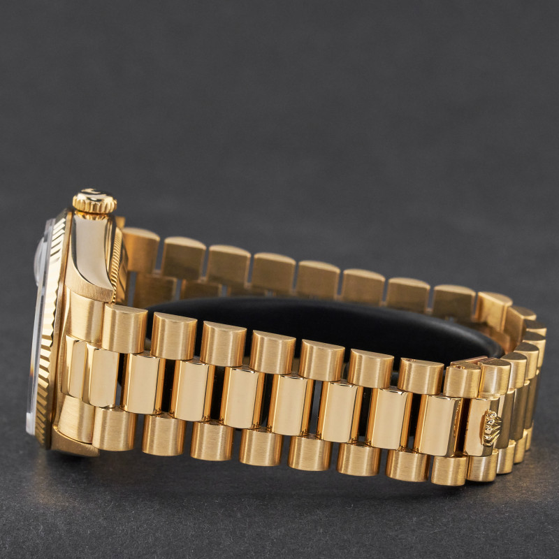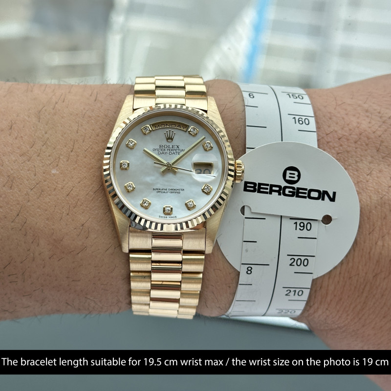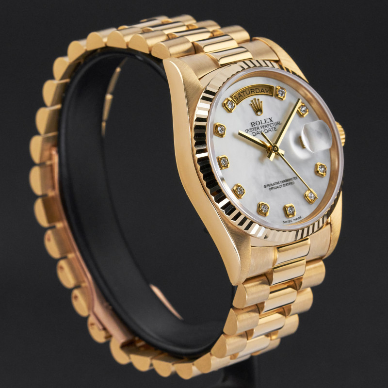 This Rolex Day-Date 18238 features a Mother of Pearl Diamond dial and is crafted from 18K yellow gold, with a production year of 1995.