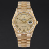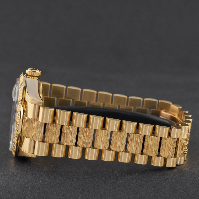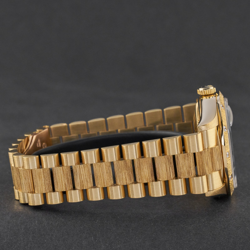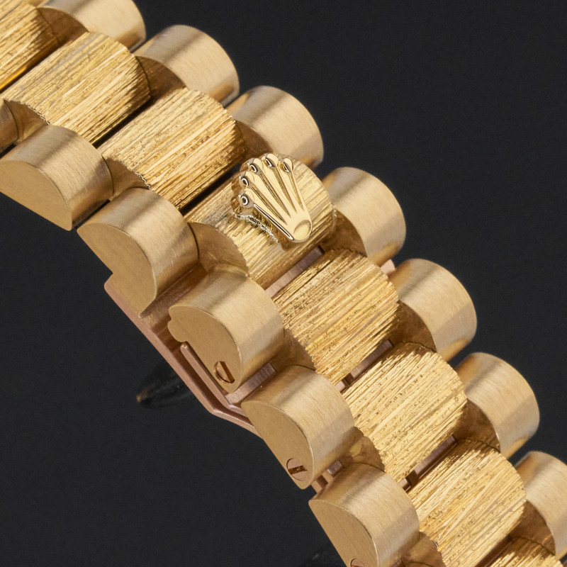 This particular Rolex Day-Date introduced in 1995, is the epitome of luxury and flawless craftsmanship. These watches feature a rare and unique Champagne Bark Myriad dial, giving them a distinctive depth and character. The soft glow of the champagne color, complemented by the unique texture, makes the dial visually rich and captivating. This detail highlights Rolex's exceptional taste and attention to detail.