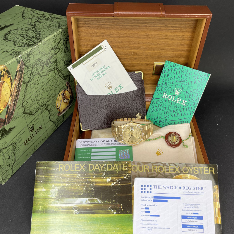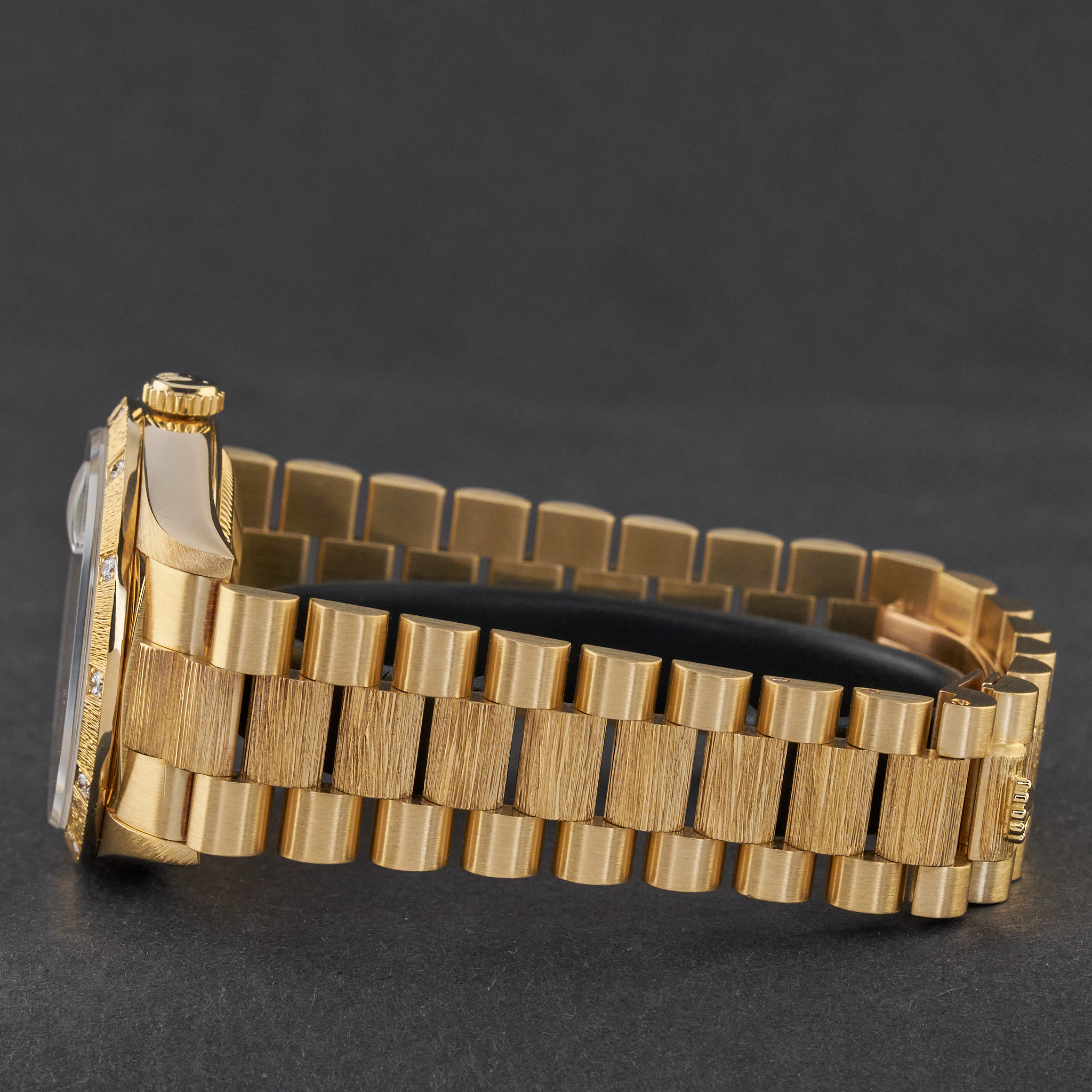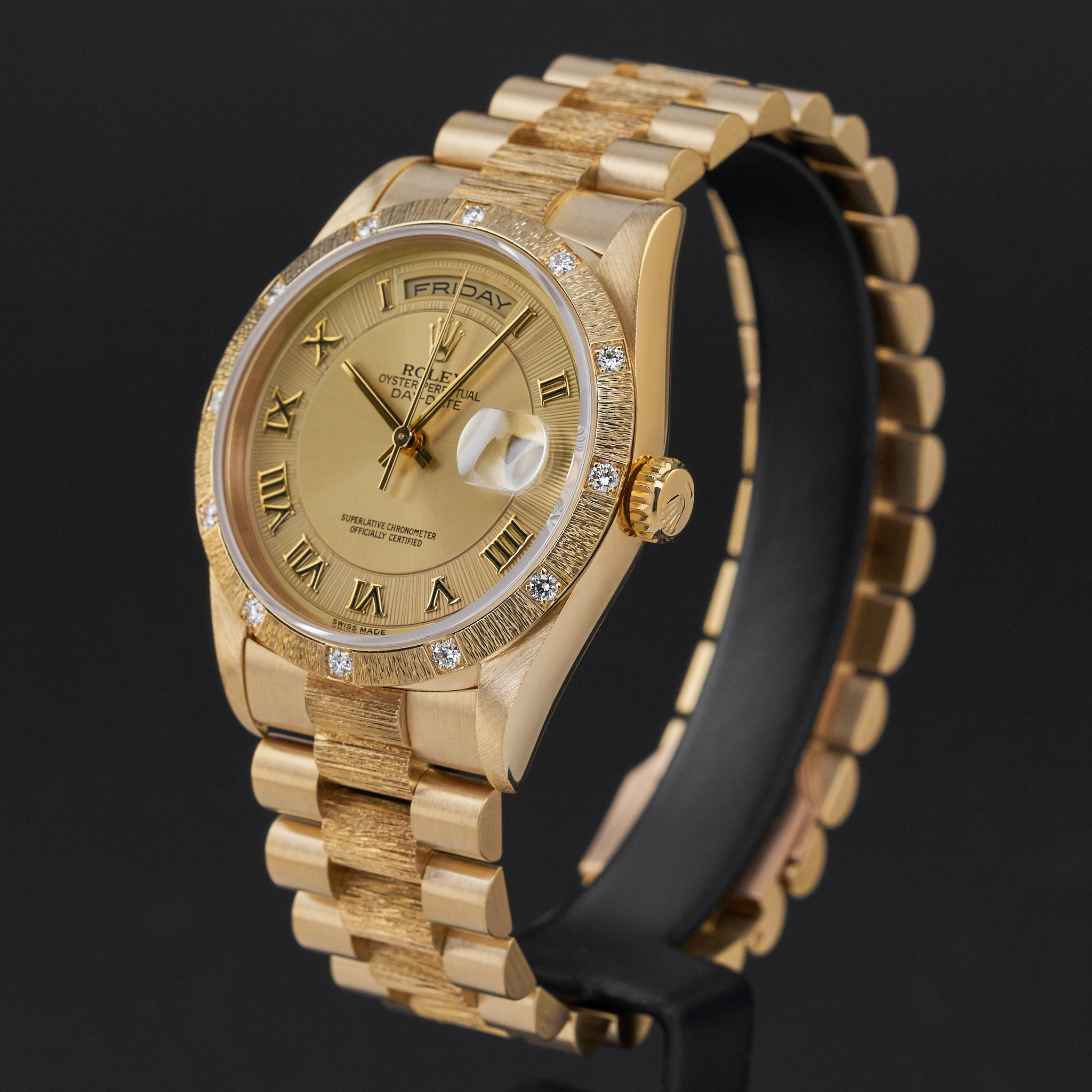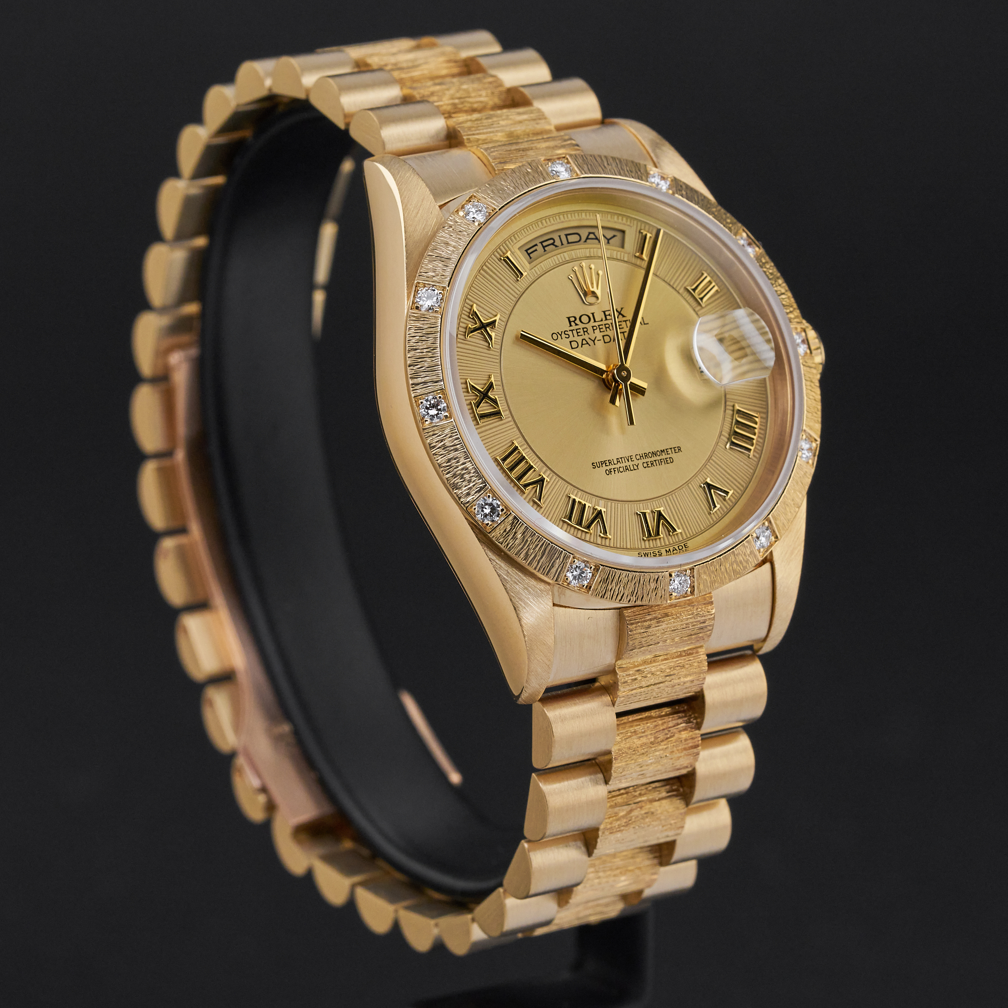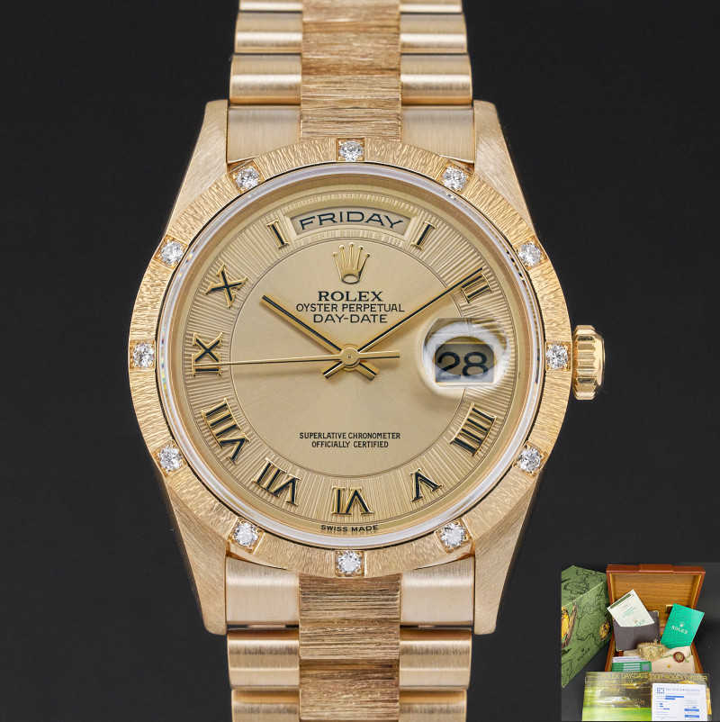 This Rolex Day-Date features a RARE Champagne Bark Myriad dial and is crafted from 18K yellow gold, with a production year of 1995.