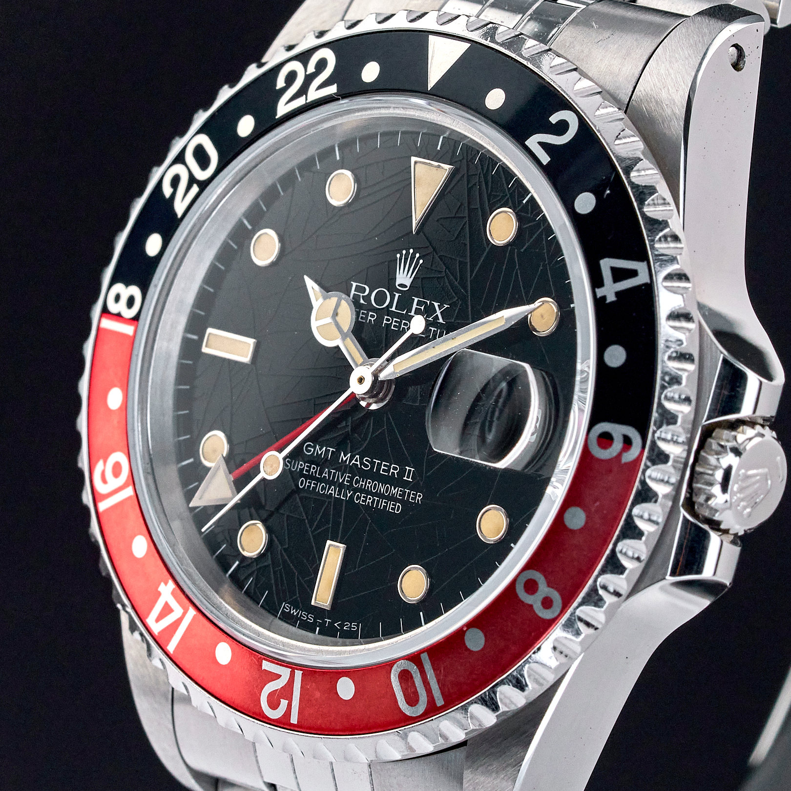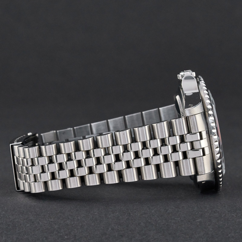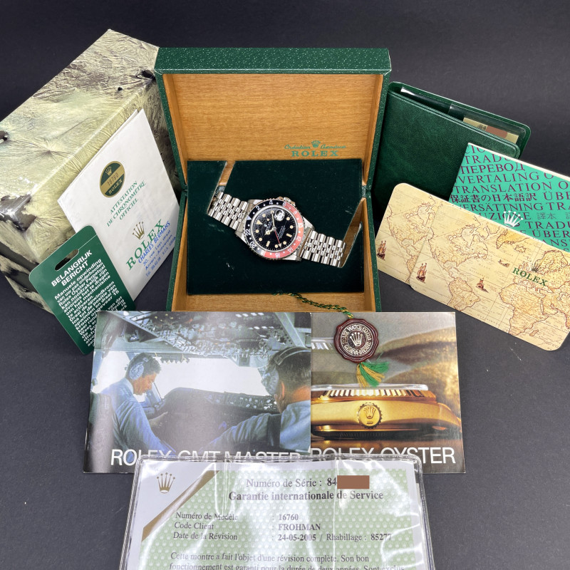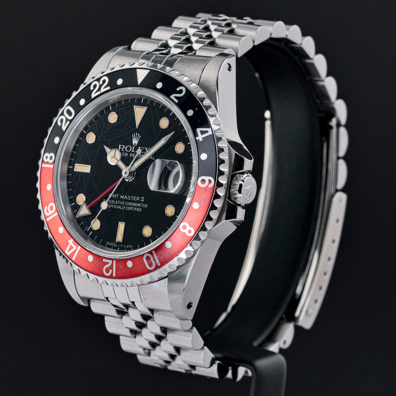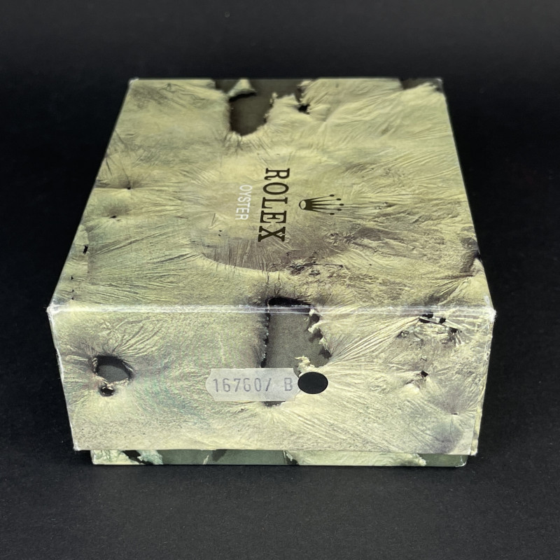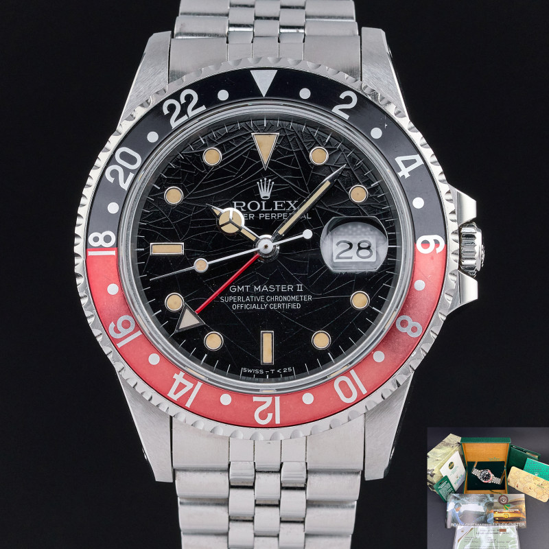 The Rolex 16760, also known as the "Fat Lady," is a highly regarded vintage GMT-Master II model that holds a special place in the hearts of watch collectors. Introduced in the mid-1980s, this model earned its nickname due to its thicker case, which housed the upgraded 3085 movement—allowing for independent adjustment of the hour hand, a groundbreaking feature at the time. One of the most sought-after variations of this timepiece features a "Tropical" black spider dial without "Date" word after "Perpetual". Over the years, the original black lacquer on these dials has undergone a fascinating metamorphosis due to exposure to UV light, developing unique and mesmerizing crackling patterns. This natural transformation, often referred to as "spidering," adds to the dial's charm and rarity, making each watch uniquely beautiful. Complementing this rare and visually intriguing dial is the iconic "Coke" bezel, characterized by its red and black color scheme. The bezel's vibrant contrast not only adds to the watch's aesthetic appeal but also serves as a functional feature for tracking a second time zone. The 16760's combination of historical significance, robust design, and the captivating aesthetic of the tropical spider dial makes it a highly coveted piece among vintage Rolex enthusiasts.