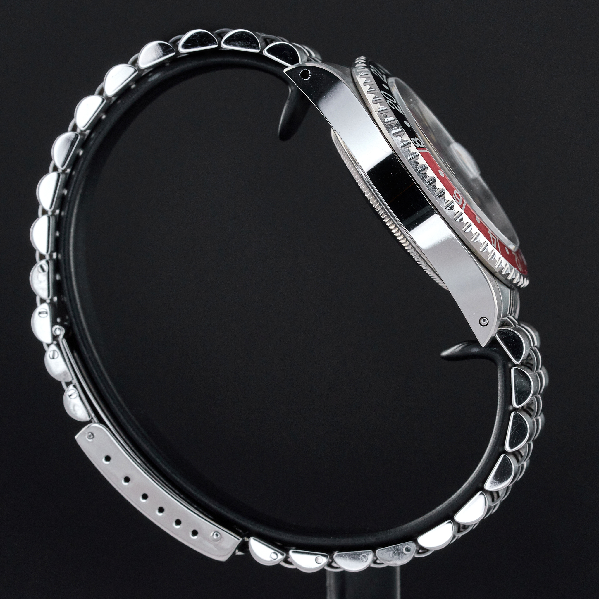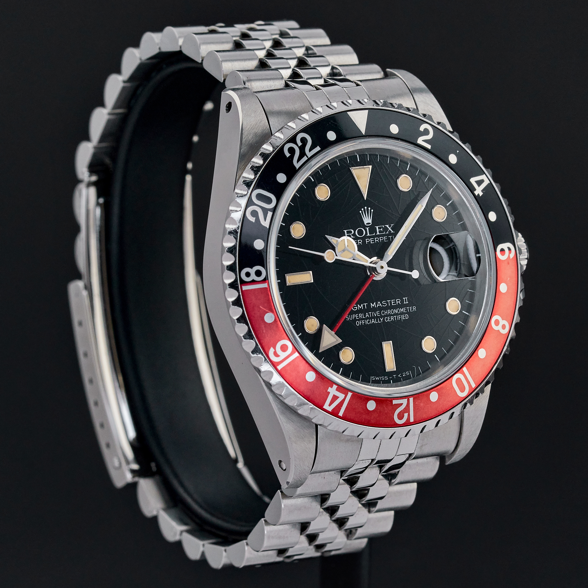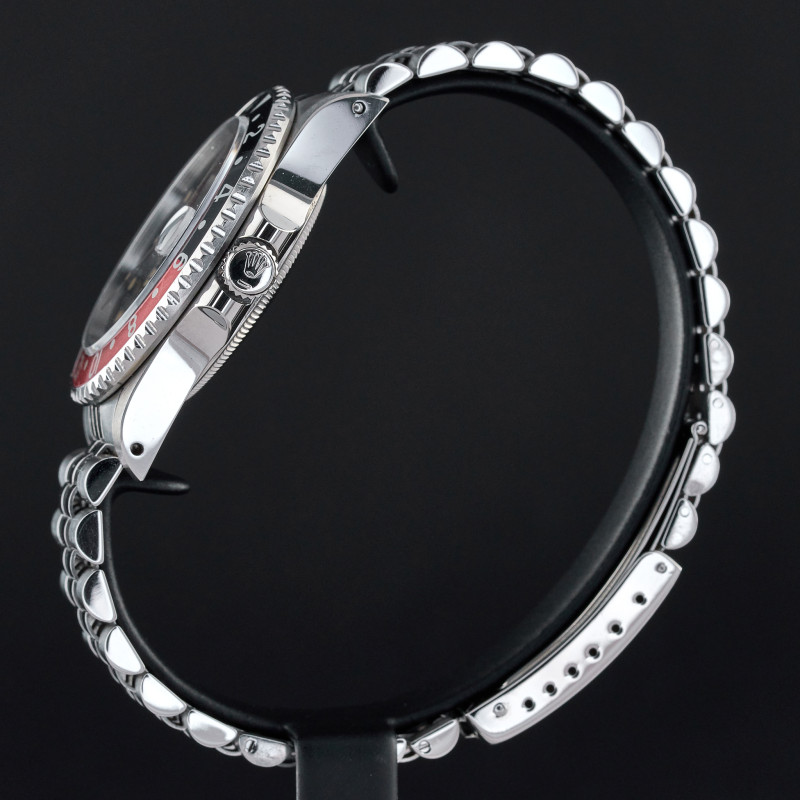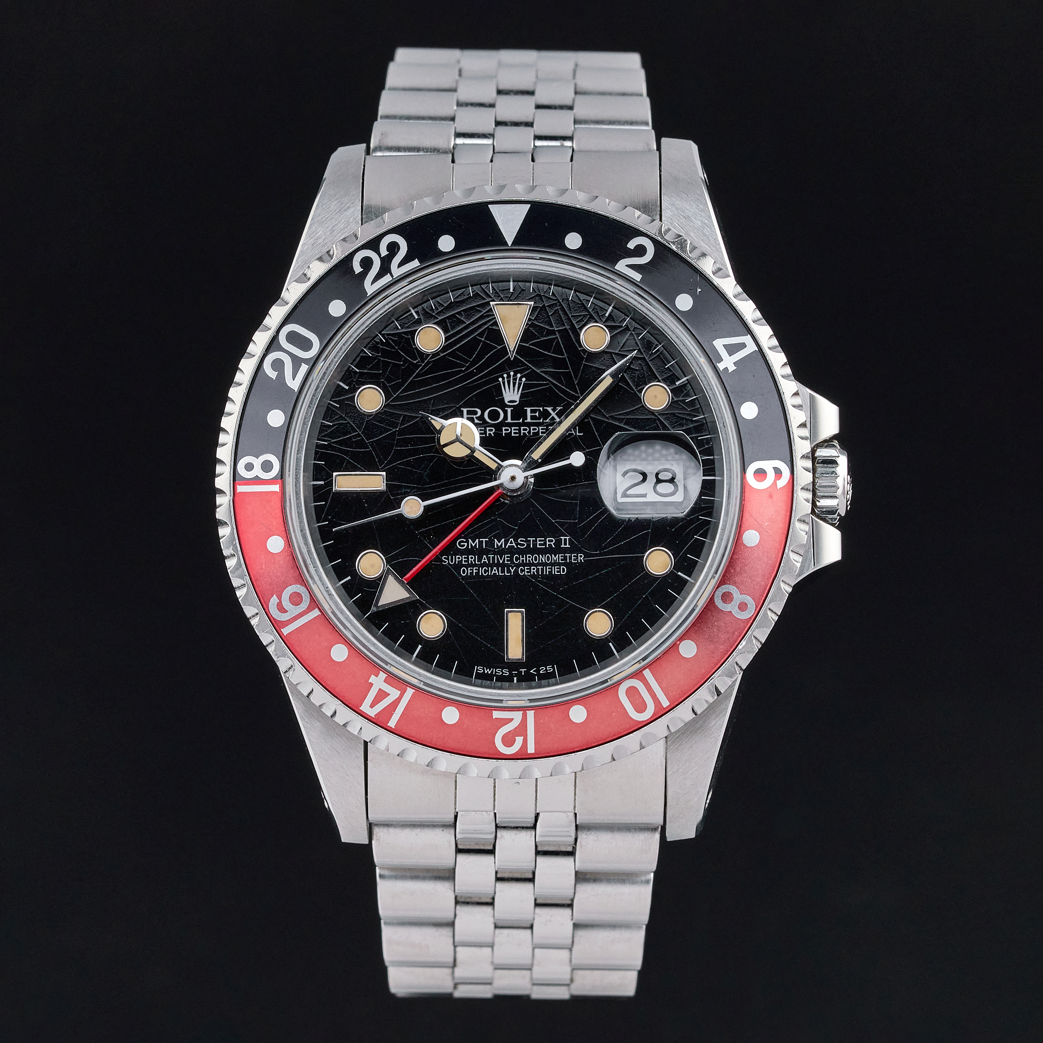 The Rolex 16760, also known as the "Fat Lady," is a highly regarded vintage GMT-Master II model that holds a special place in the hearts of watch collectors. Introduced in the mid-1980s, this model earned its nickname due to its thicker case, which housed the upgraded 3085 movement—allowing for independent adjustment of the hour hand, a groundbreaking feature at the time. One of the most sought-after variations of this timepiece features a "Tropical" black spider dial without "Date" word after "Perpetual". Over the years, the original black lacquer on these dials has undergone a fascinating metamorphosis due to exposure to UV light, developing unique and mesmerizing crackling patterns. This natural transformation, often referred to as "spidering," adds to the dial's charm and rarity, making each watch uniquely beautiful. Complementing this rare and visually intriguing dial is the iconic "Coke" bezel, characterized by its red and black color scheme. The bezel's vibrant contrast not only adds to the watch's aesthetic appeal but also serves as a functional feature for tracking a second time zone. The 16760's combination of historical significance, robust design, and the captivating aesthetic of the tropical spider dial makes it a highly coveted piece among vintage Rolex enthusiasts.