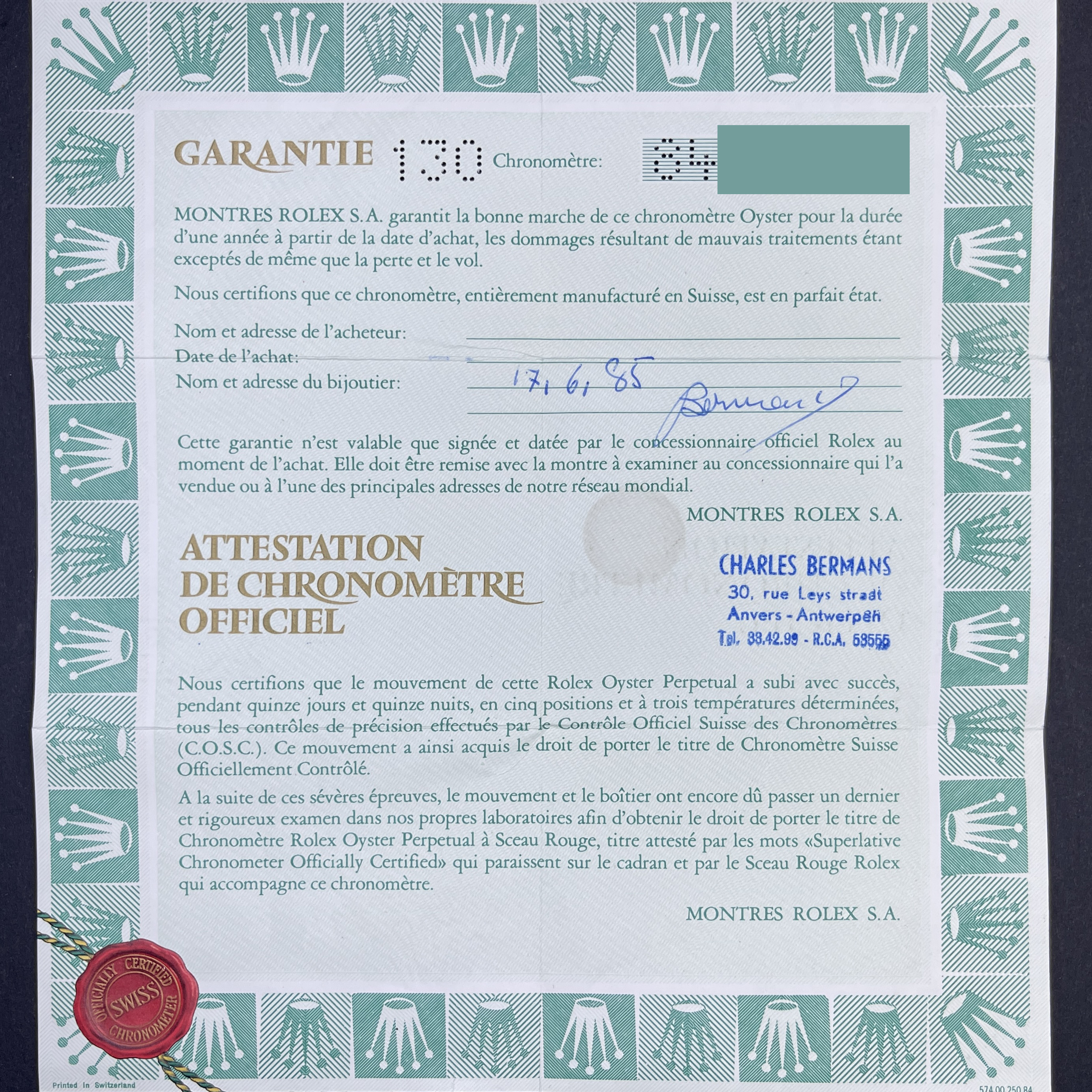 PLEASE NOTE THAT ALL OUR WATCHES ARE CAREFULLY SERVICED BY OUR 13 WATCHMAKERS. The service includes movement cleaning in special equipment, oiling and accuracy adjustment. After service we check accuracy of all watches on the Timegrapher and make 48 hours test on the Cyclotest.
