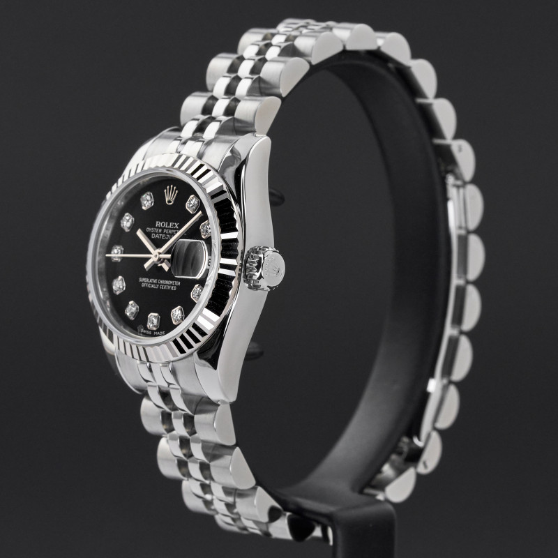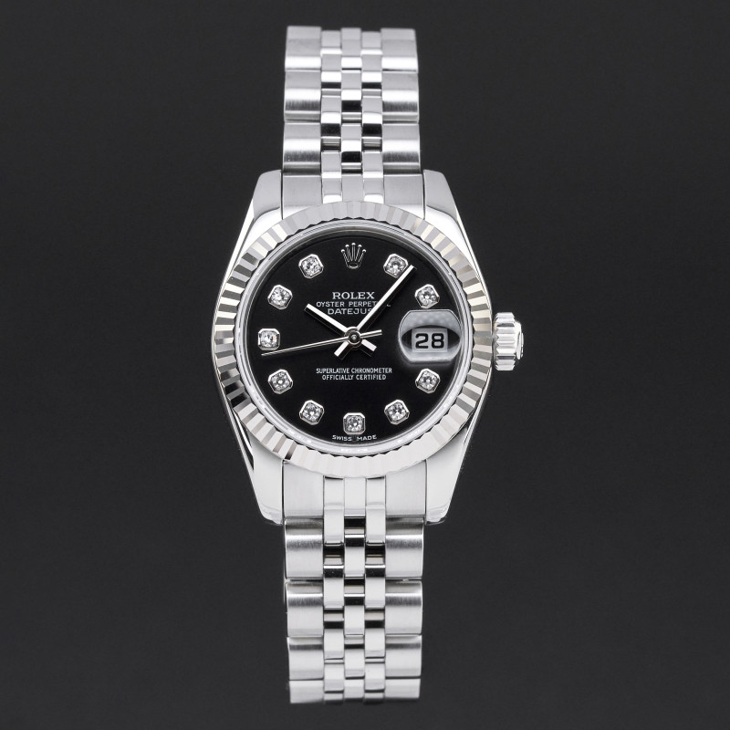 This Rolex Lady-Datejust 179174 features a Black diamond dial and is crafted from stainless steel, with a production year of 2010.