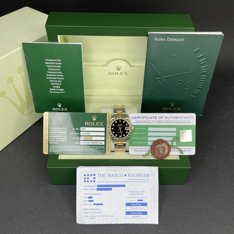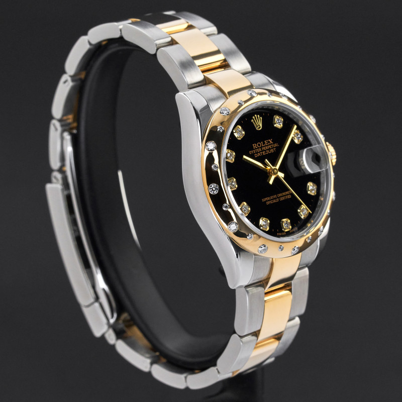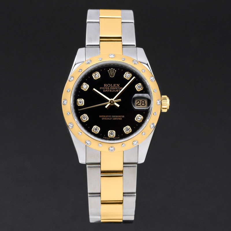 This Rolex Datejust 178343 features a Black diamond dial and is crafted from 18K yellow gold and stainless steel, with a production year of 2010.