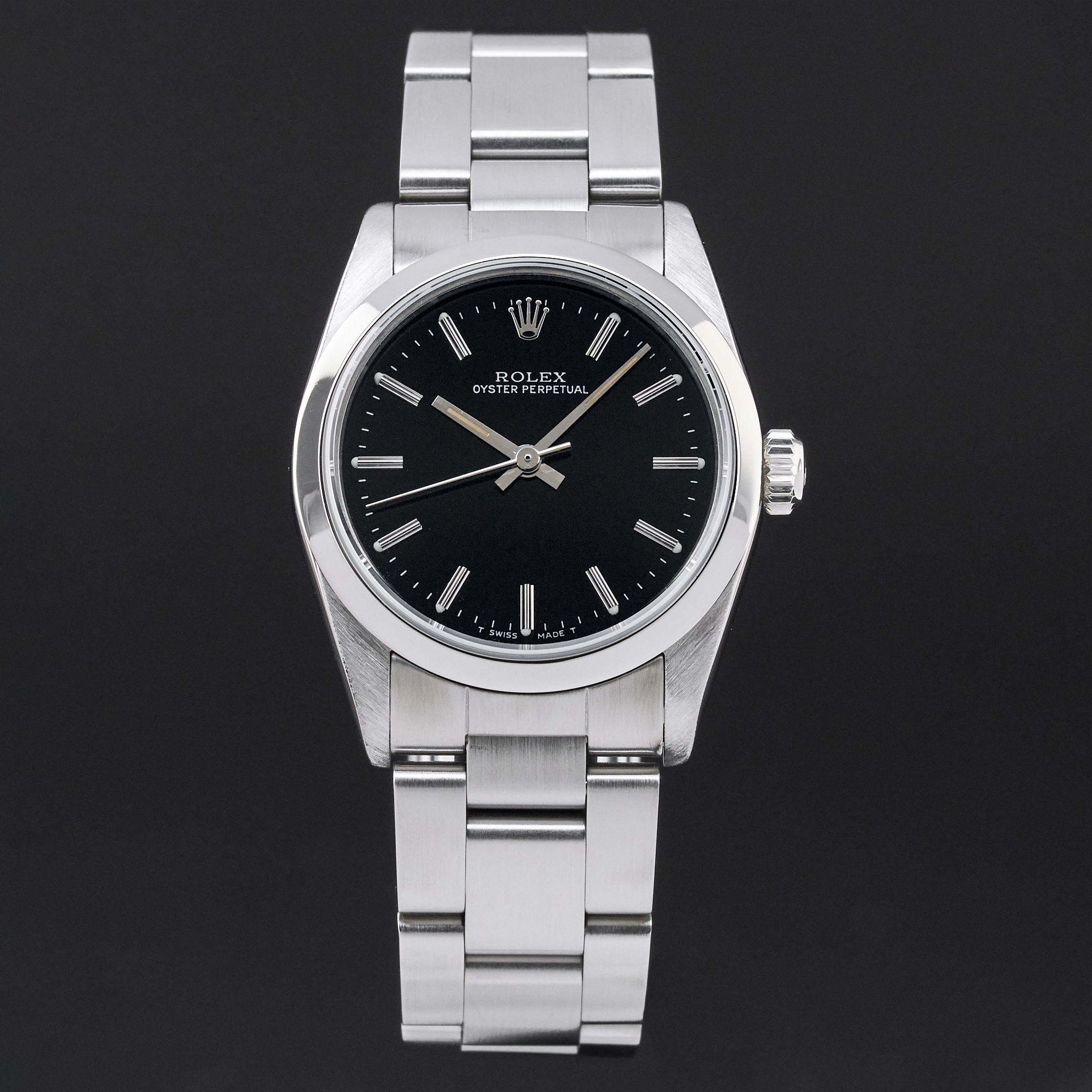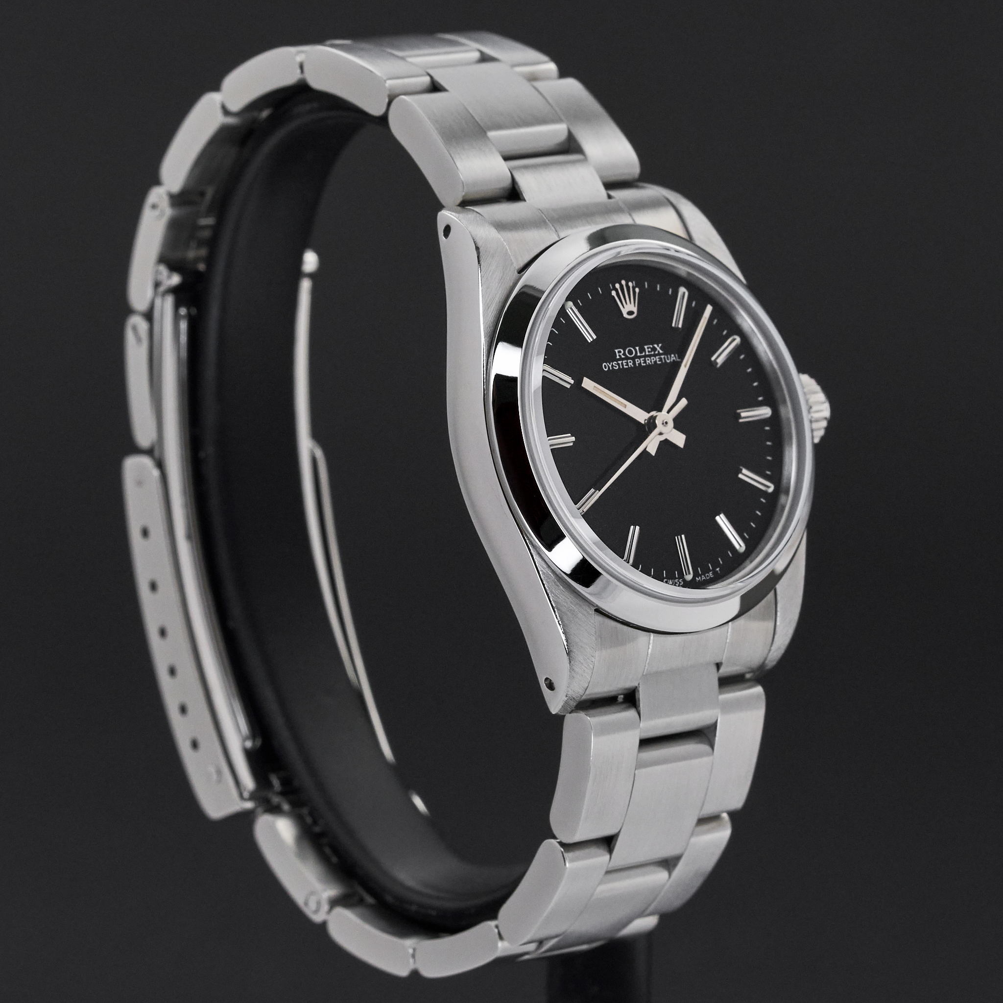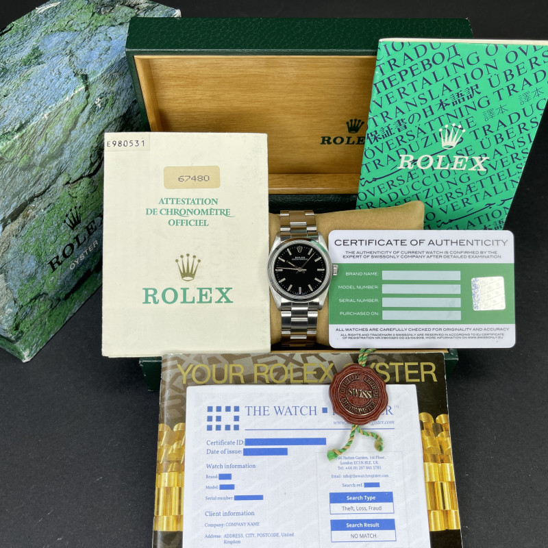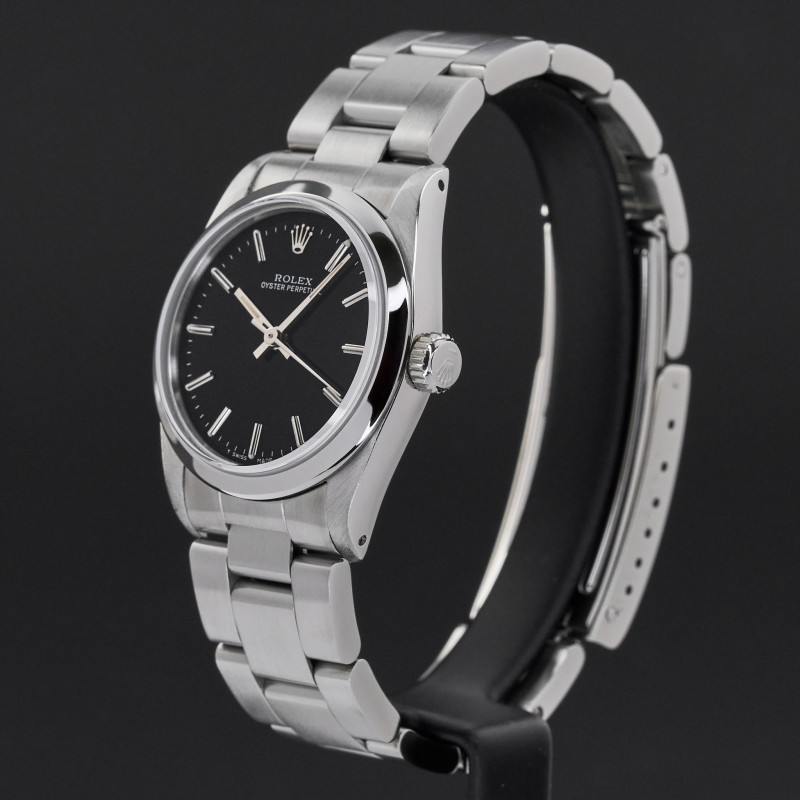 This Rolex Oyster Perpetual 67480 features a Black dial and is crafted from stainless steel, with a production year of 1990.
