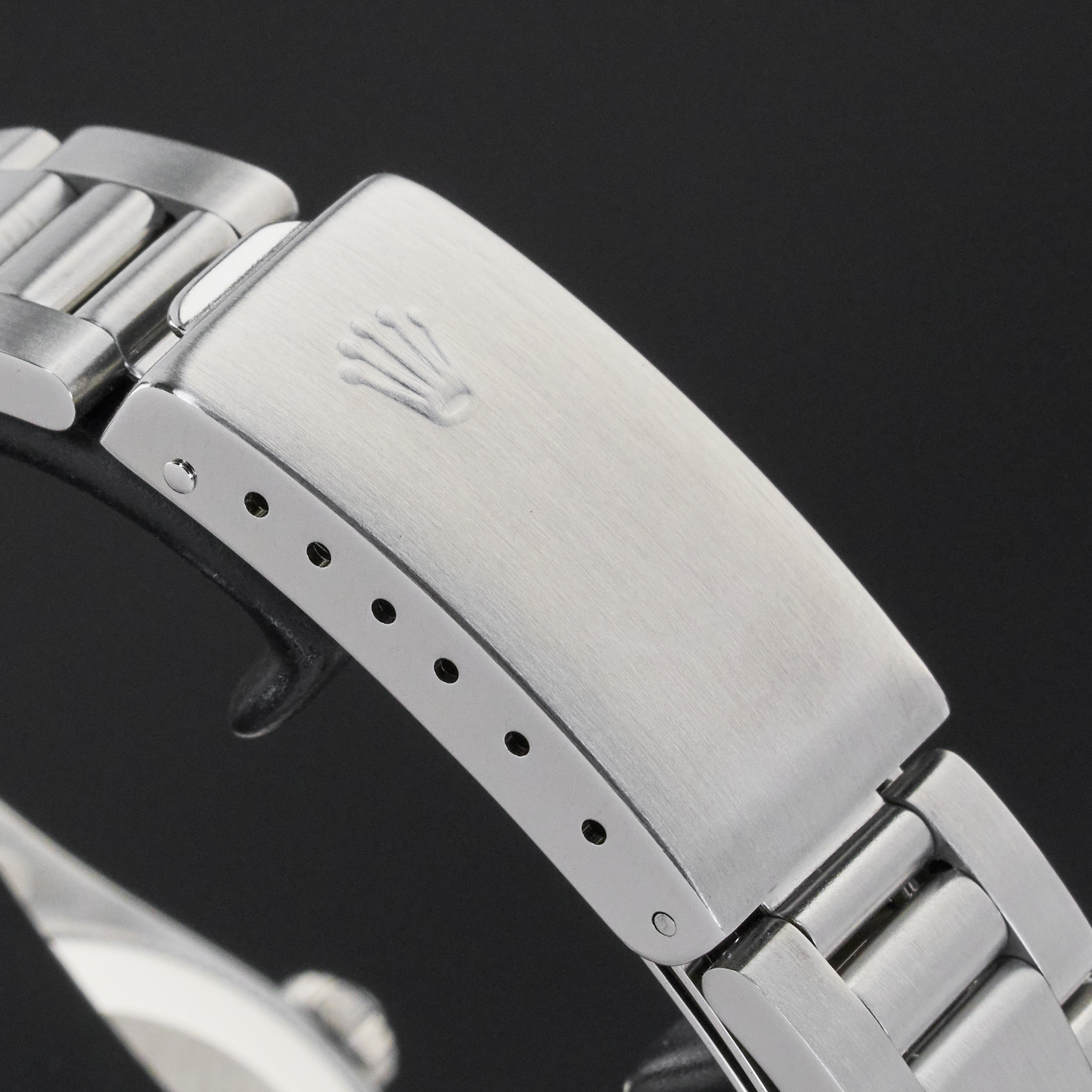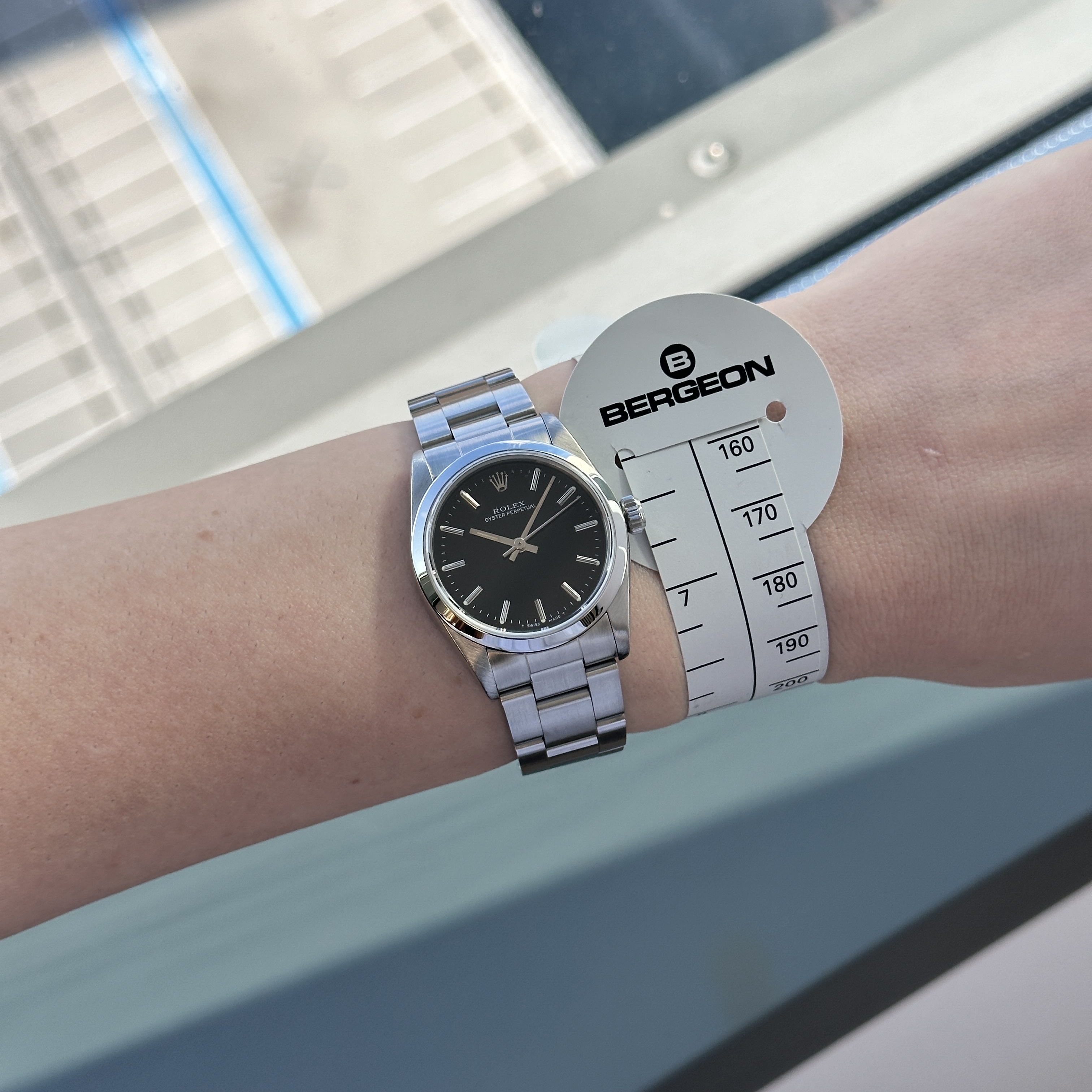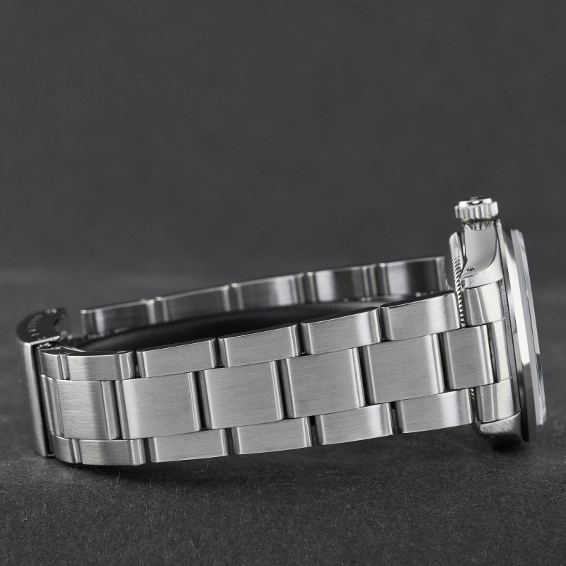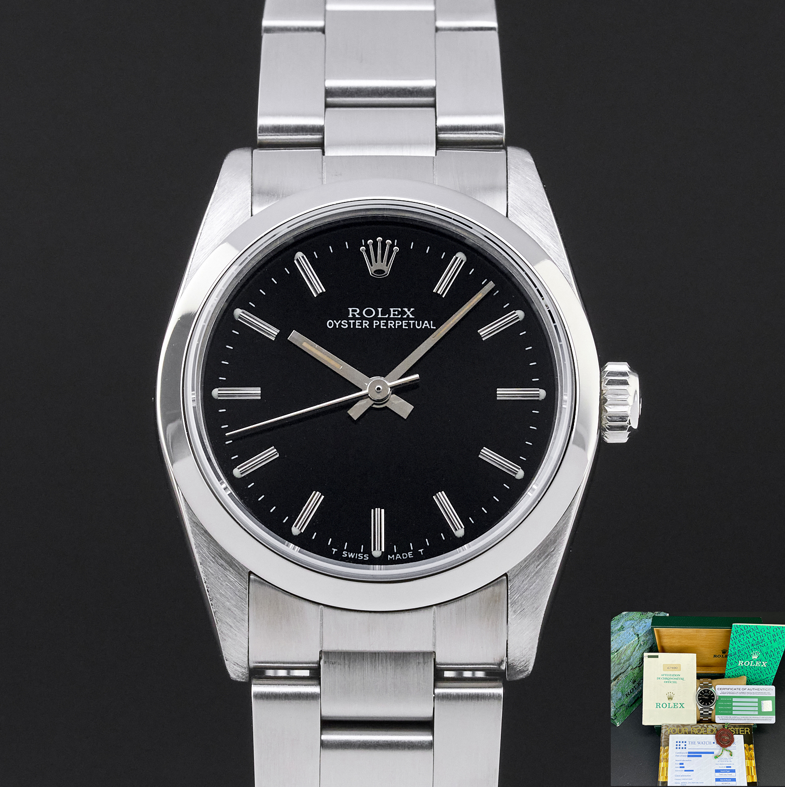 This Rolex Oyster Perpetual 67480 features a Black dial and is crafted from stainless steel, with a production year of 1990.