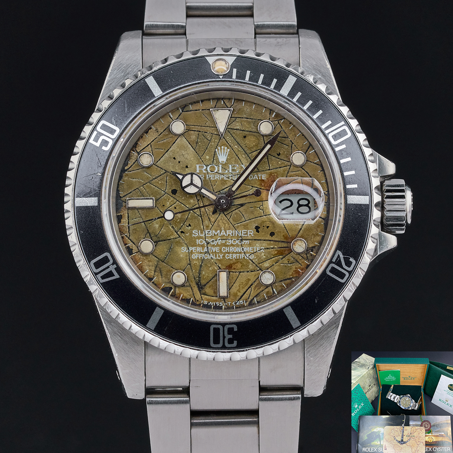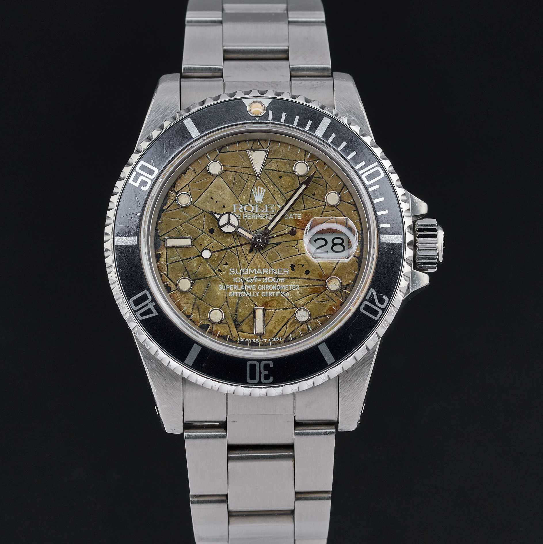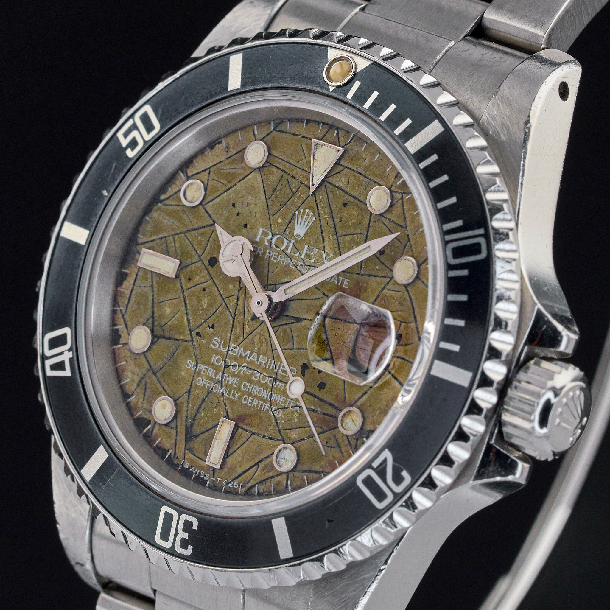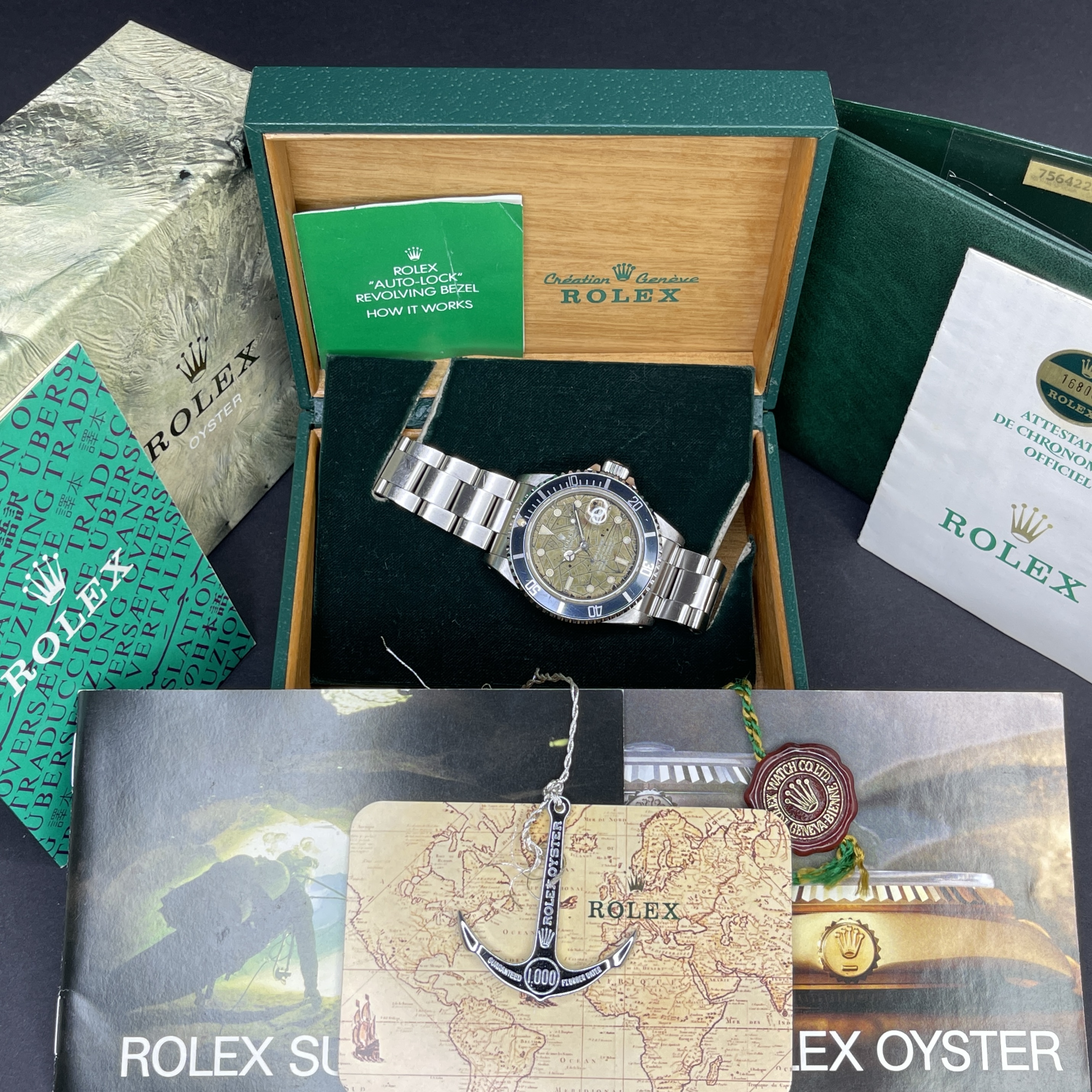 The Rolex 16800 is a notable model in the Submariner series, often revered by collectors for its transitional features and vintage charm. Among its various dial configurations, the unique "tropic snake spider" dial stands out. This rare variant showcases a striking pattern where the dial surface has developed a network of fine cracks over time, resembling a spider's web, often referred to as "spidering." Additionally, the term "tropic" denotes the aged, brownish hue that the dial acquires due to prolonged exposure to sunlight and other environmental factors. This distinctive aging process not only enhances its aesthetic appeal but also makes each piece truly unique, turning the Rolex 16800 with a tropic snake spider dial into a highly coveted treasure for watch enthusiasts and collectors.