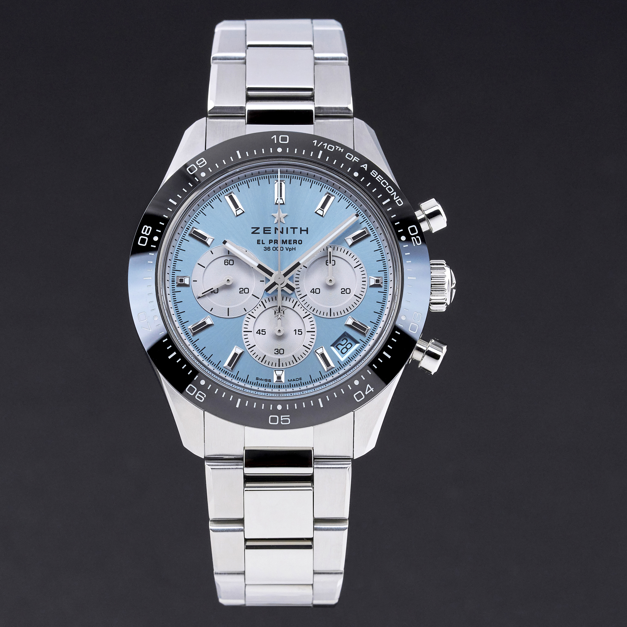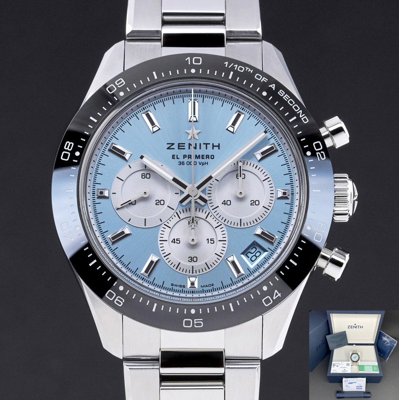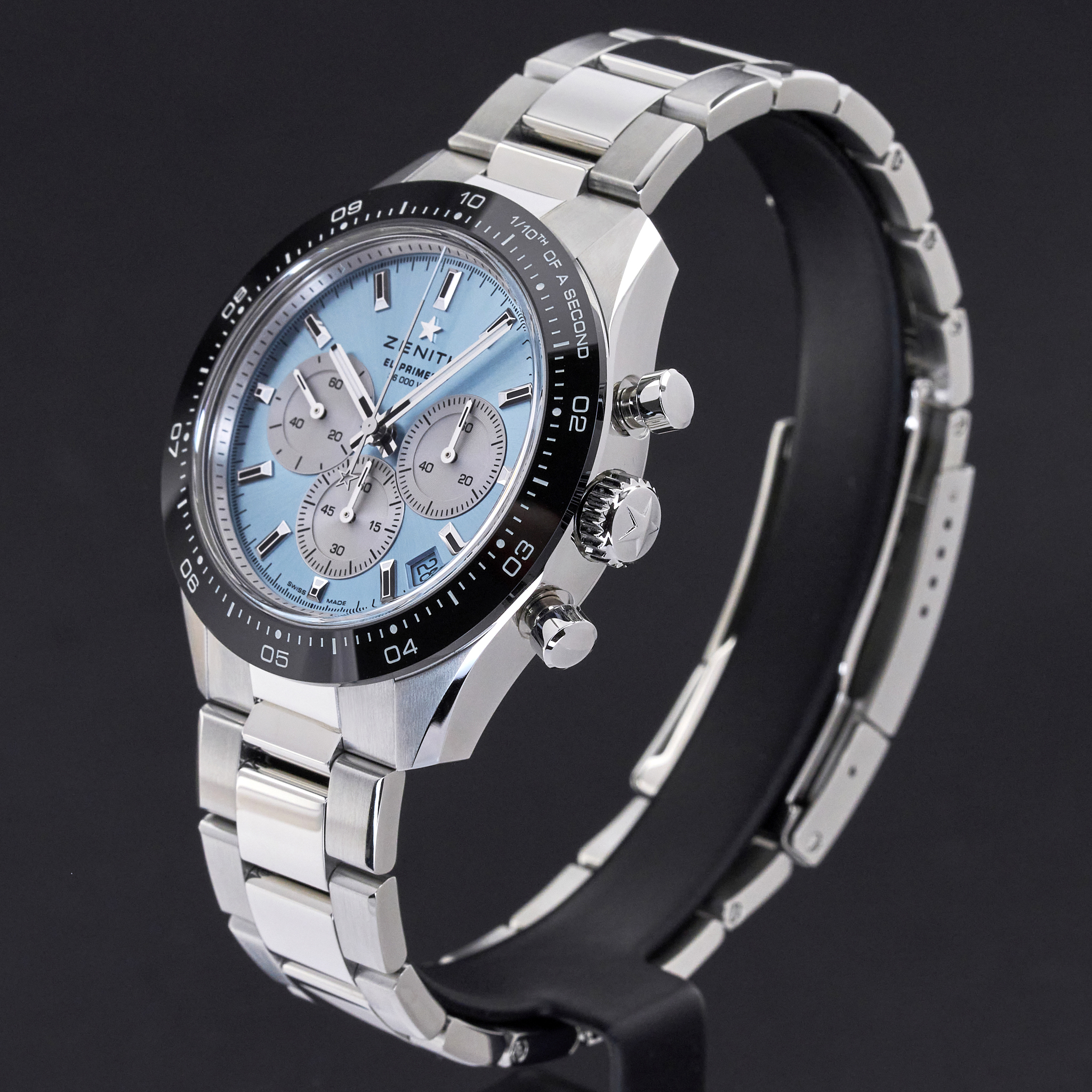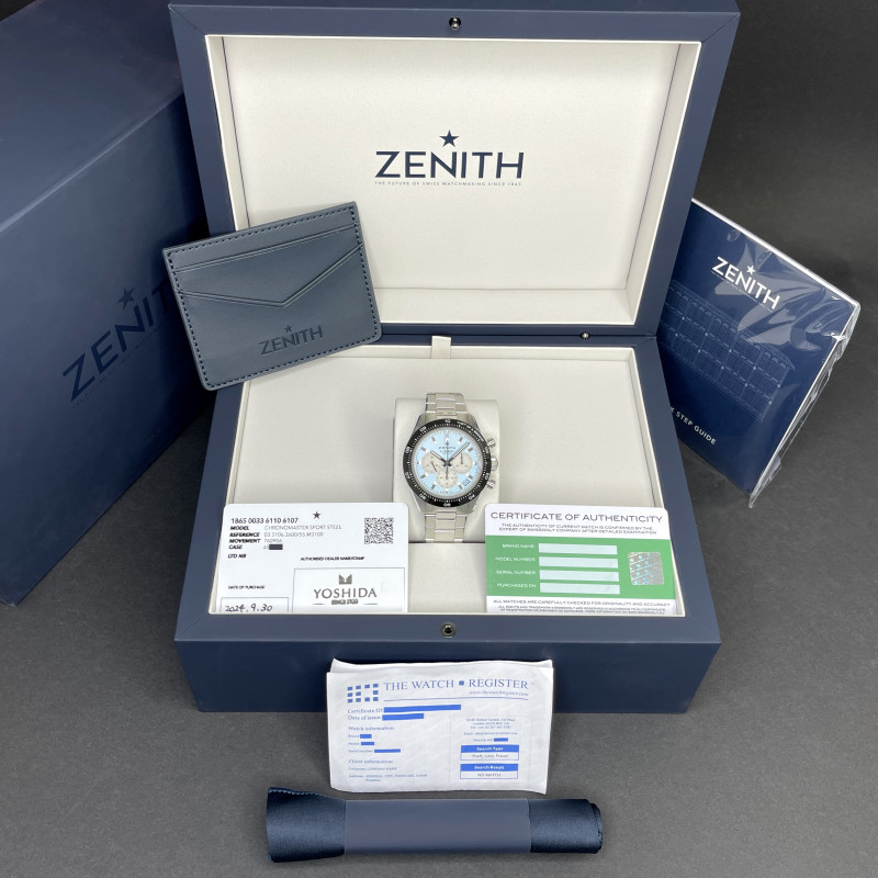 This Zenith Chronomaster Sport Yoshida Special Edition 03.3106.3600/55.M3100 features a Ice blue dial and is crafted from stainless steel, with a production year of 2024.