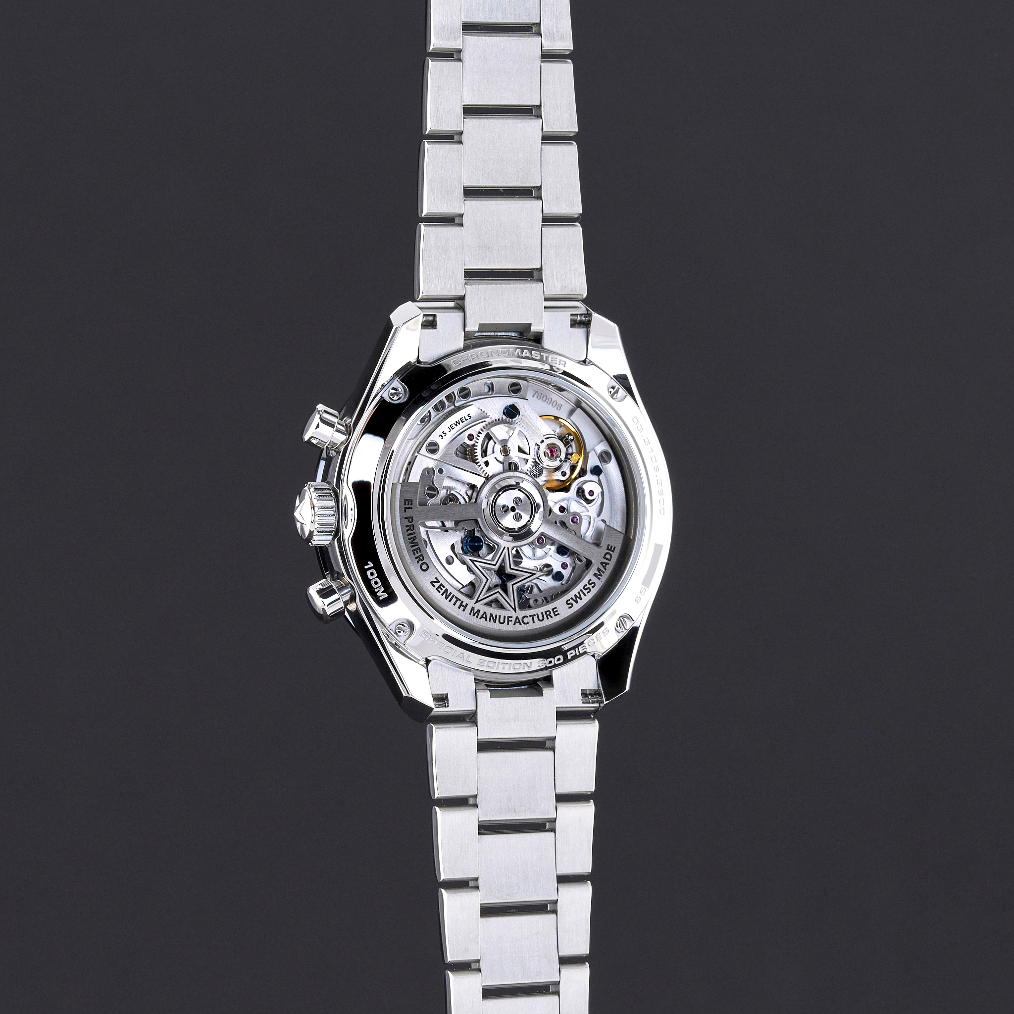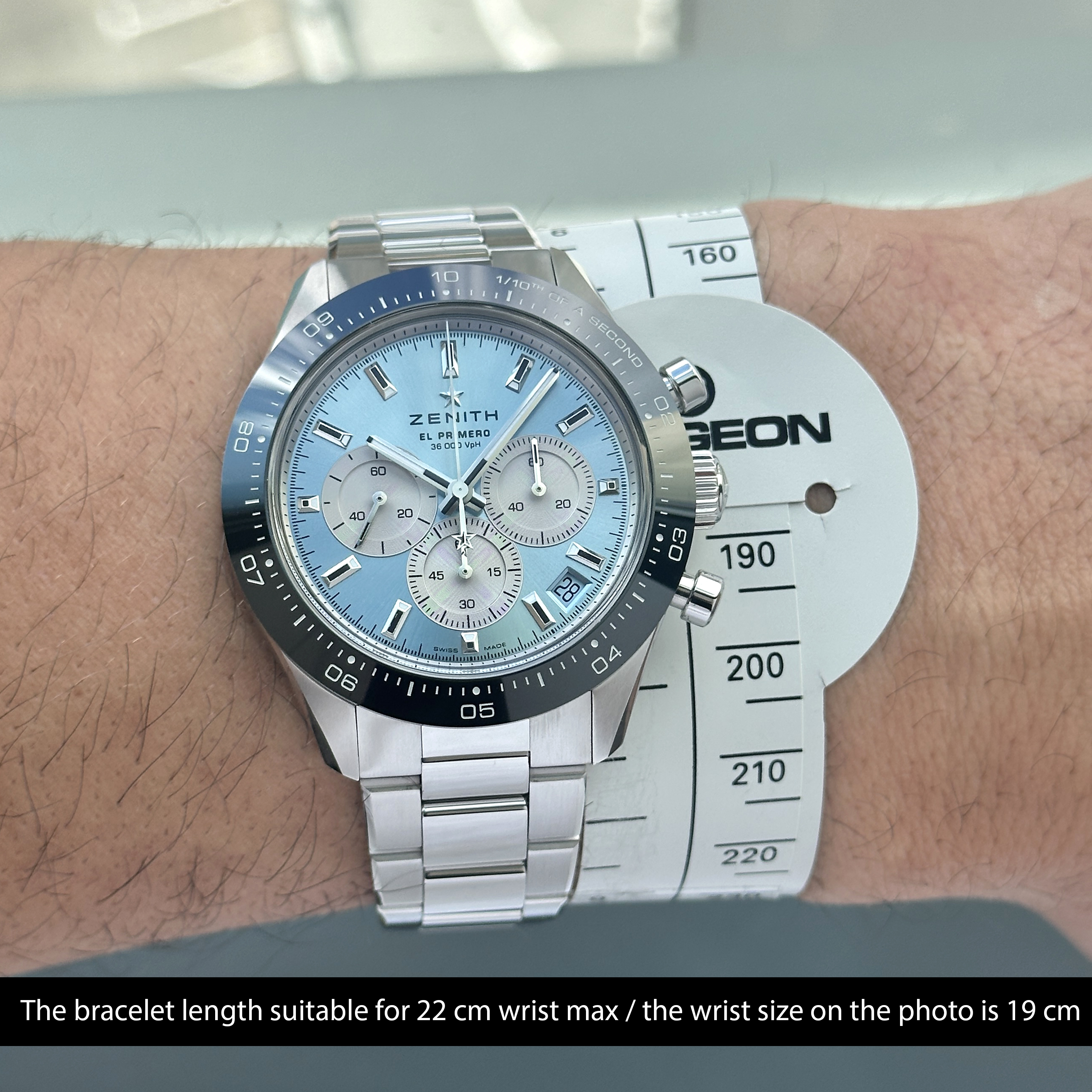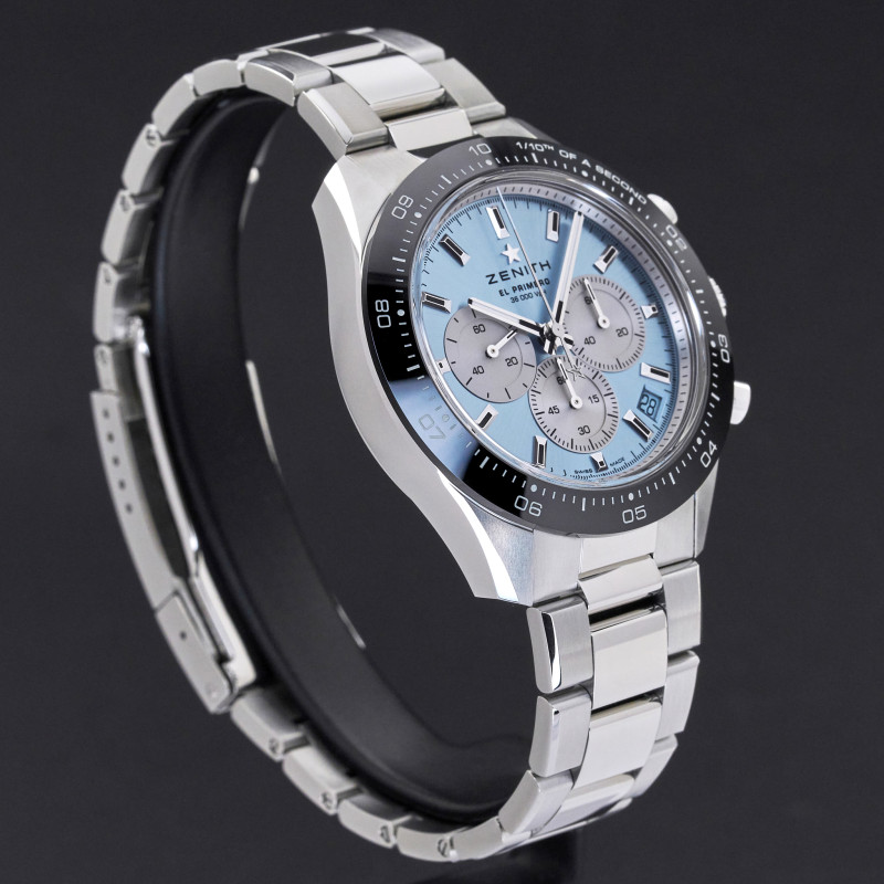 This Zenith Chronomaster Sport Yoshida Special Edition 03.3106.3600/55.M3100 features a Ice blue dial and is crafted from stainless steel, with a production year of 2024.